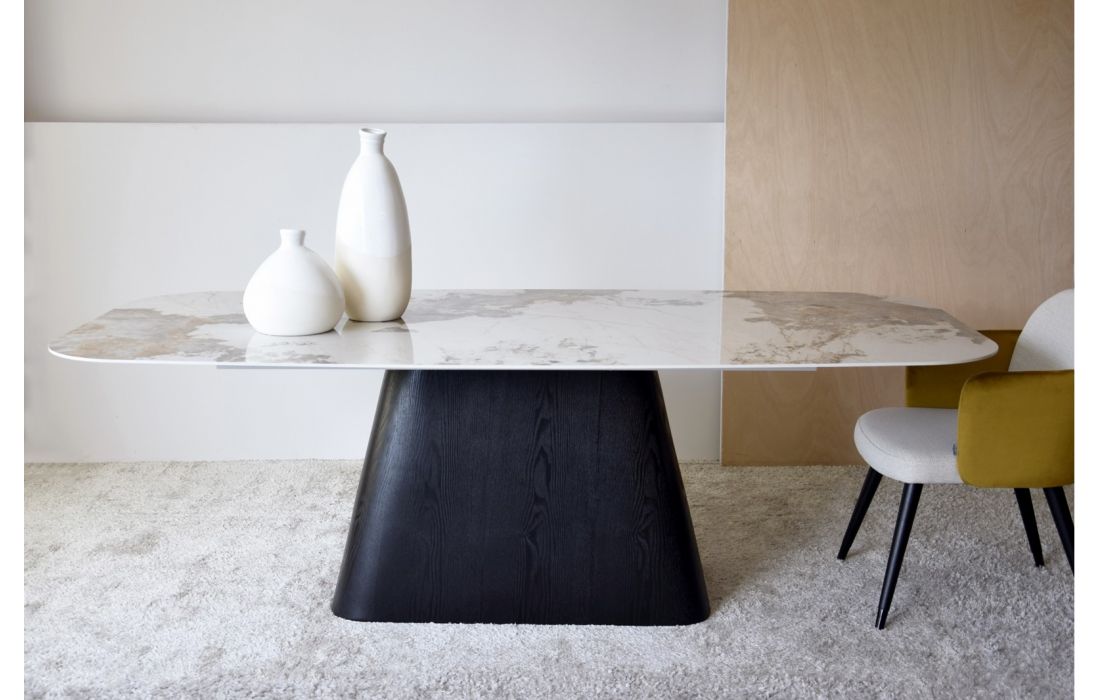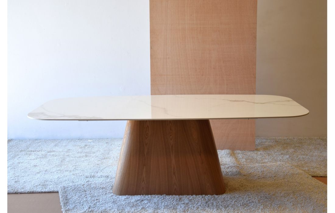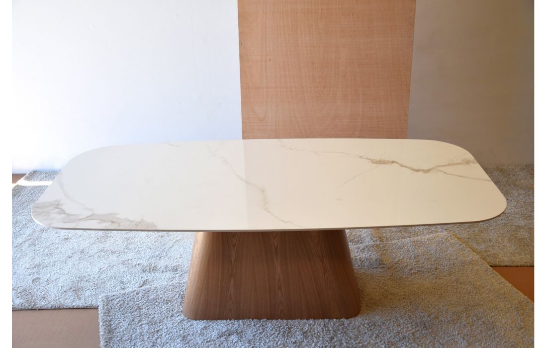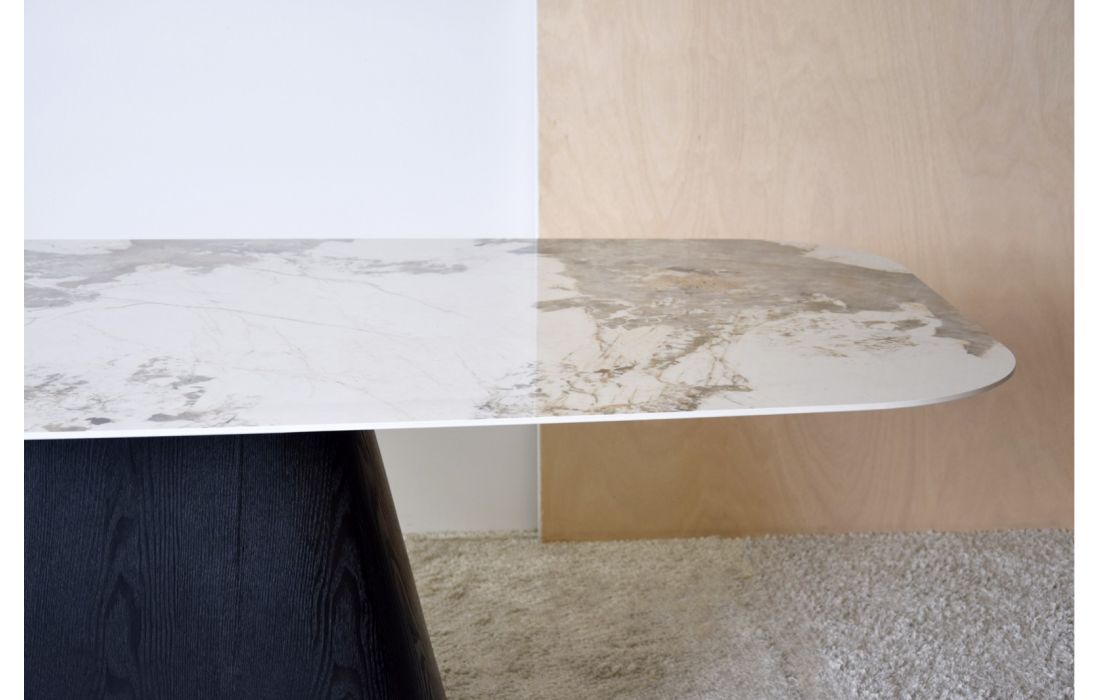 Mesa de jantar com tampo em cerâmica com pés em madeira de freixo.