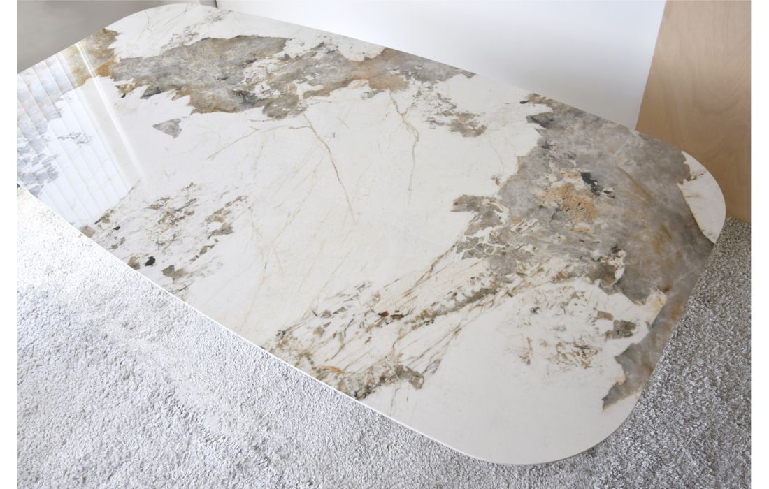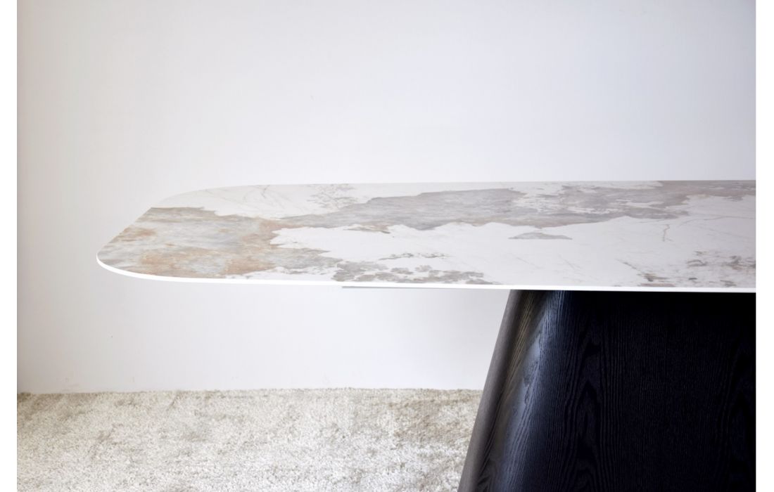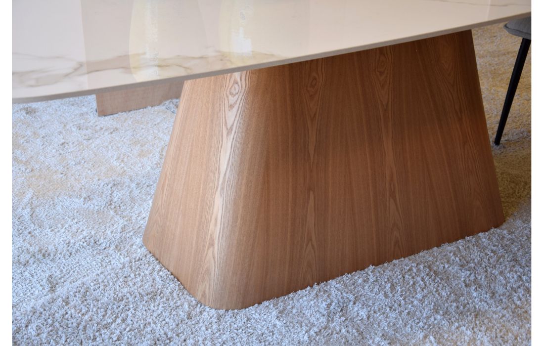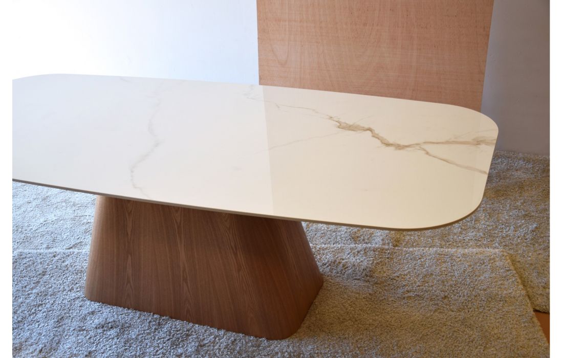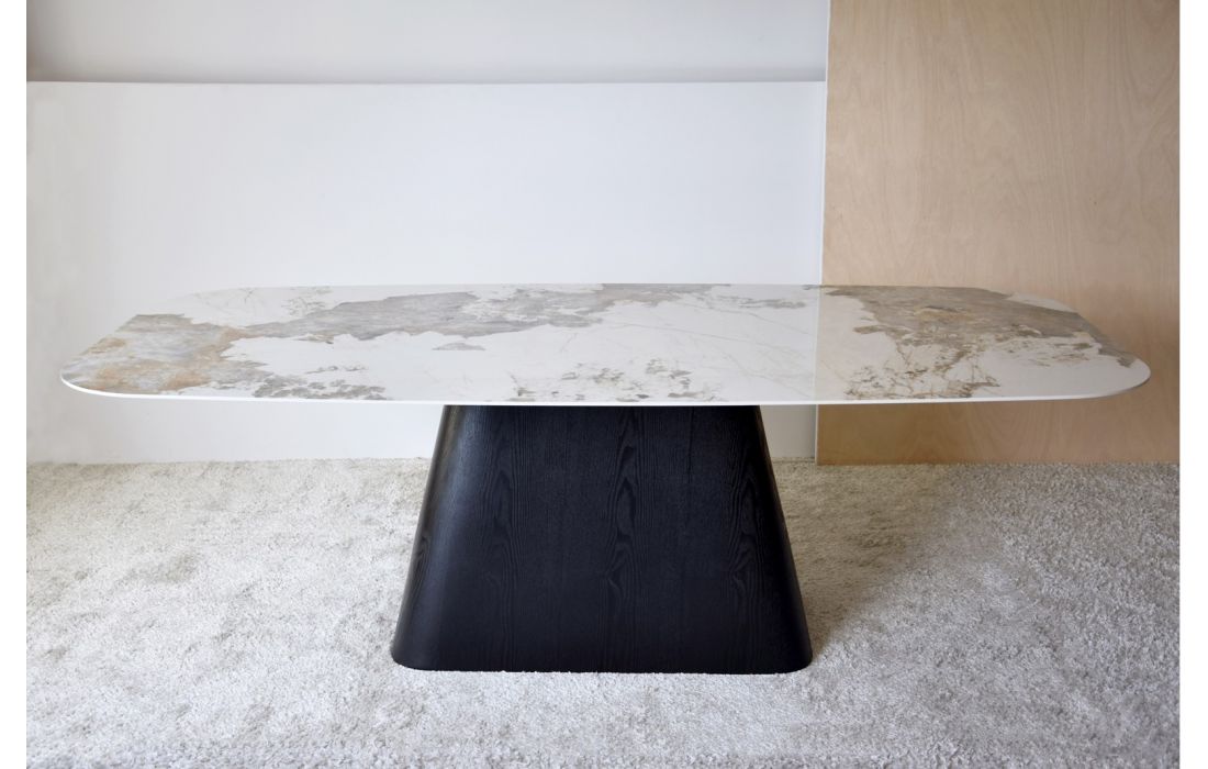 Mesa de jantar com tampo em cerâmica com pés em madeira de freixo.