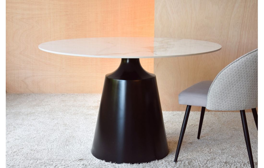 Mesa de jantar redonda com tampo em cerâmica com pés em madeira.