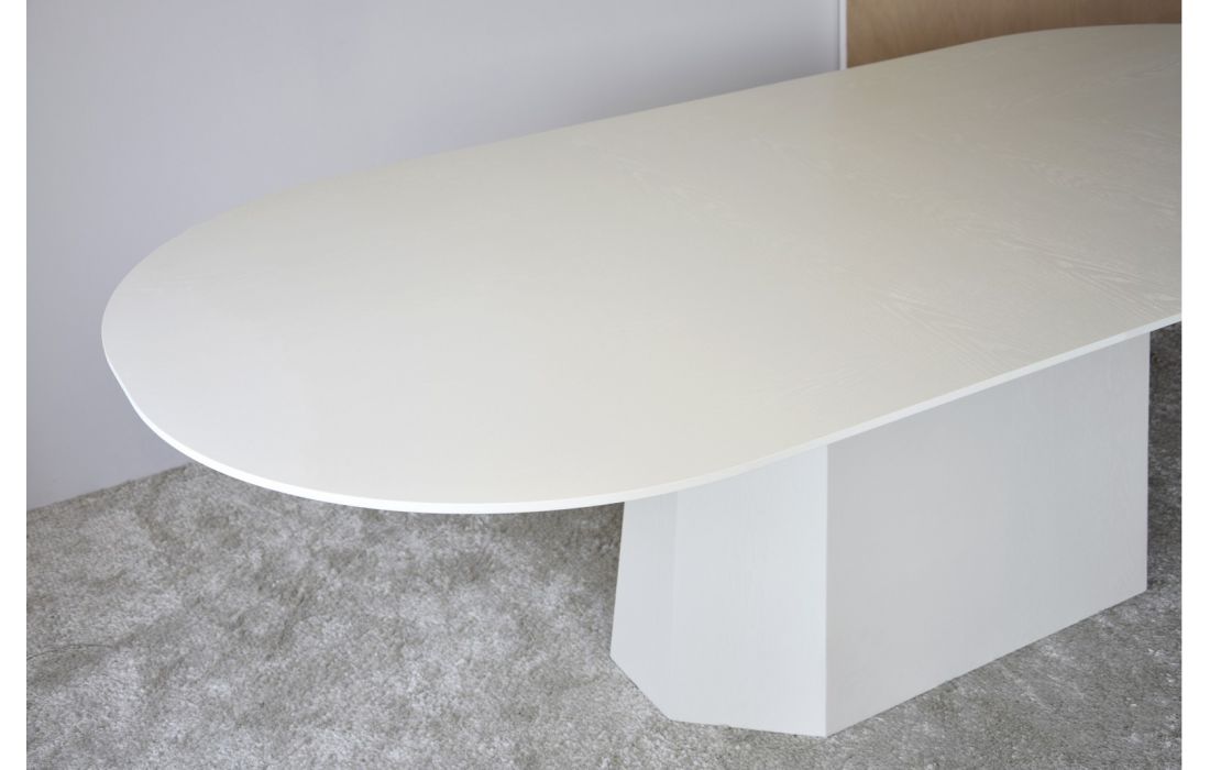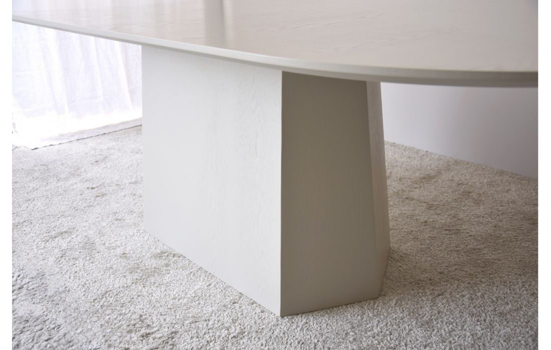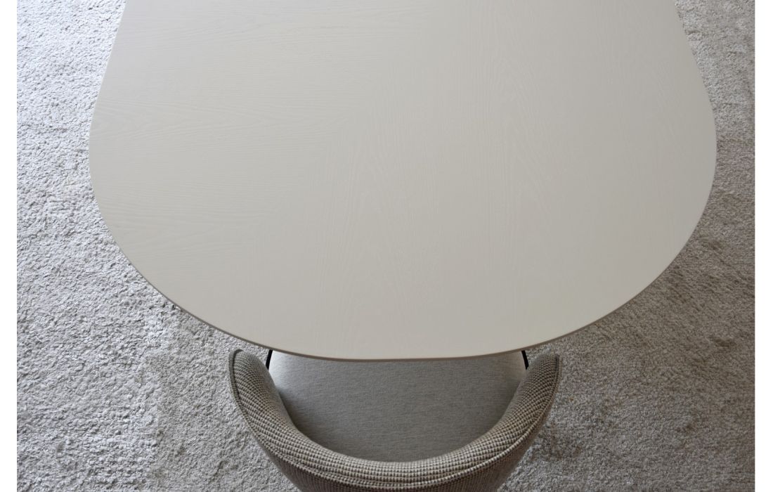 Mesa de jantar com tampo em cerâmica com pés em madeira de freixo.