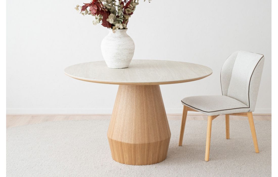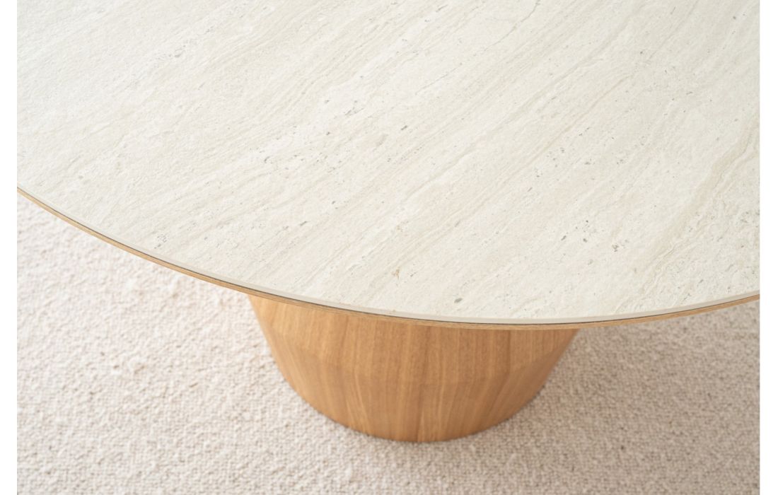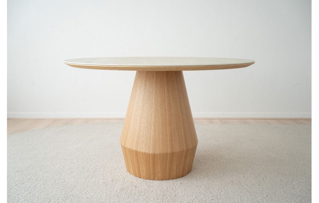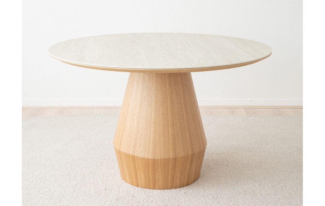 Mesa de jantar em cerâmica na cor cinza claro fosco e a sua base feita em folheado de madeira de freixo naturalDestinatário :