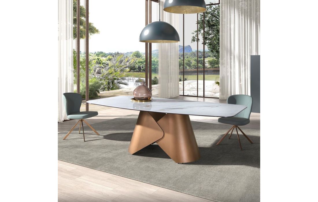 Mesa de jantar moderna com tampo fixo em mármore com acabamento brilhante e as suas pernas em aço inoxidávelDestinatário :