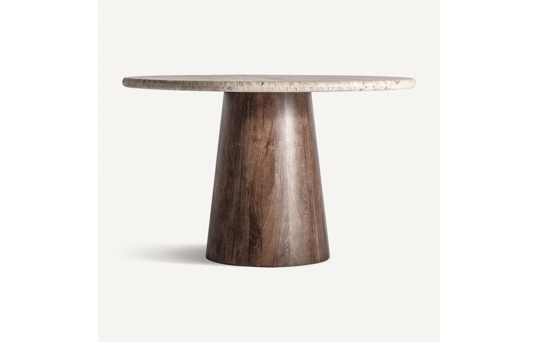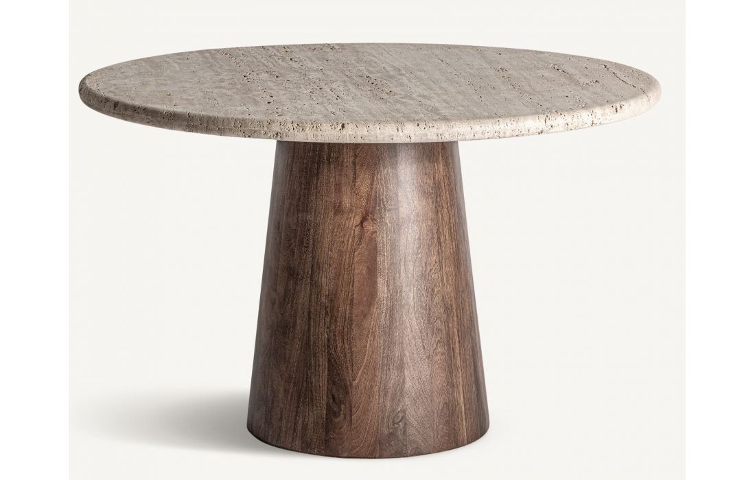 A MESA DE JANTAR VARZI combina travertino e madeira de mango em um design art déco elegante e escultórico.