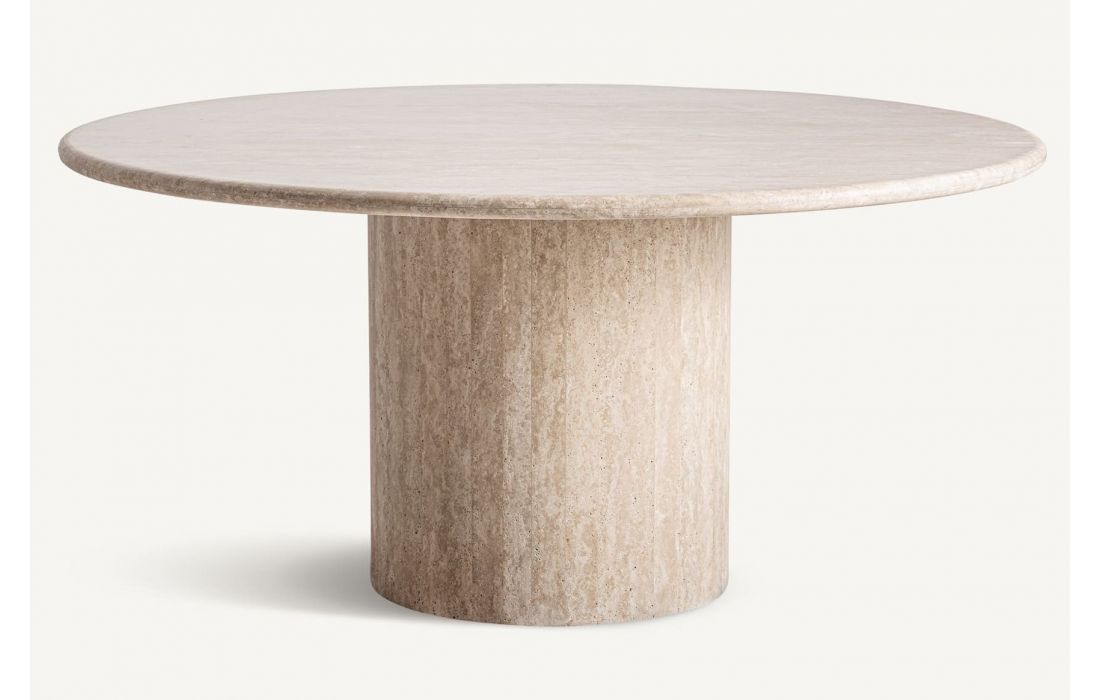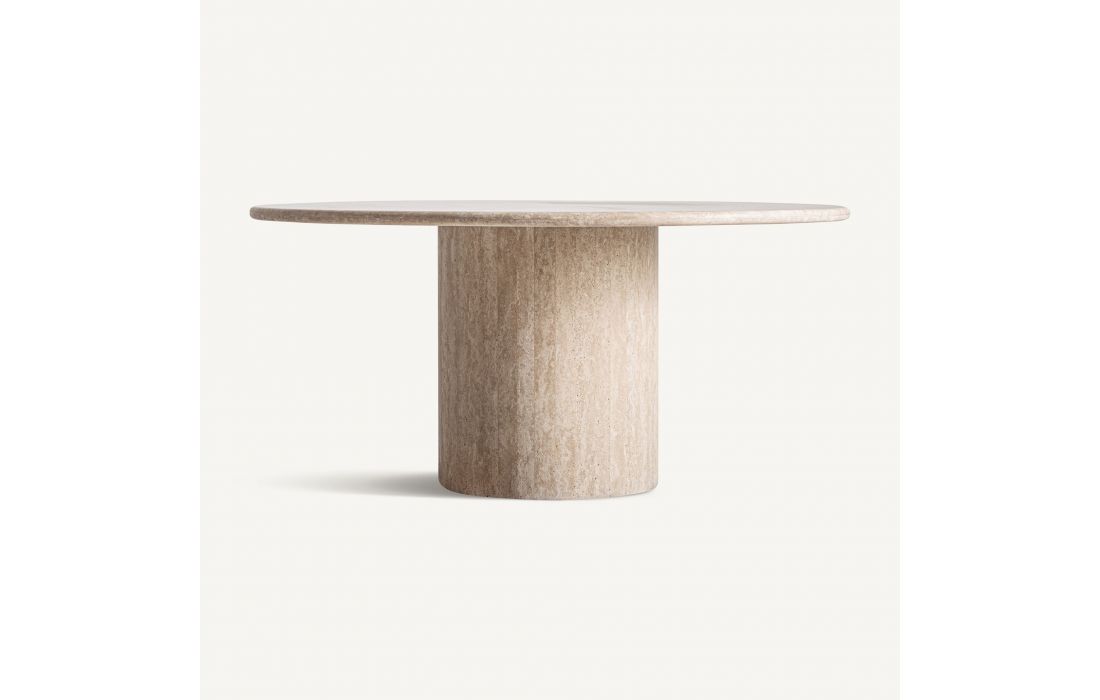 A MESA DE JANTAR THIENNES, feita de travertino, com um design puro e arquitetônico que traz naturalidade, solidez e um estilo impecável em espaços contemporâneos.