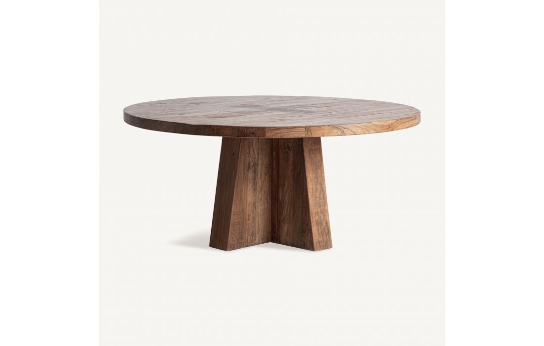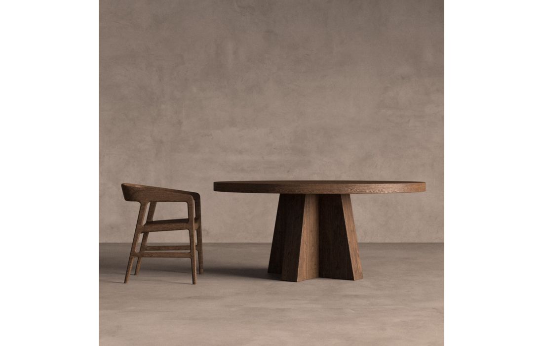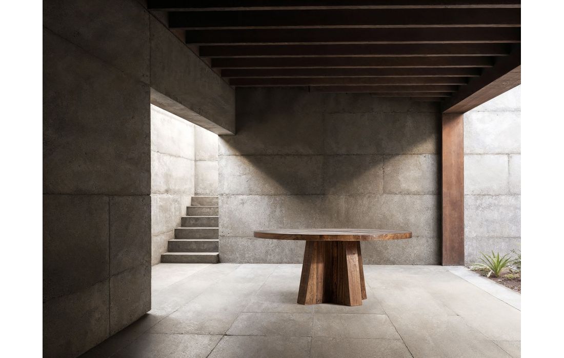 A MESA DE JANTAR REDONDA BRUTALISTA, projetada, é uma reminiscência de um altar cerimonial. Sua posição cruzada segura um enorme envelope que parece flutuar, convidando ao diálogo e à conexão.