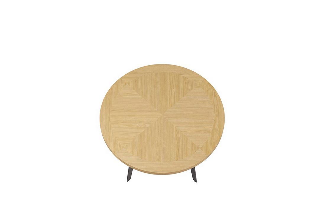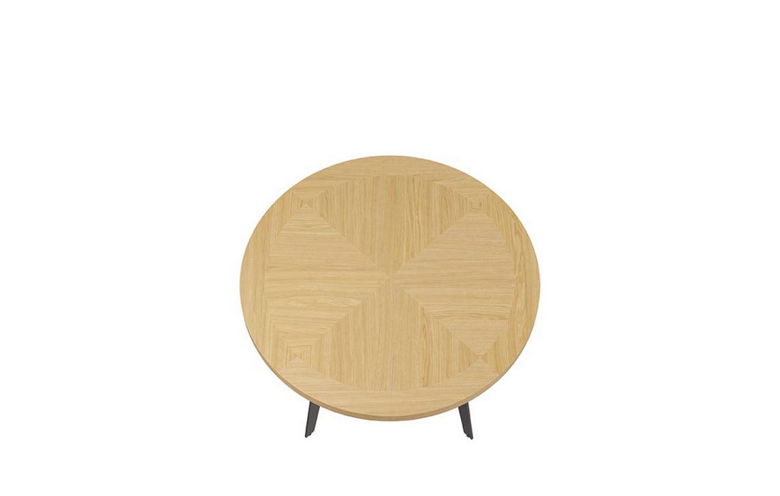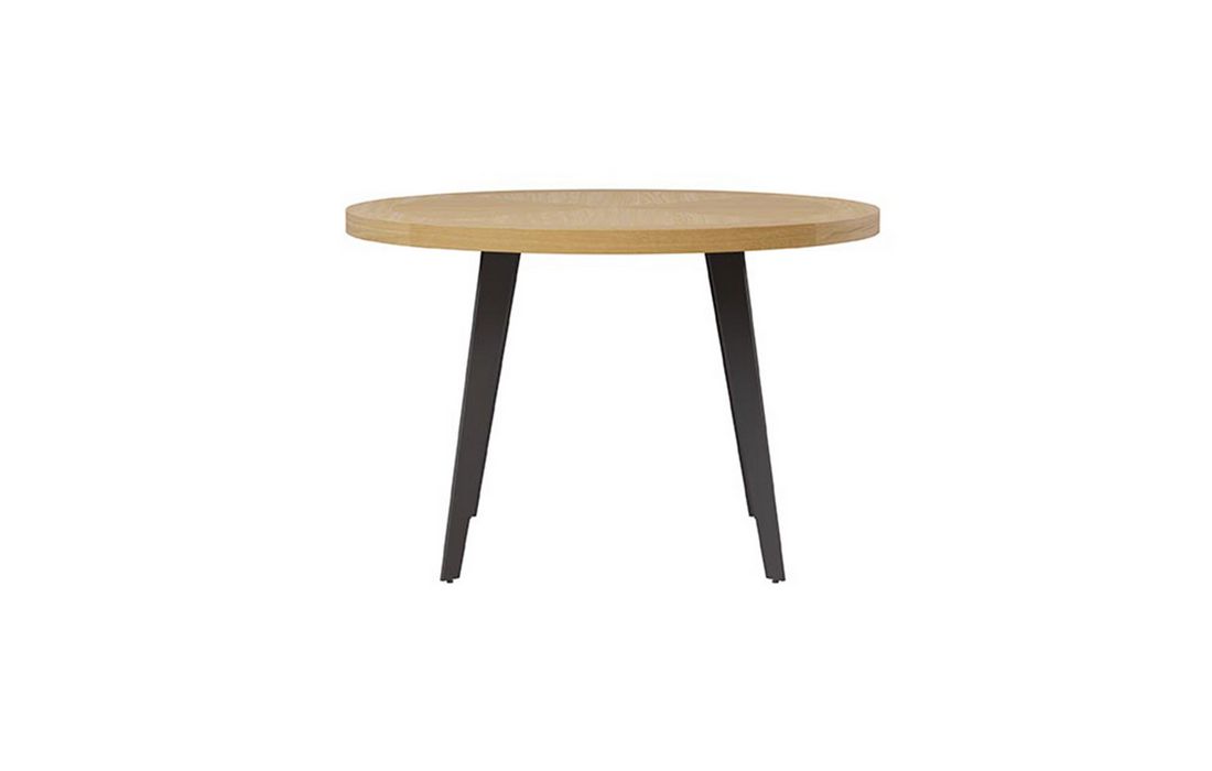 Esta mesa destaca-se pela elegante combinação de materiais e formas. O seu tampo redondo, é folheado a carvalho, conferindo uma sensação de solidez e calor natural que assenta numa base de metal preto.