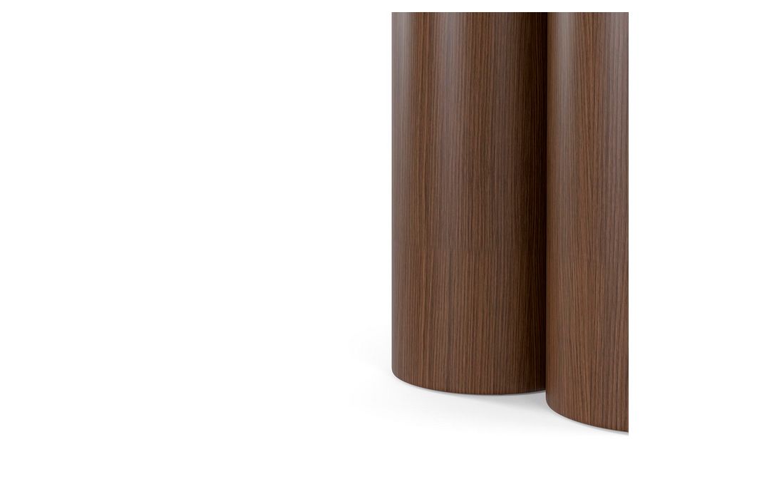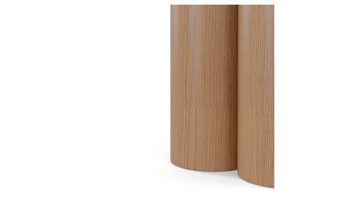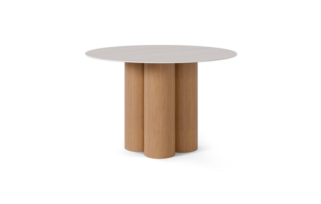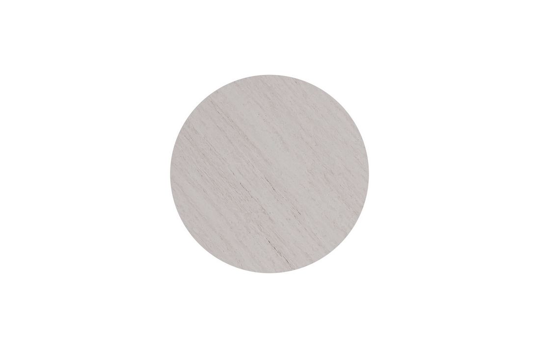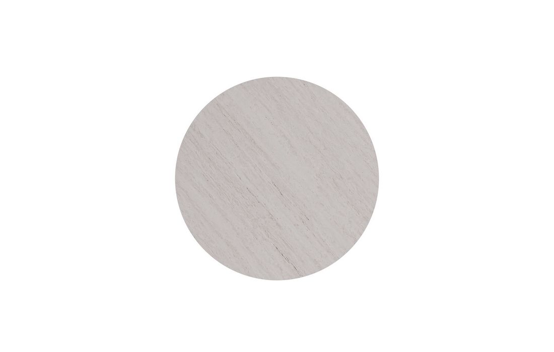 Esta destaca-se pelo seu design escultural e sofisticado. O tampo redondo em porcelanato com efeito travertino confere uma estética elegante e intemporal, ideal para espaços modernos ou contemporâneos.