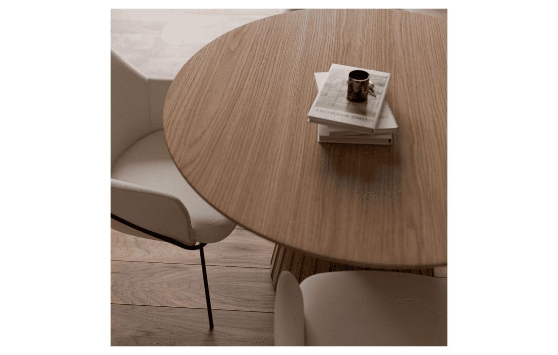 Esta mesa, folheada a carvalho, destaca-se pelo seu design único e distinto, capaz de transformar qualquer espaço em que esteja inserida, ideal tanto para ambientes modernos como rústicos.