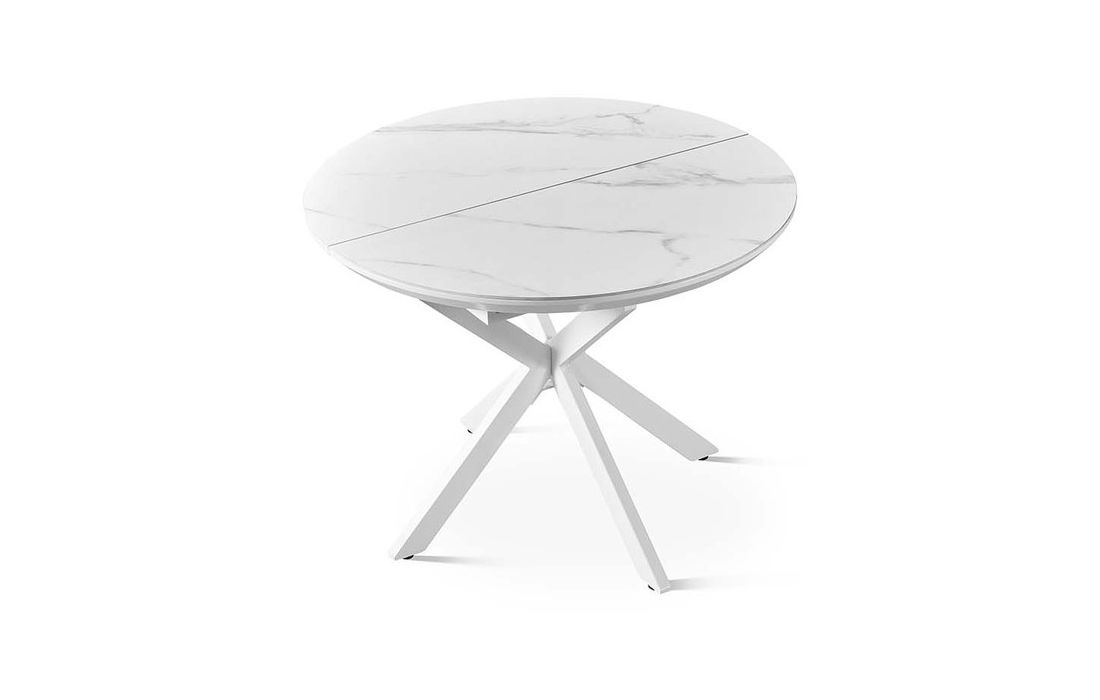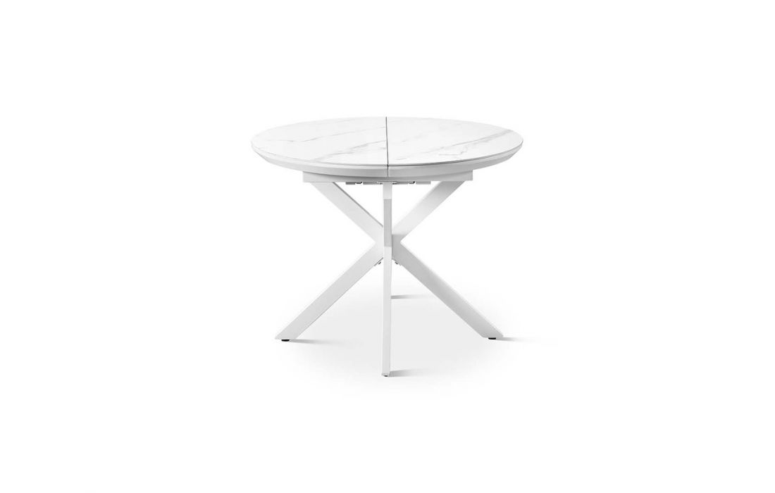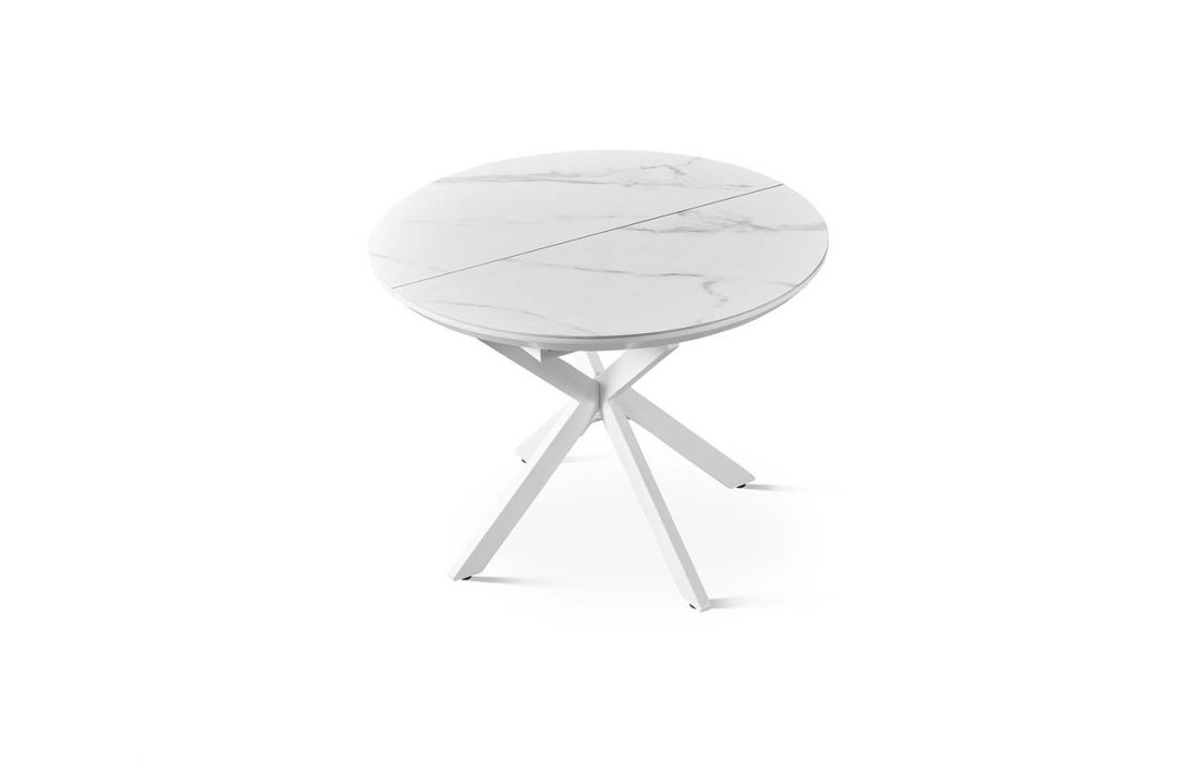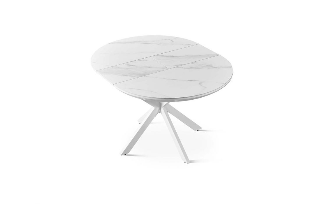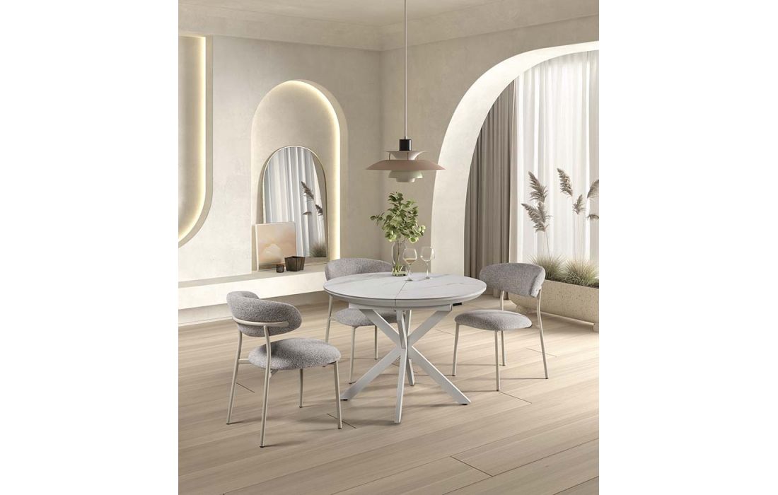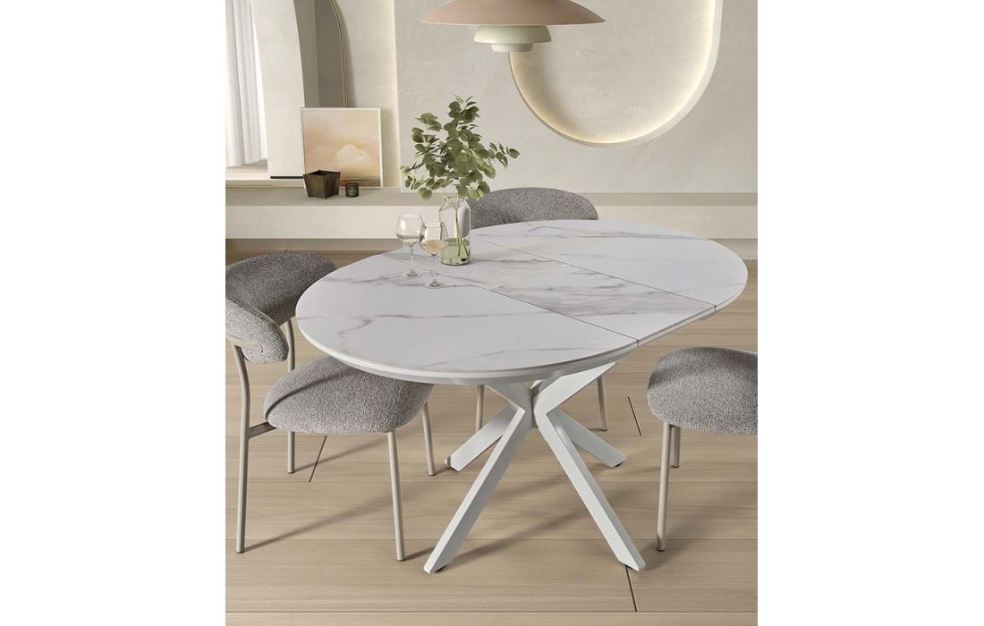 Mesa redonda extensível com tampo em porcelana, resistente e adequada para o uso diário. O seu design moderno combina funcionalidade e elegância.