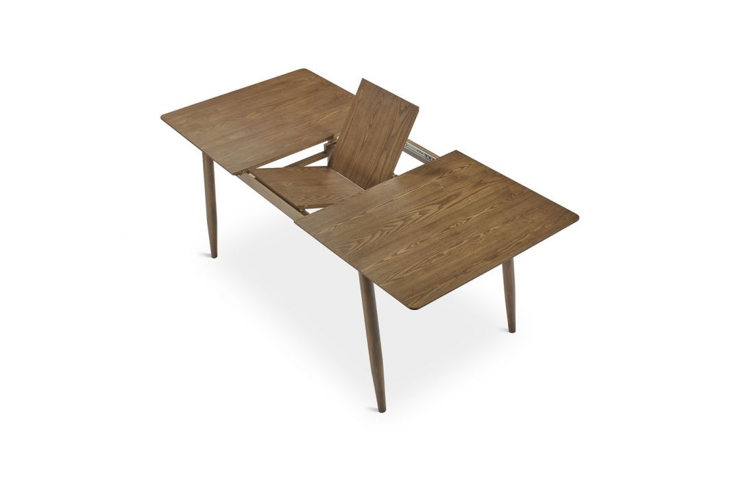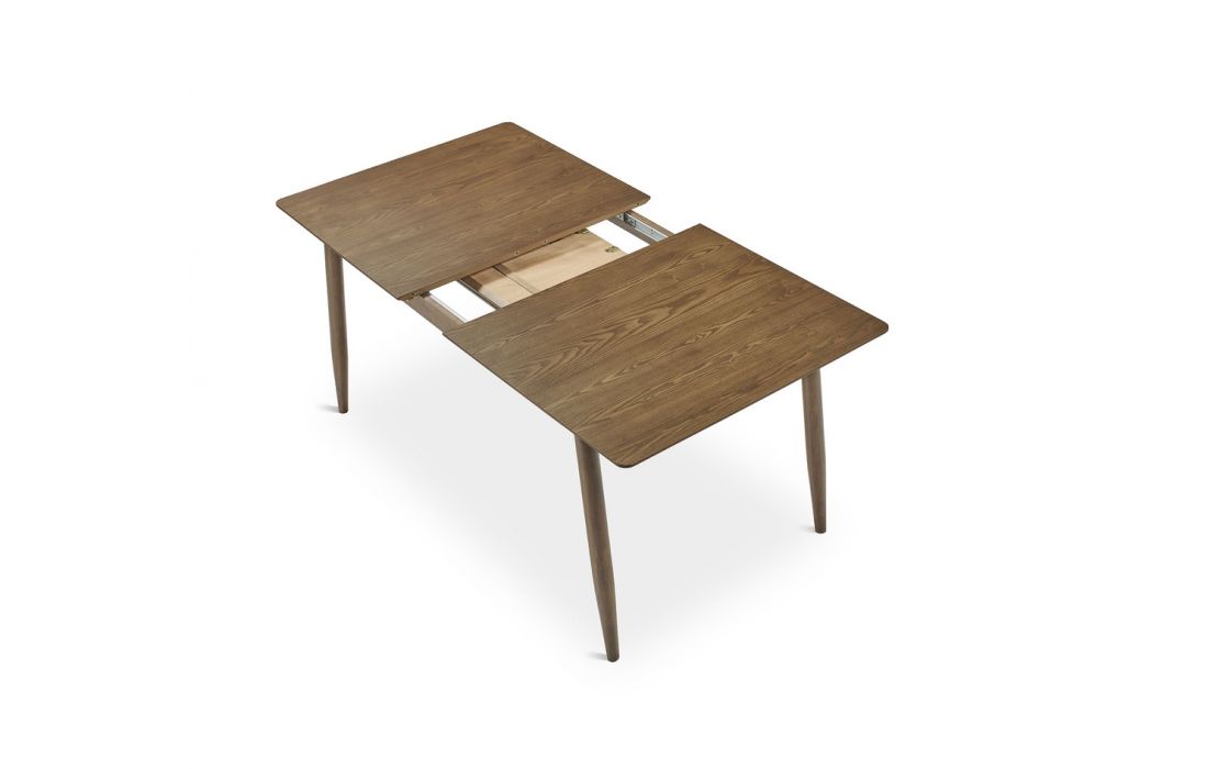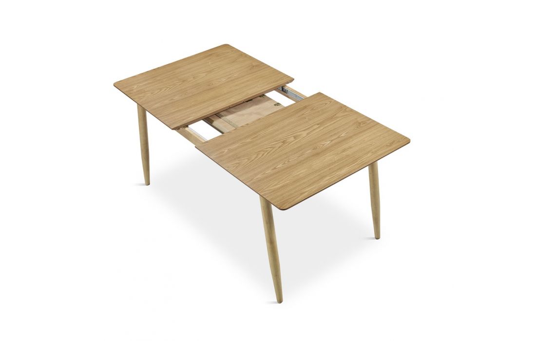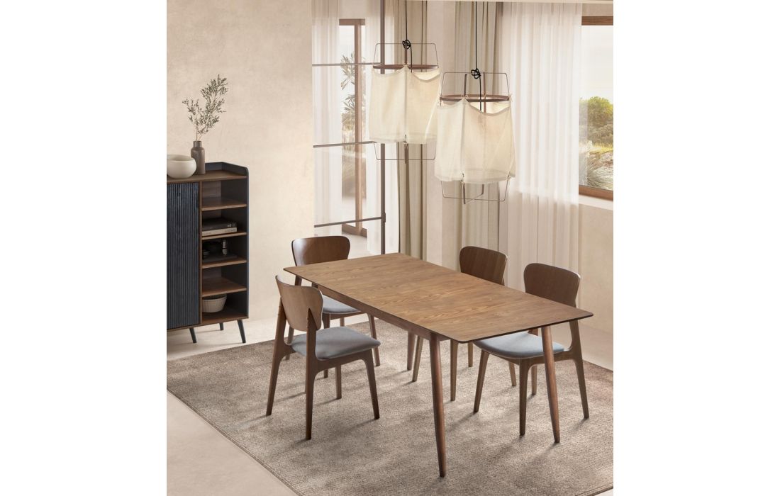 Mesa extensível em madeira, resistente e ideal para o uso diário. O seu design simples e funcional adapta-se facilmente a diferentes espaços. Disponível com acabamento em nogueira ou carvalho.
