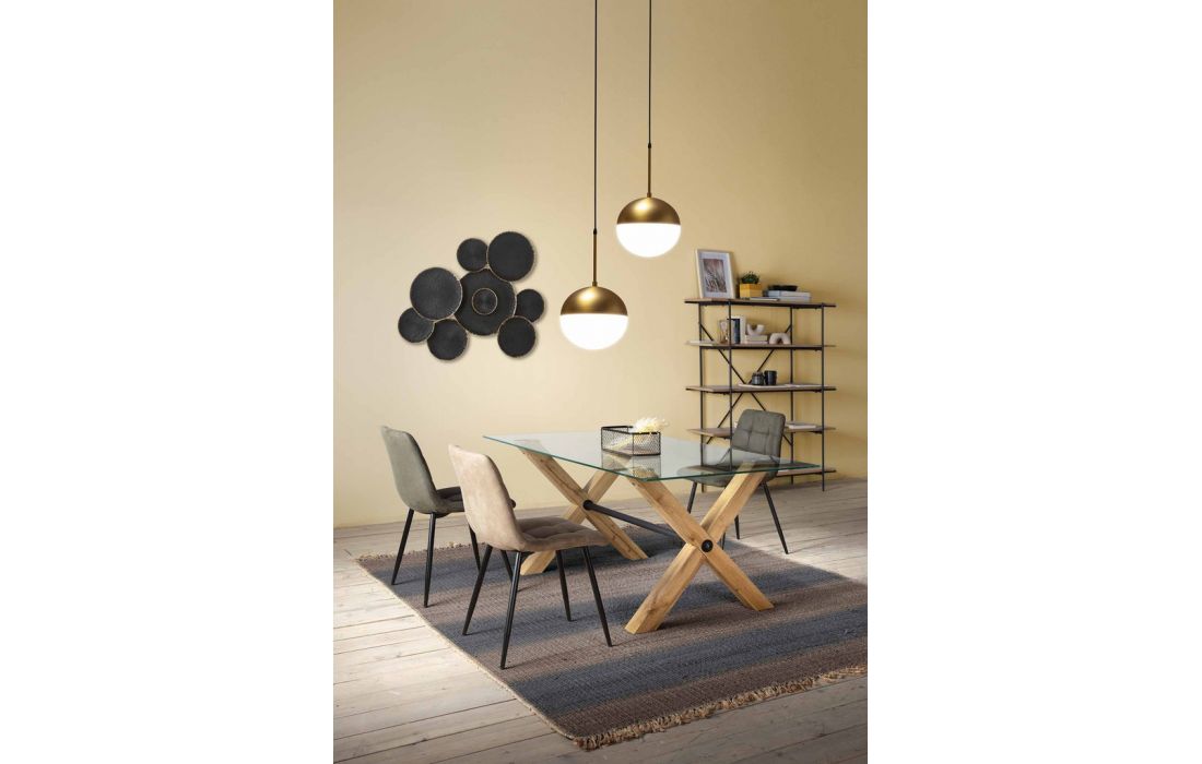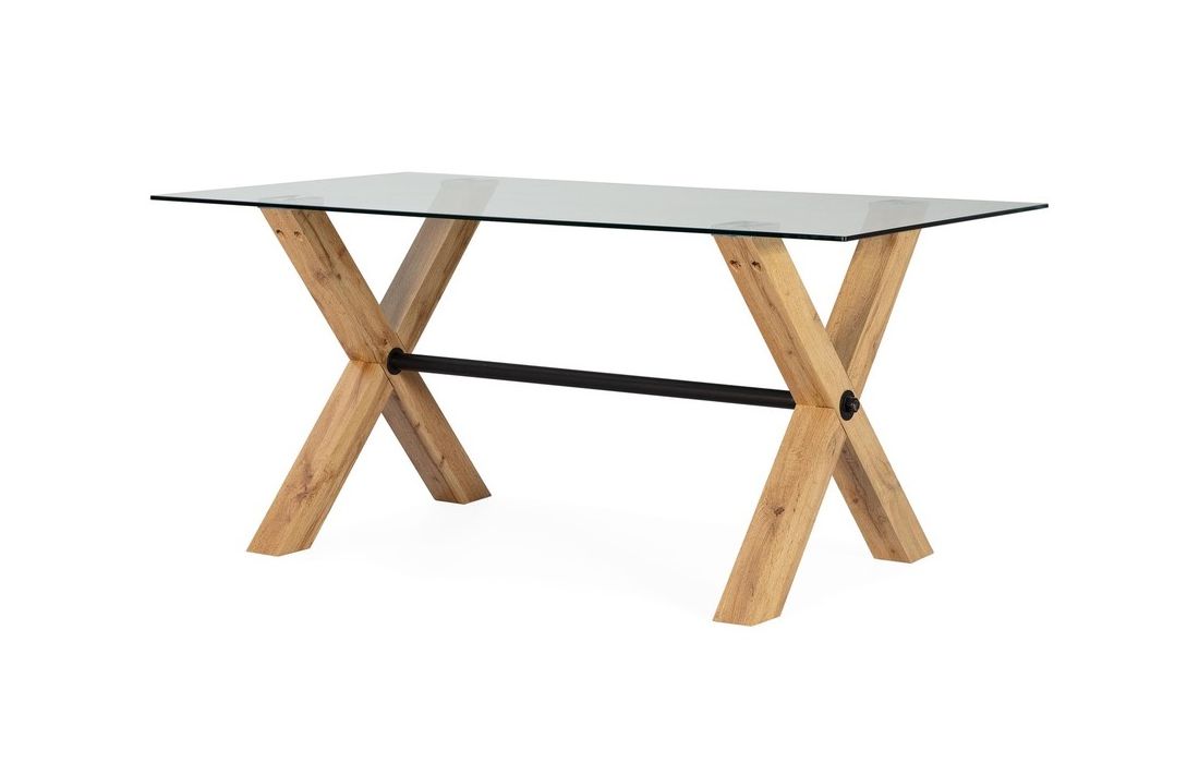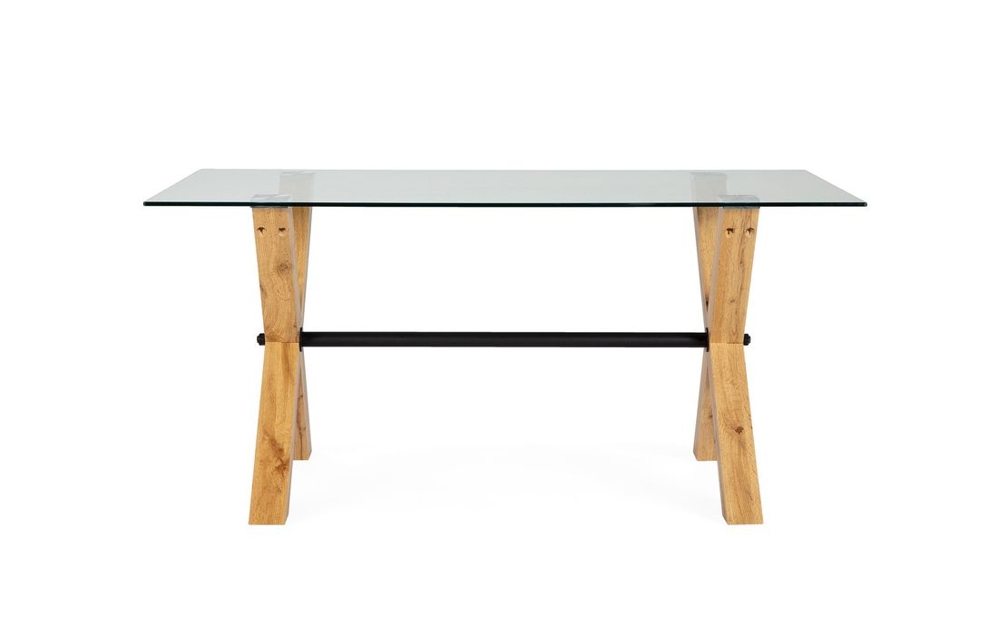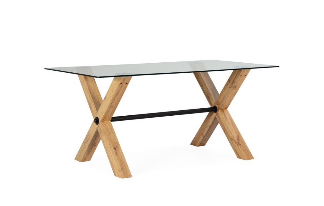 Mesa com tampo em vidro e pés em madeira com acabamento a carvalho, combinando elegância e um design moderno.