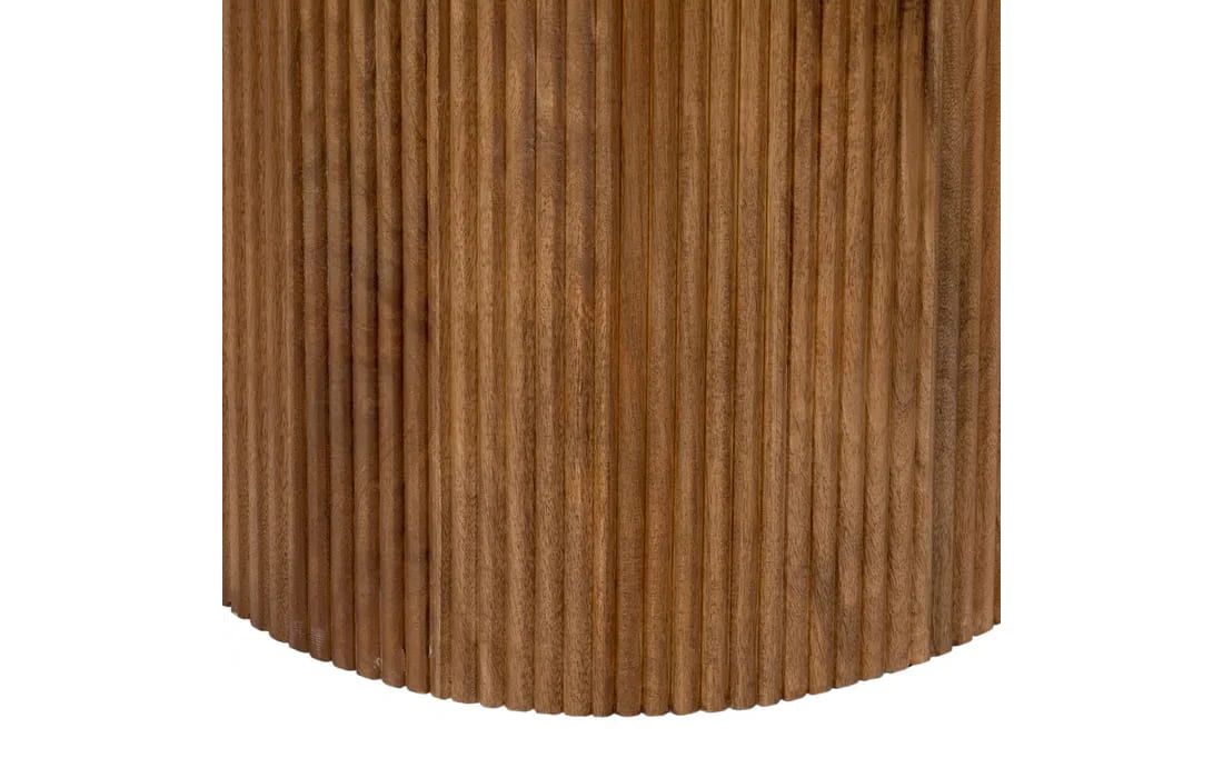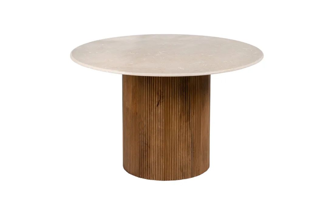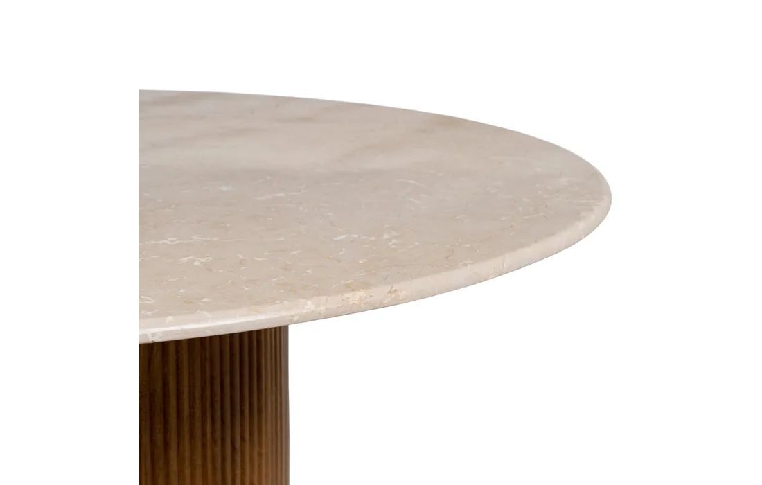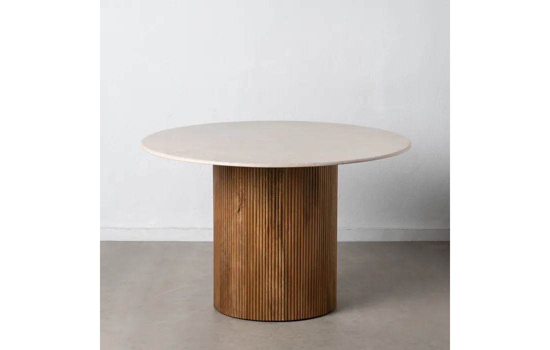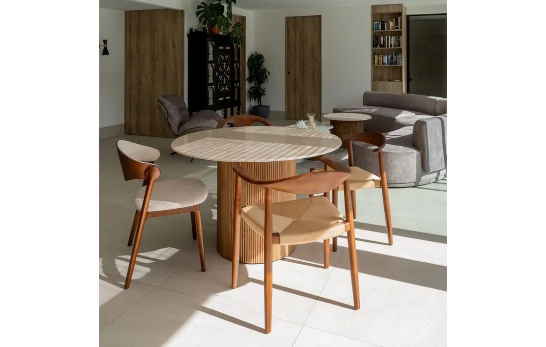Esta mesa de jantar destaca-se pela fusão elegante entre a madeira de mago e mármore. A base cilíndrica com acabamento ripado confere textura e carácter, enquanto o tampo suave e minimalista cria um contraste harmonioso. Uma peça que alia robustez e leveza visual.
