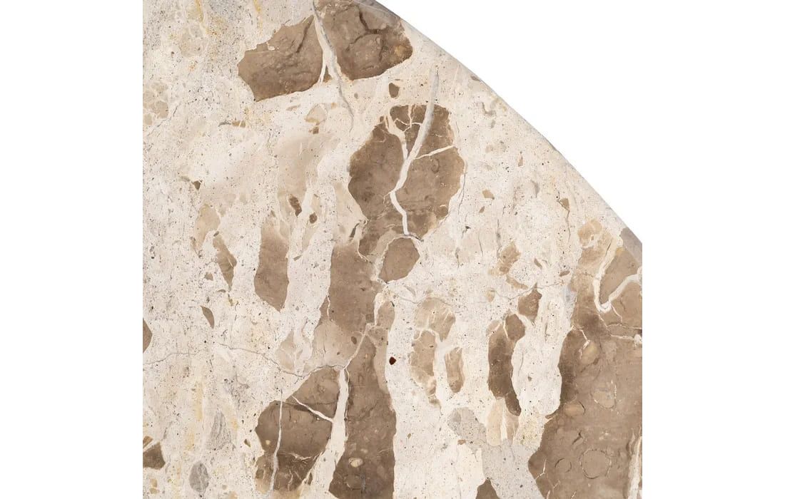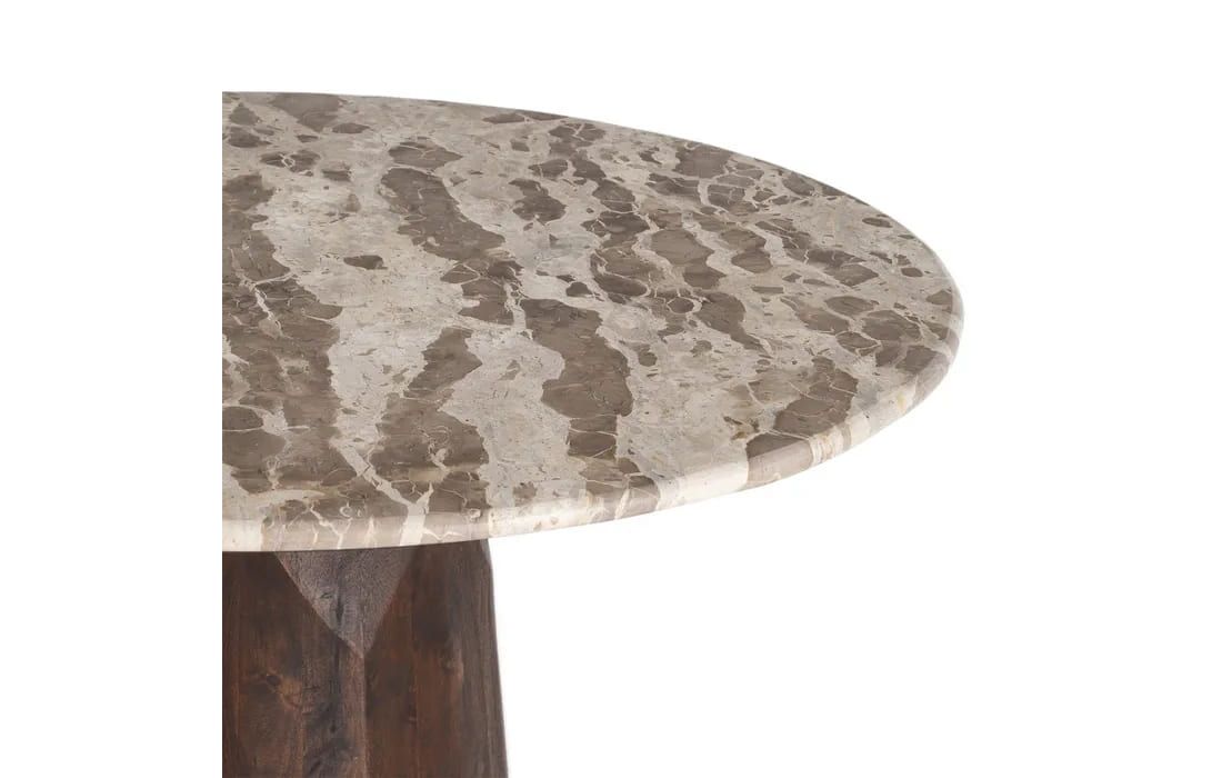 Esta mesa de refeição apresenta um design sofisticado que combina a beleza natural do mármore com a autenticidade da madeira de mango. O seu tampo redondo em mármore confere elegância e luminosidade, enquanto a base em madeira maciça destaca-se pelos seus veios naturais e tonalidades quentes.