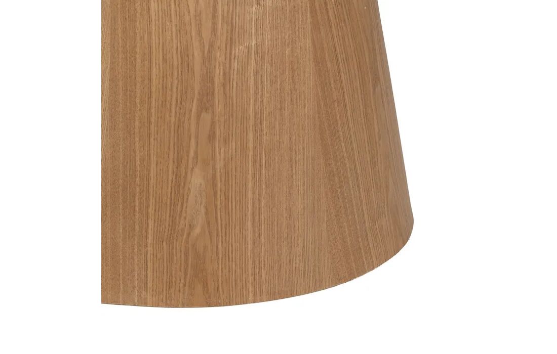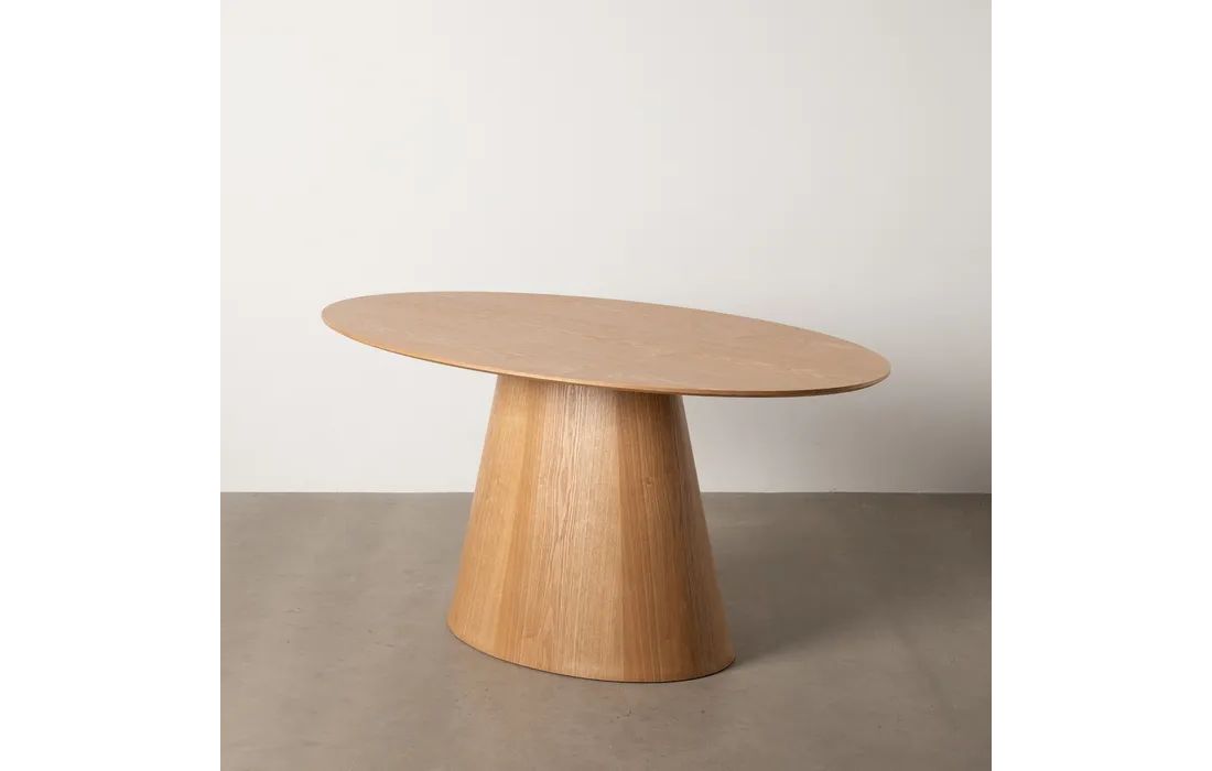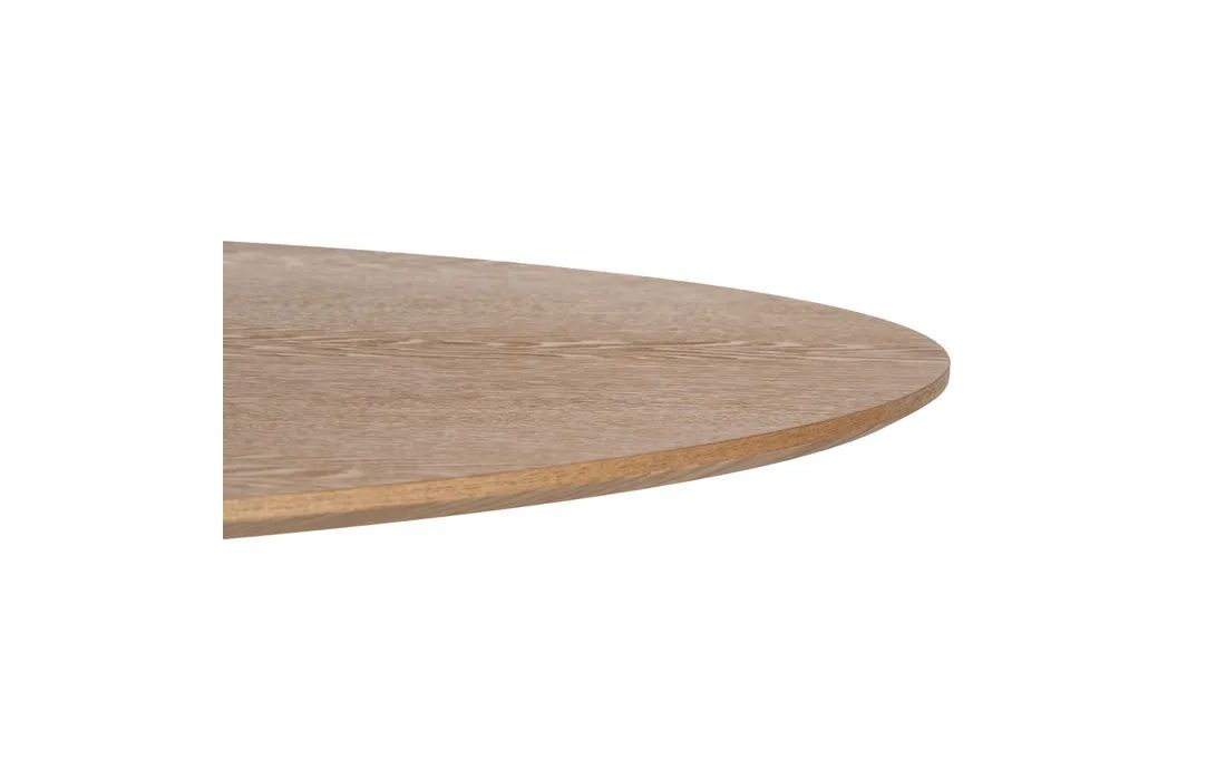 Esta mesa de jantar destaca-se pelo seu design elegante e fluido, com um tampo oval que combina funcionalidade e sofisticação. Feita em MDF folheado a carvalho, apresenta um acabamento natural que valoriza os veios da madeira e cria uma atmosfera acolhedora.