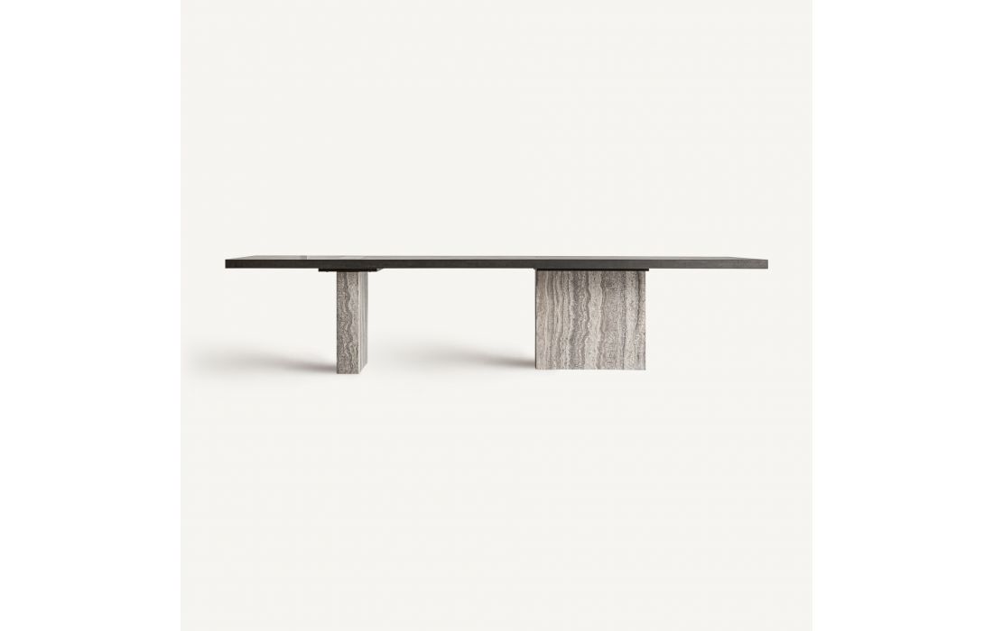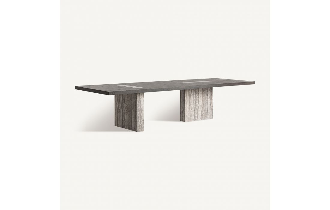 Esta mesa de jantar em estilo contemporâneo, combina a sofisticação do travertino cinza com a elegância da madeira de freixo em tom castanho e latão. A fusão destes materiais cria um visual moderno e distinto, perfeito para qualquer ambiente.