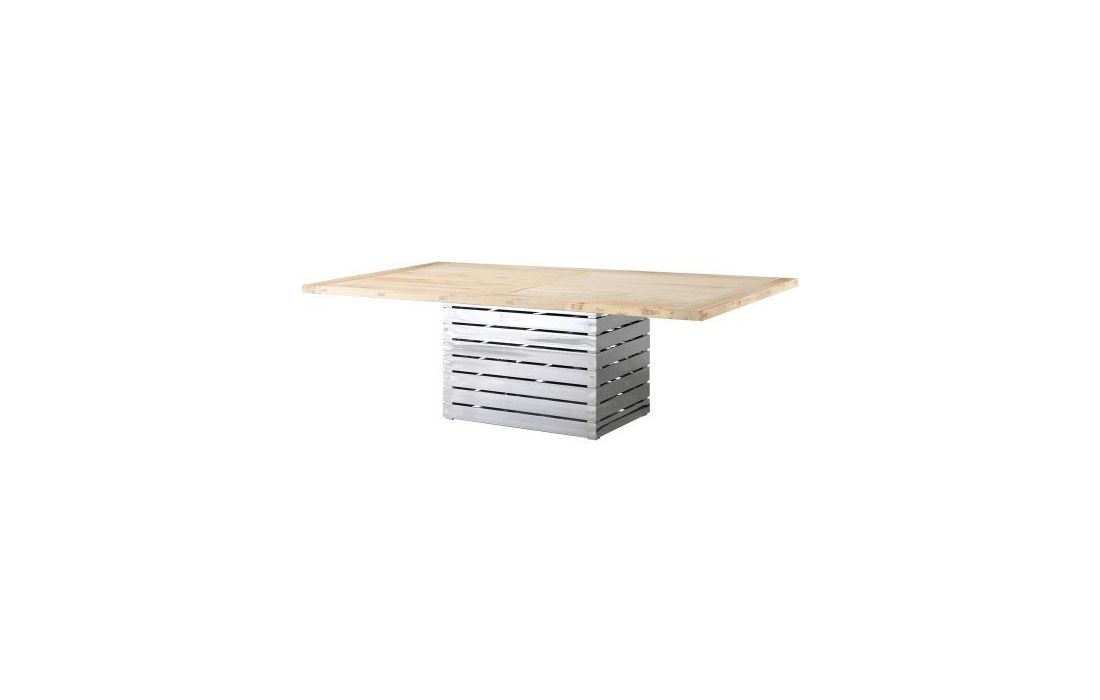 Mesa com tampo de madeira em olmo e pé em aço inox.