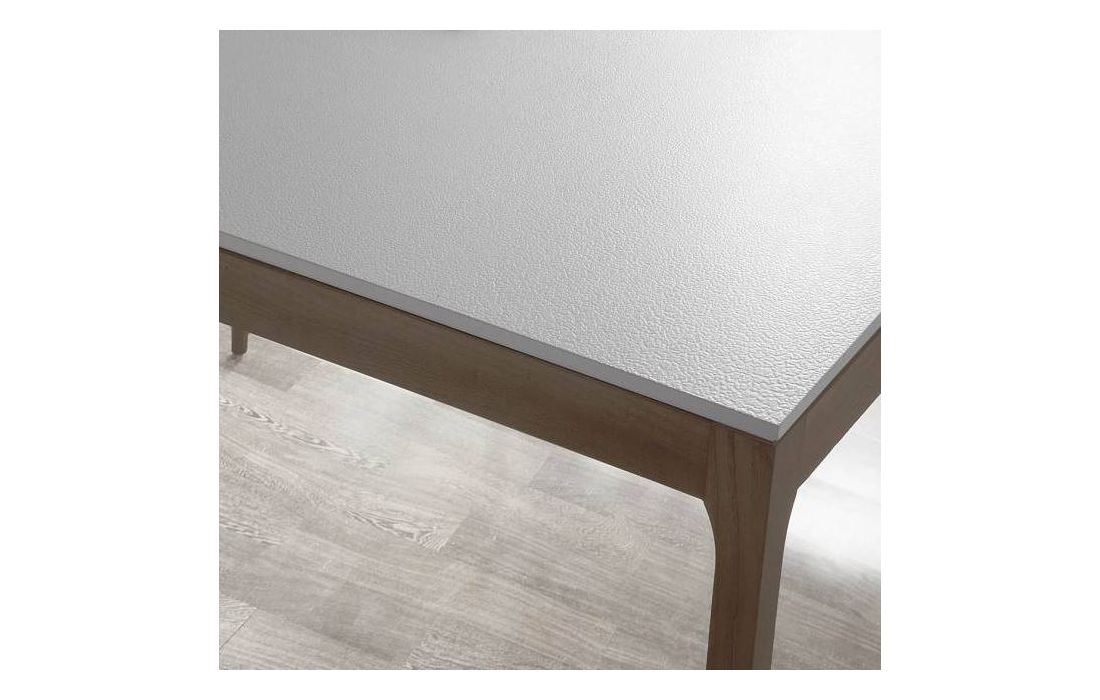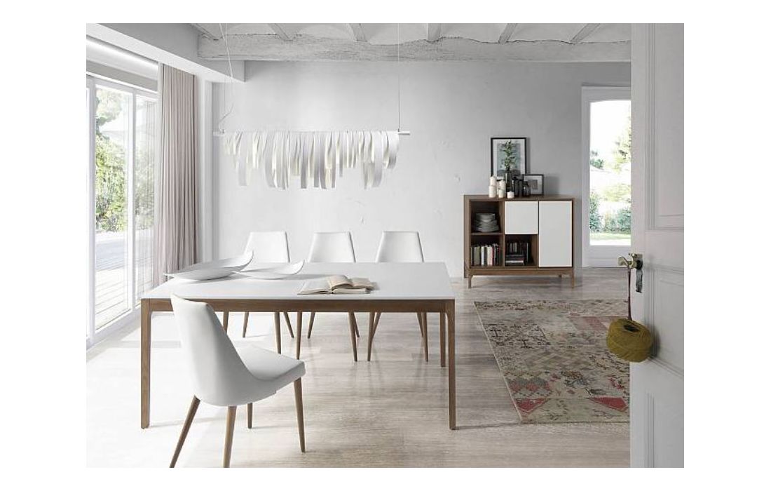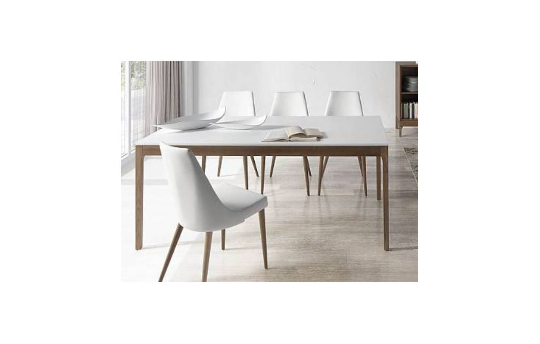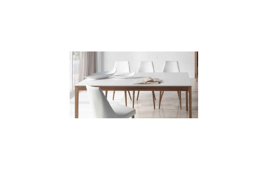 Mesa com estrutura em nogueira e tampo em branco com acabamento em efeito de pele.