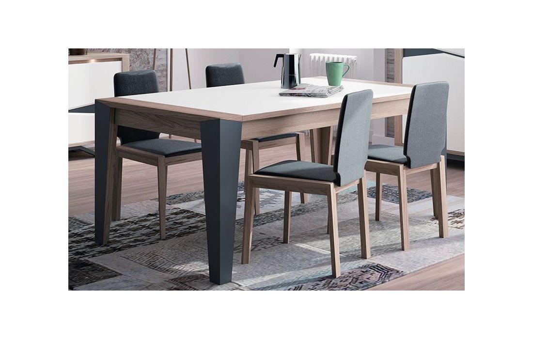 Mesa extensível nos vários acabamentos possíveis, pormenor de pés em metal.