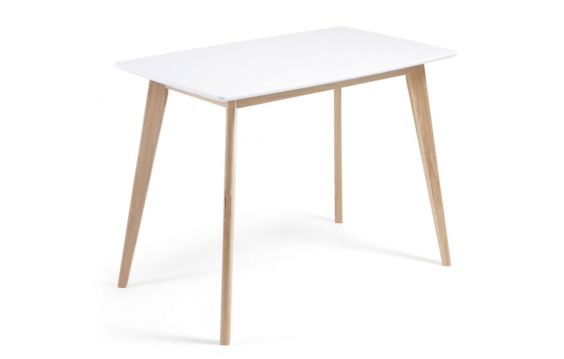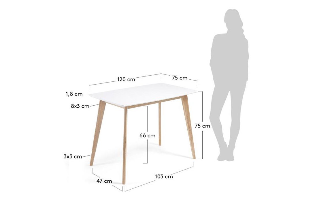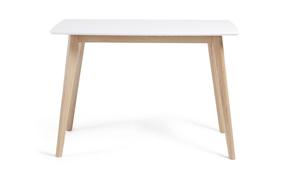 Mesa com estrutura em madeira maciça de fresno, tampo em MDF de cor branco.