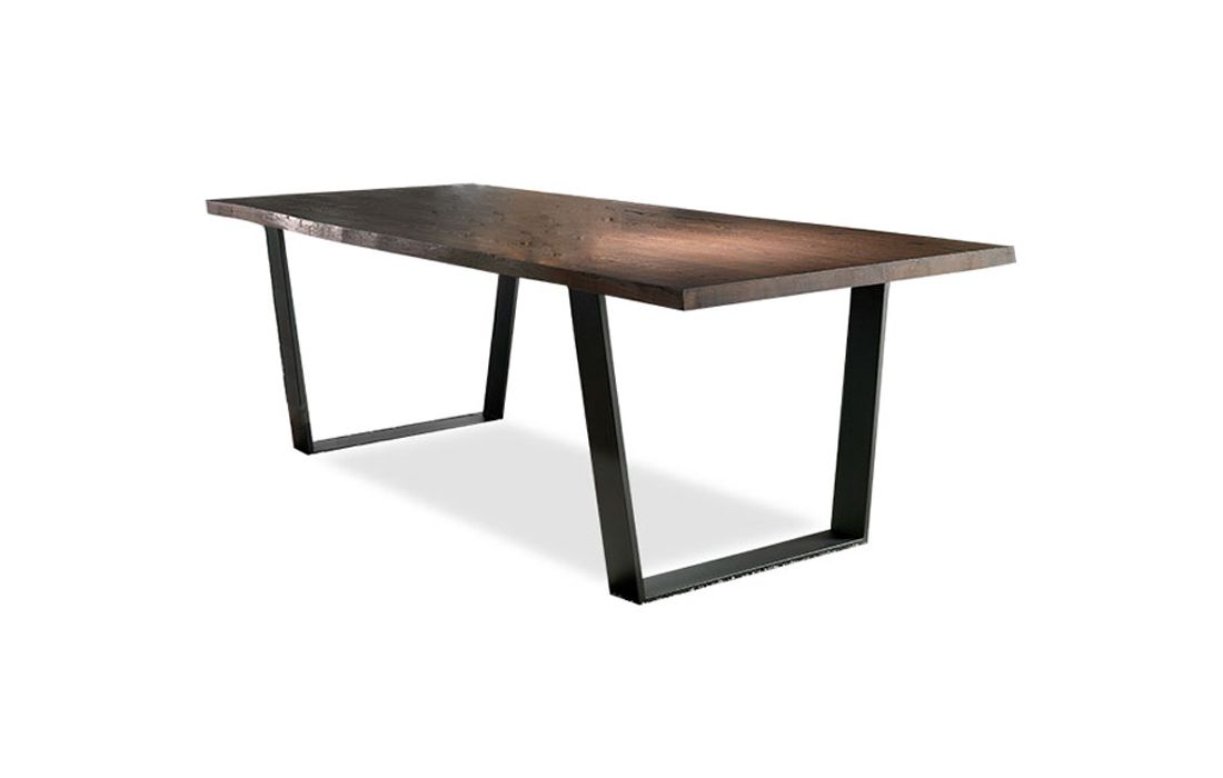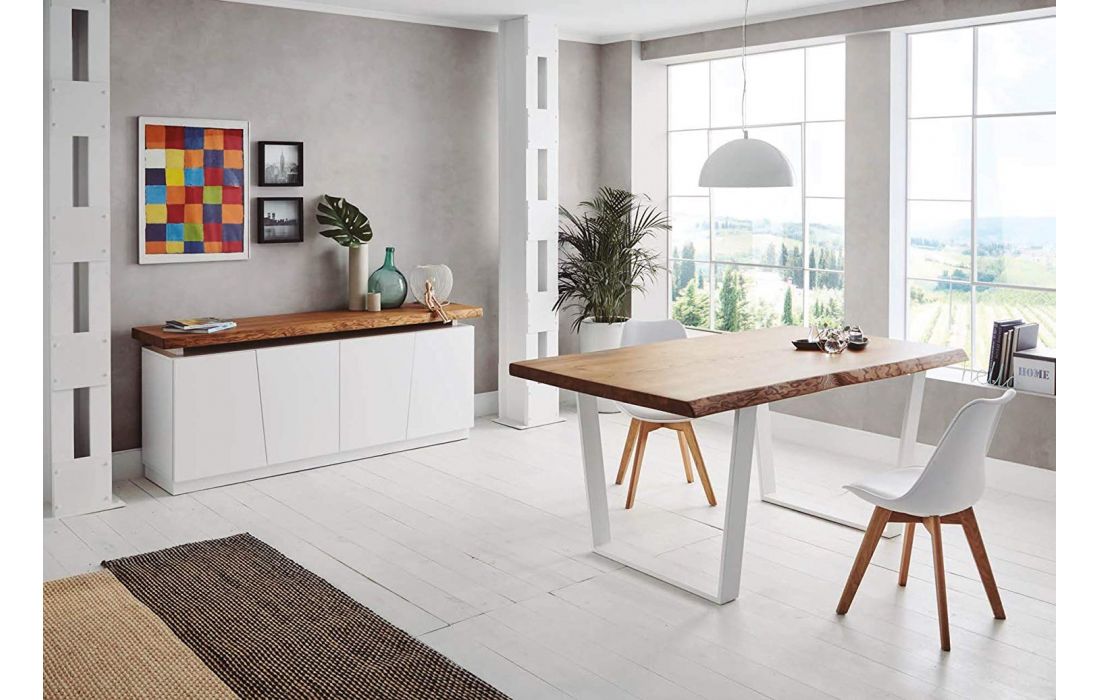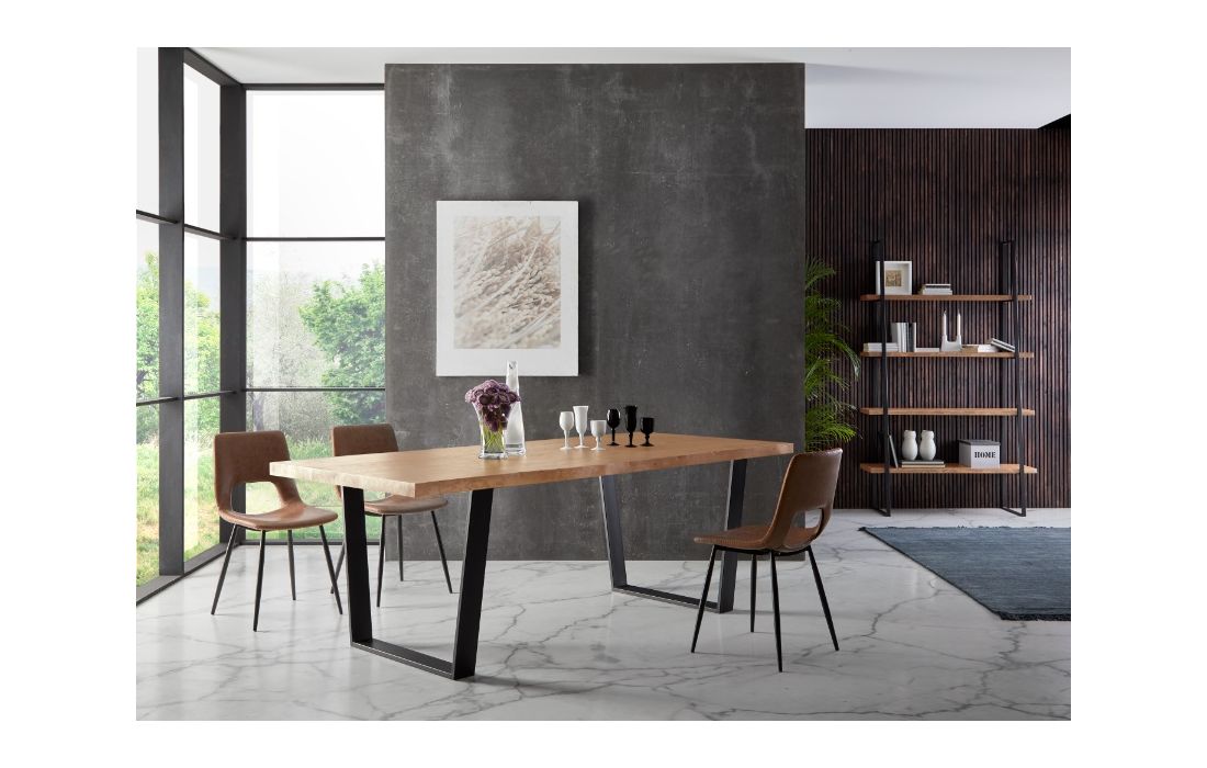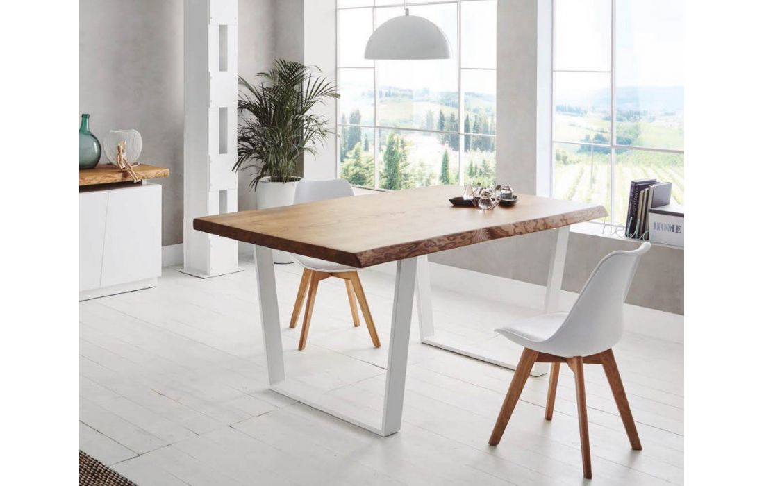Mesa de jantar com tampo em madeira maciça de freixo com 3 tipos de acabamento, pés de metal com opção branco ou preto.
