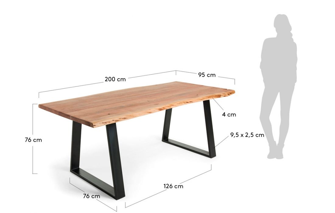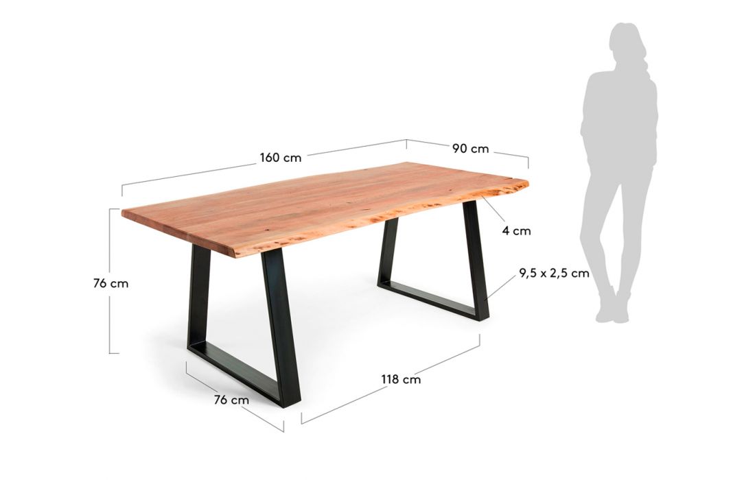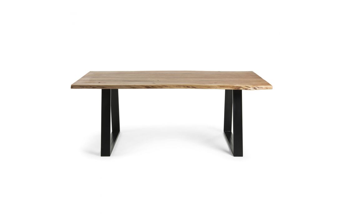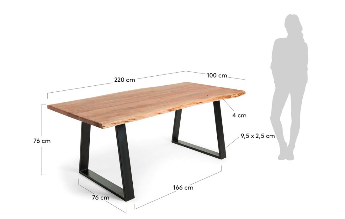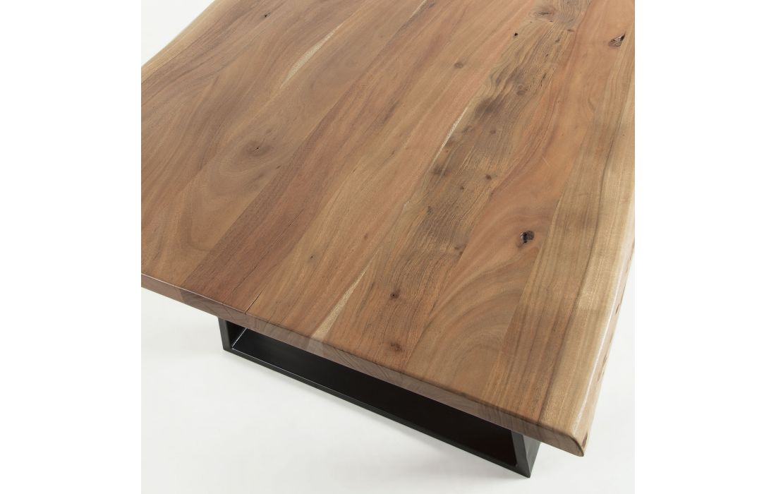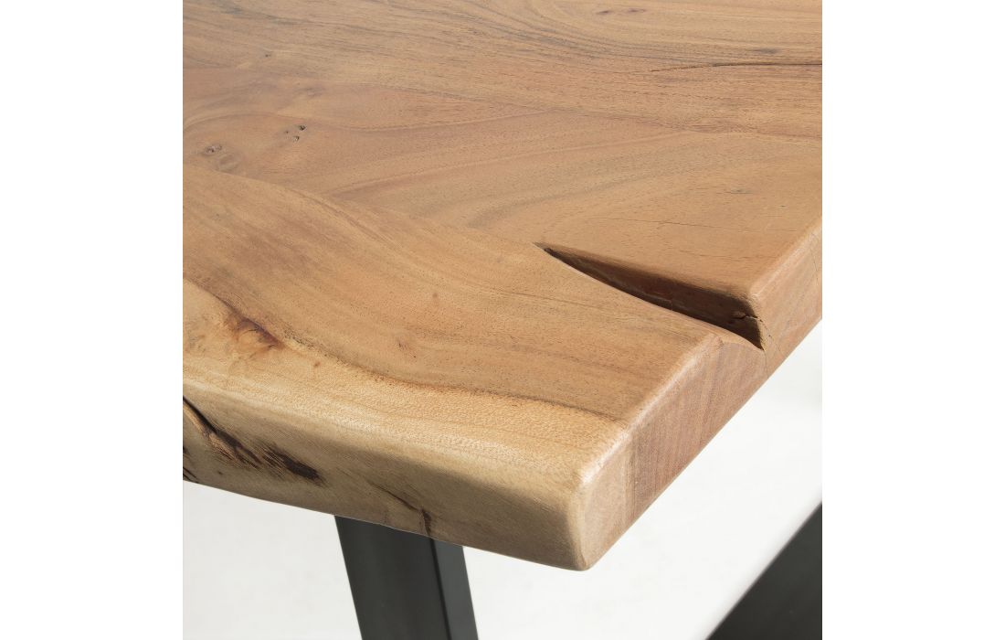 Mesa de jantar com estrutura em metal e tampo de madeira acacia maciça natural.