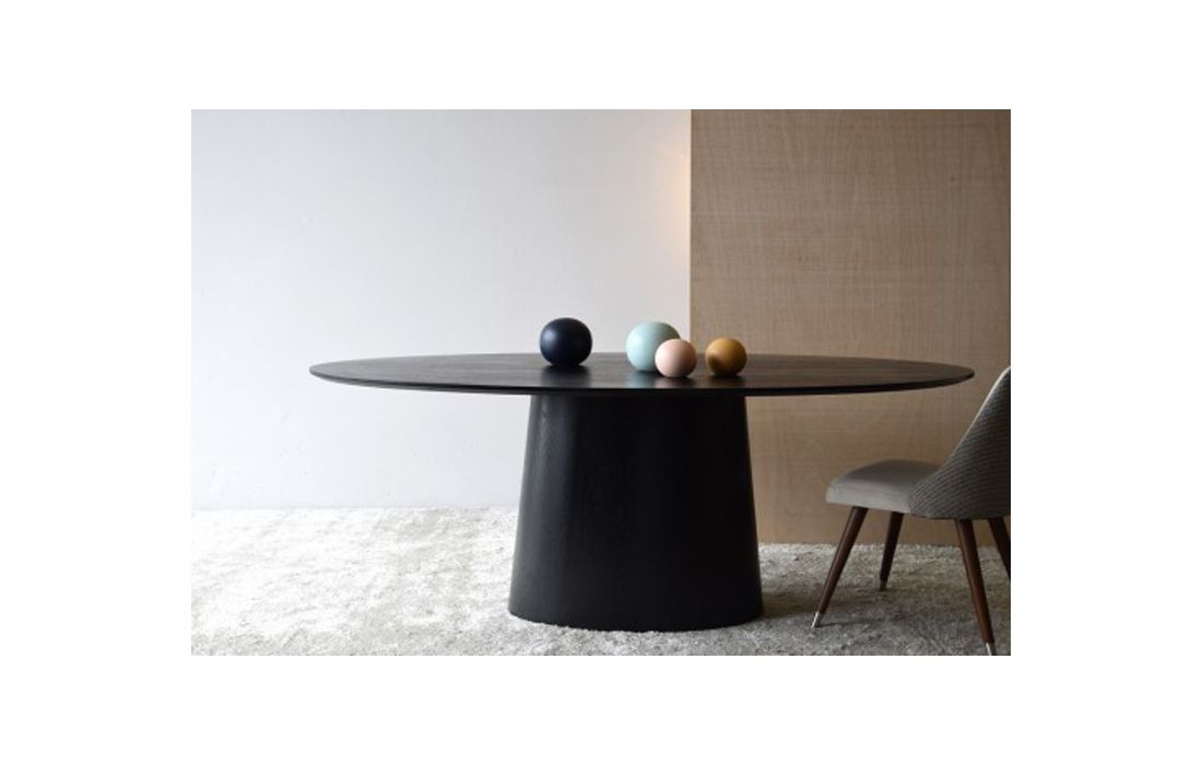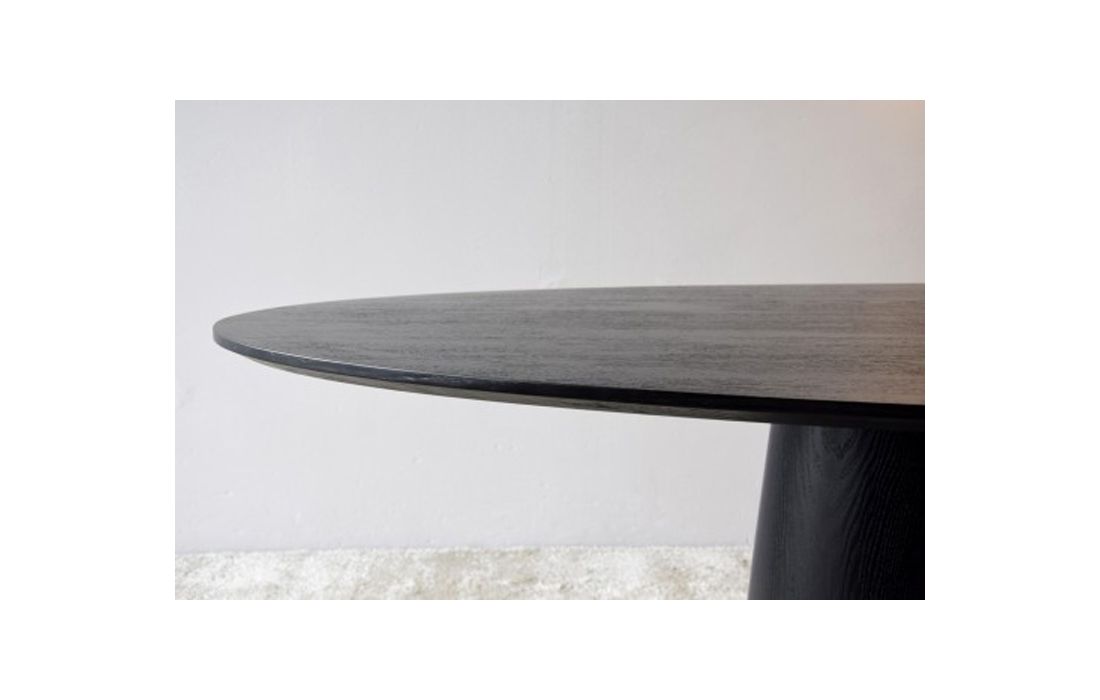 Mesa de jantar oval em MDF folheado com acabamento de cor preta.