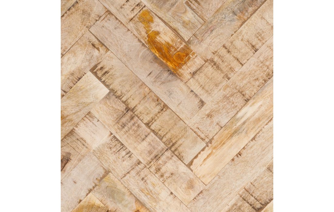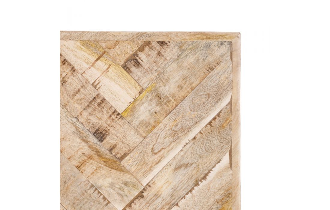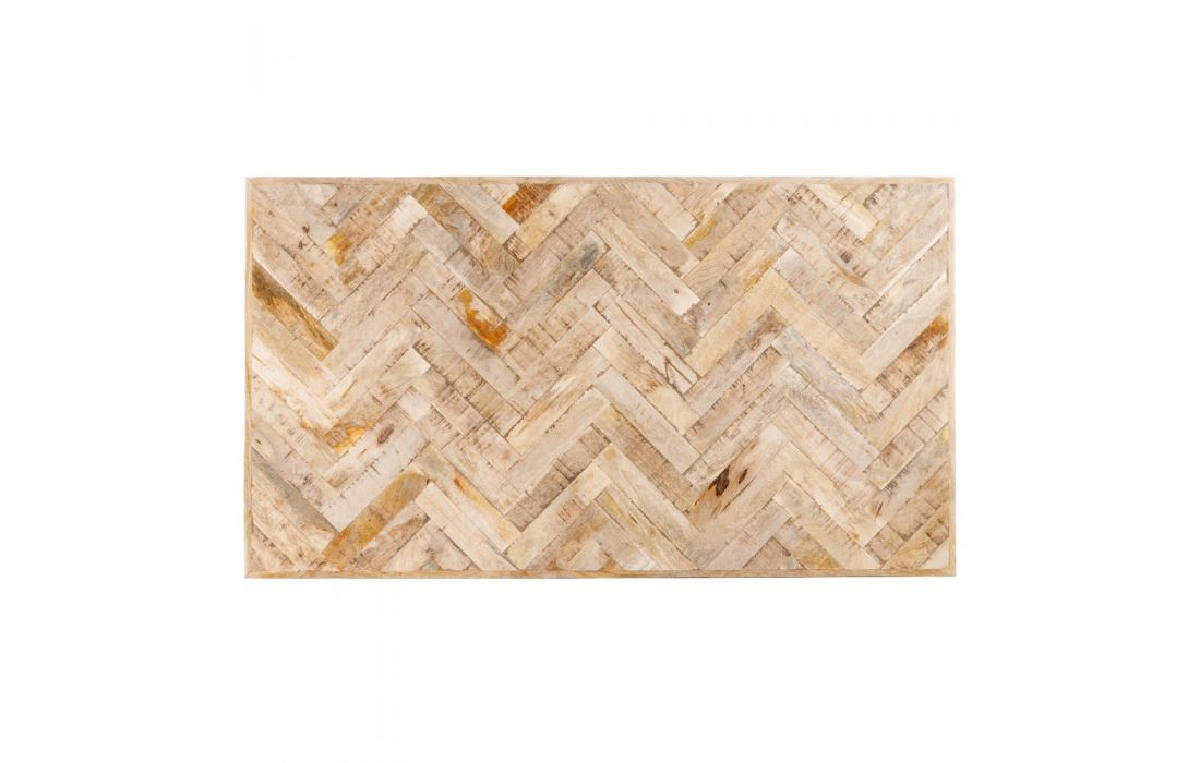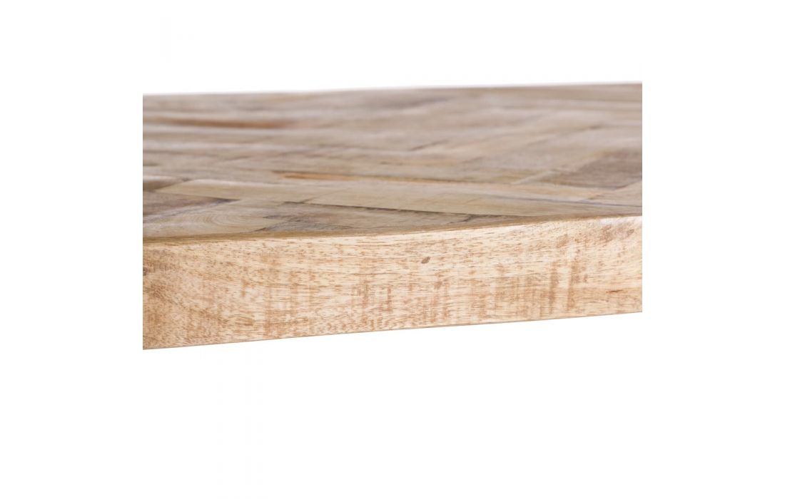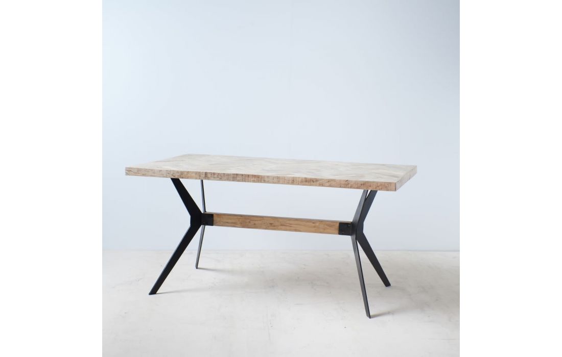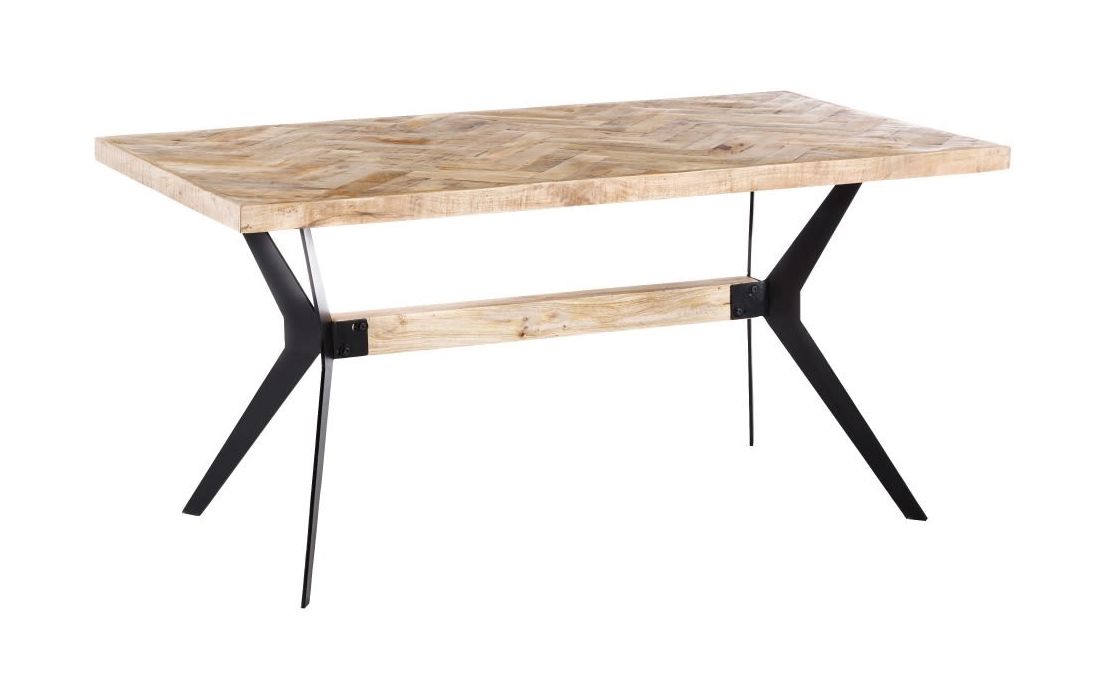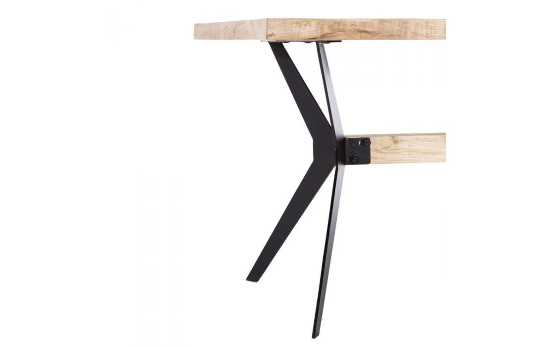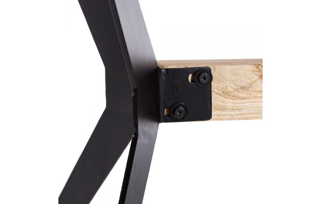 Mesa de refeições retangular com estrutura em metal preto, com tampo em madeira de acácia