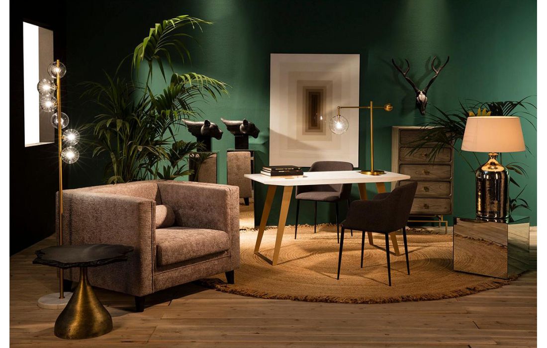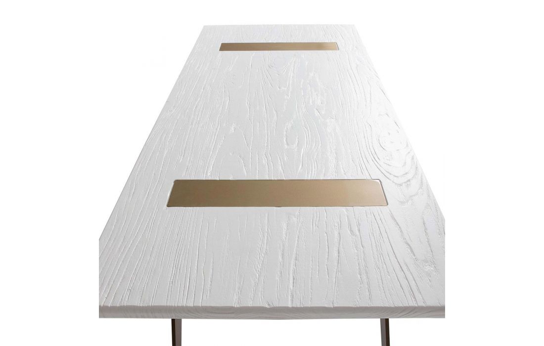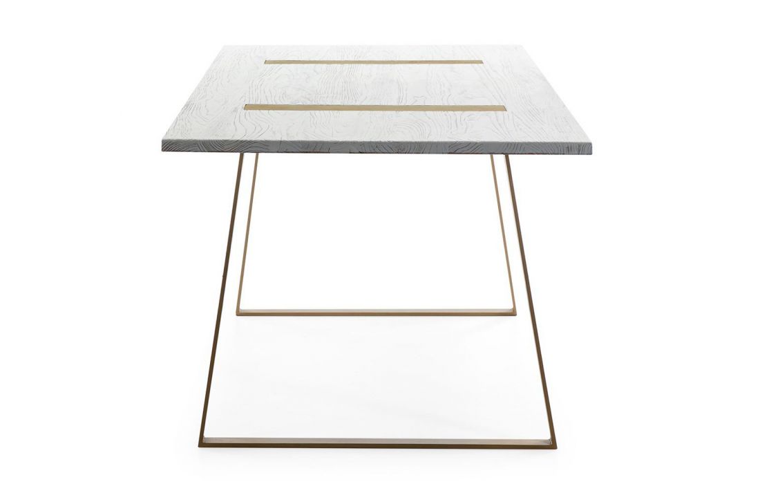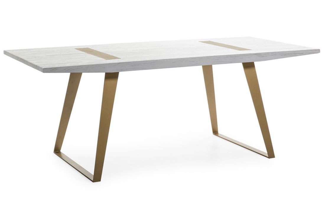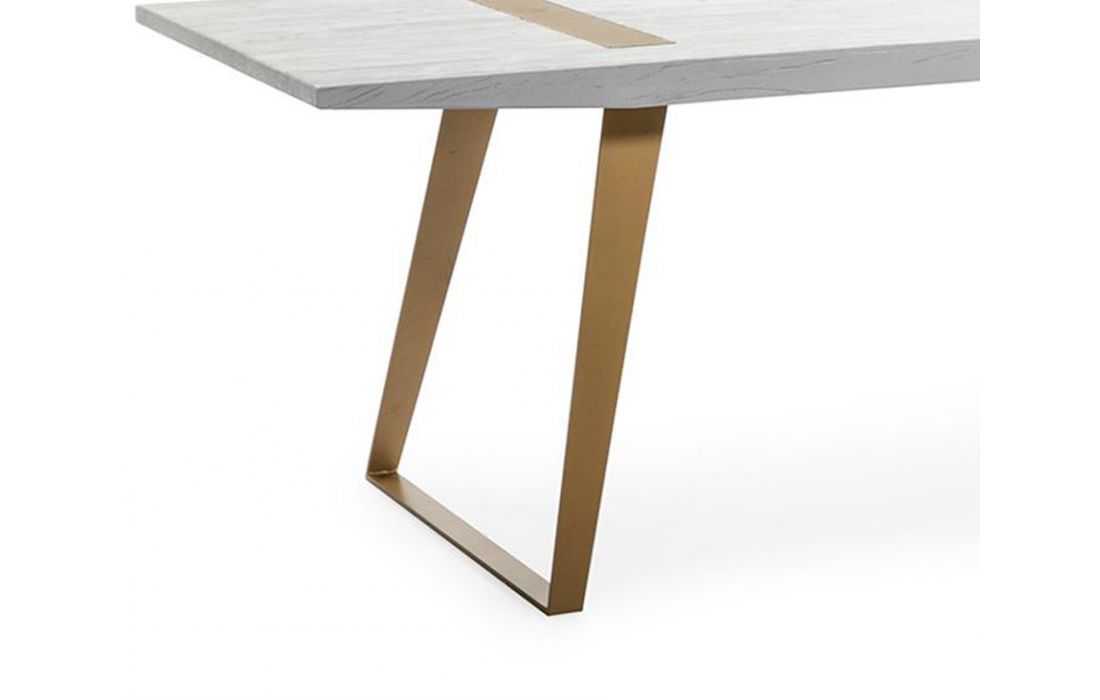 Mesa de jantar retangular com estrutura em metal dourado e tampo de madeira cor branca.