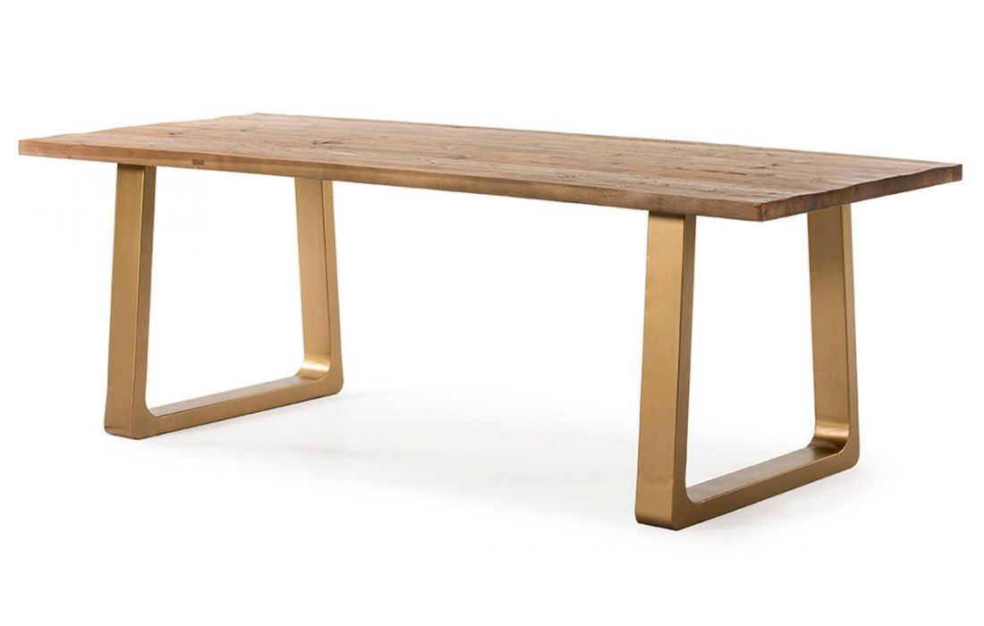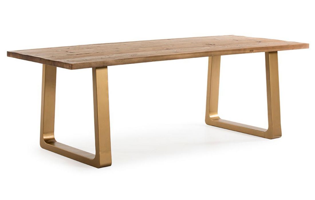 Mesa de jantar retangular com estrutura em metal dourado e tampo de madeira cor natural.