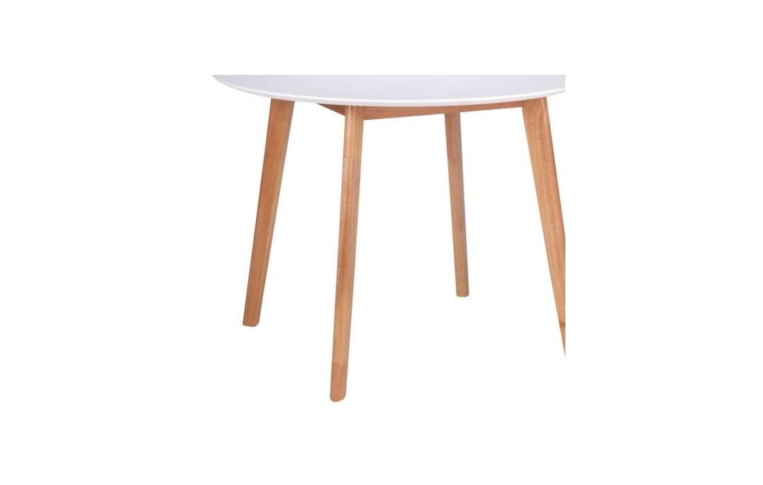 Mesa redonda com tampo lacado em branco com pés em madeira