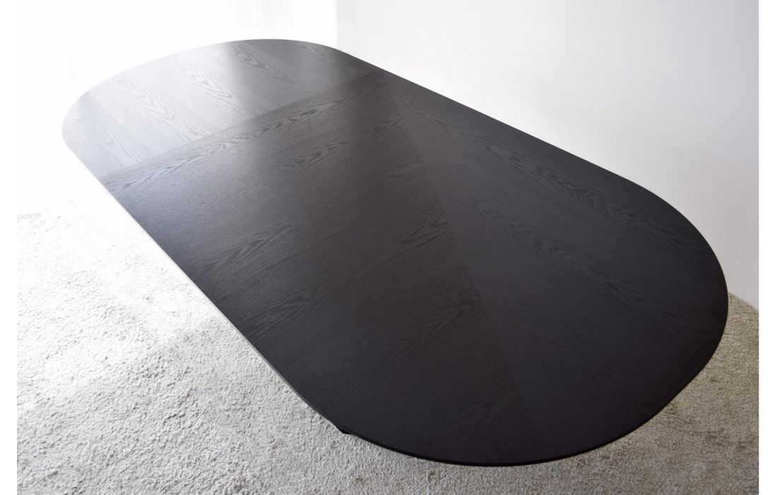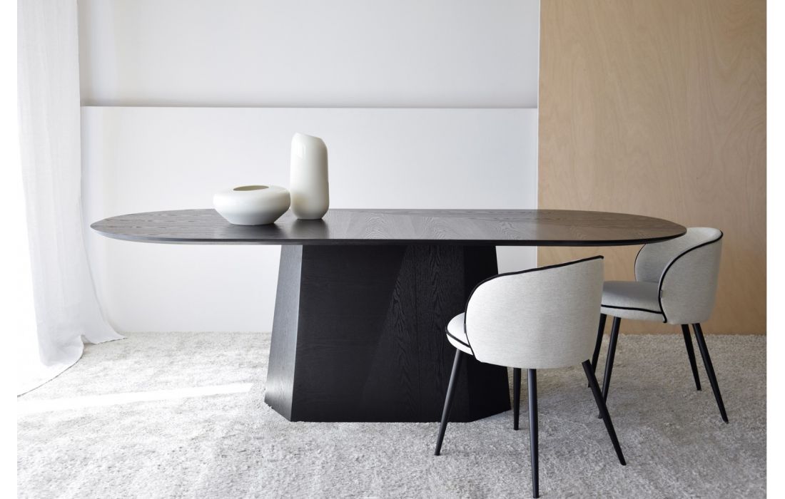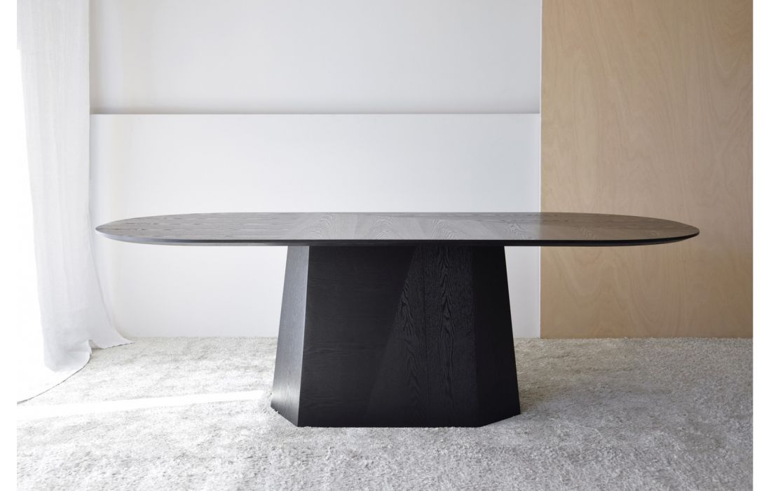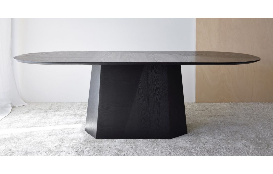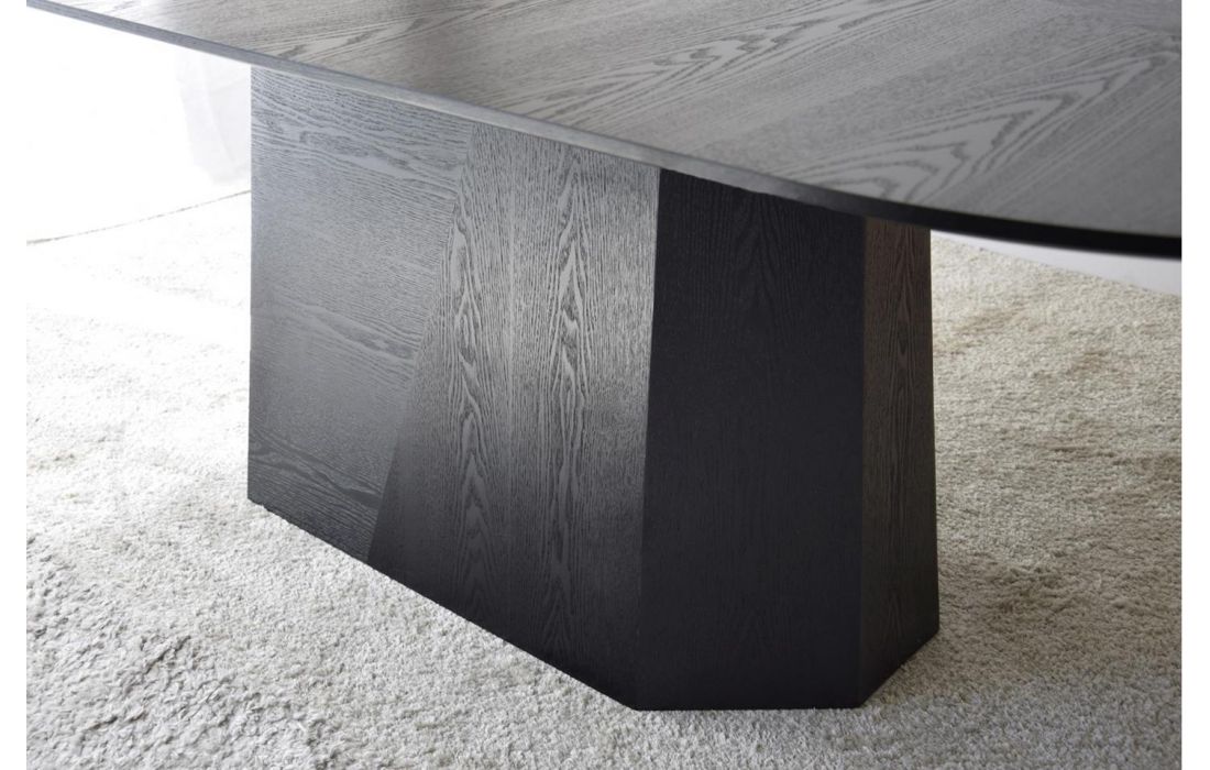 Mesa de jantar em mdf folheado em freixo com acabamento preto mate. O design desta mesa joga com os próprios grãos da madeira colocados em diferentes direções tanto na suprefície do tampo como na base.