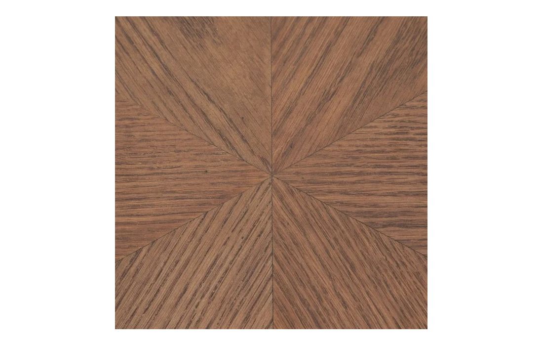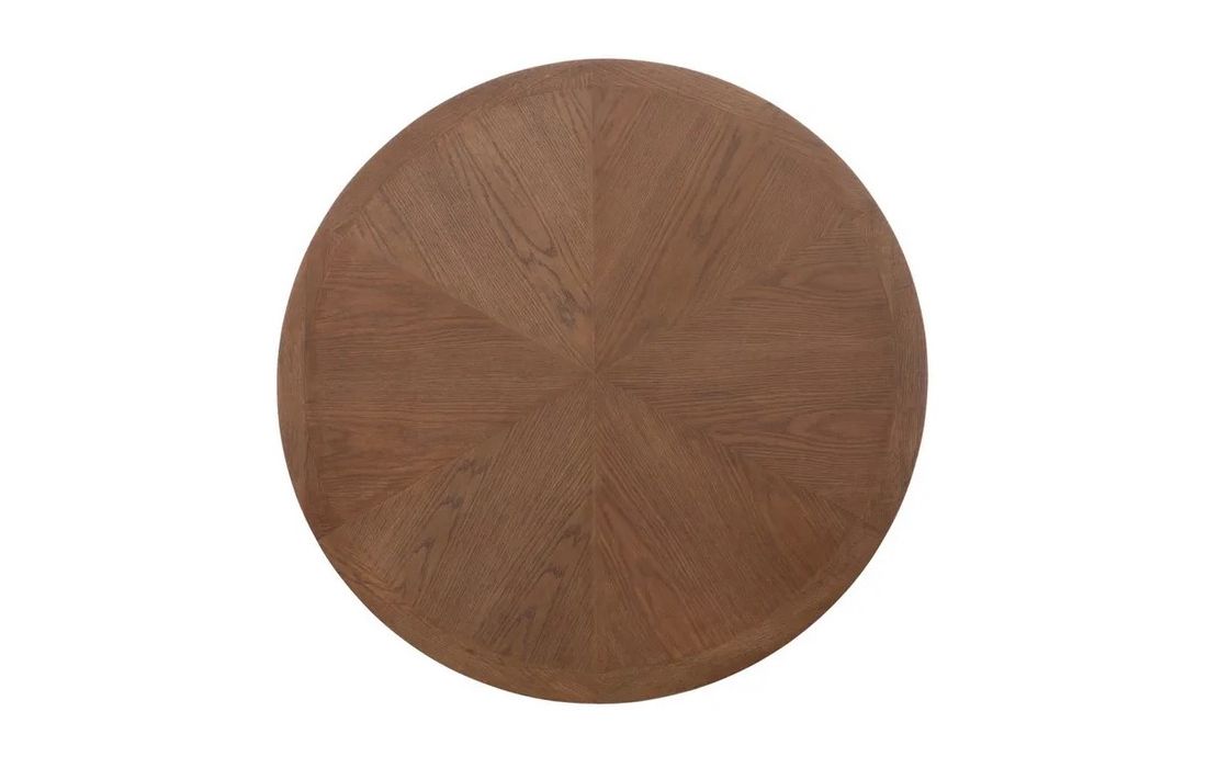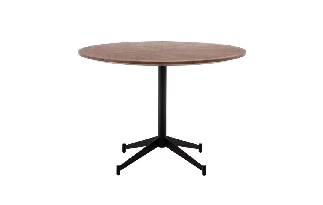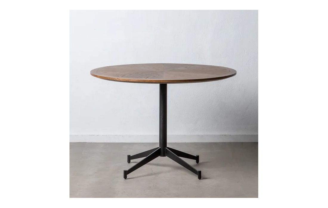 Mesa redonda em madeira maciça de carvalho na cor natural com pés em ferro
