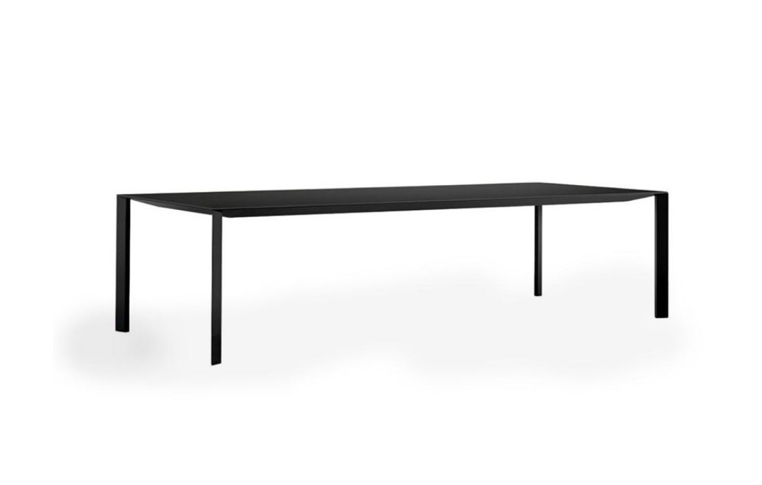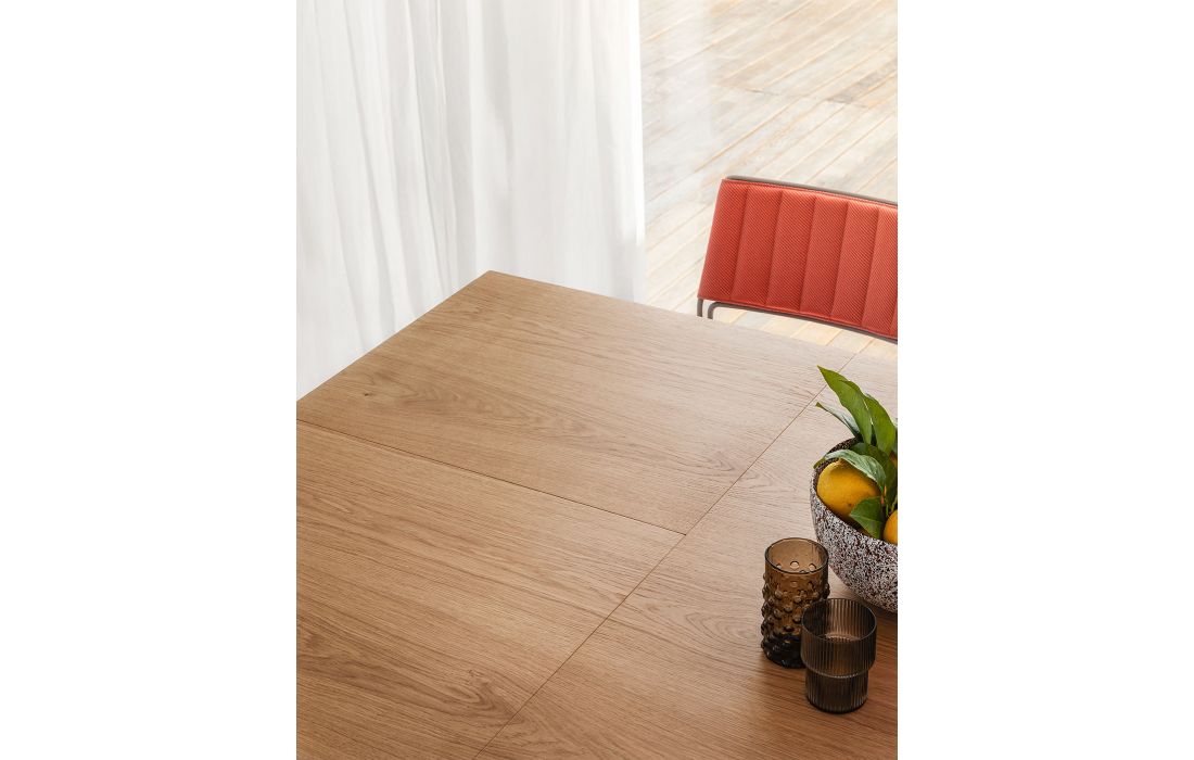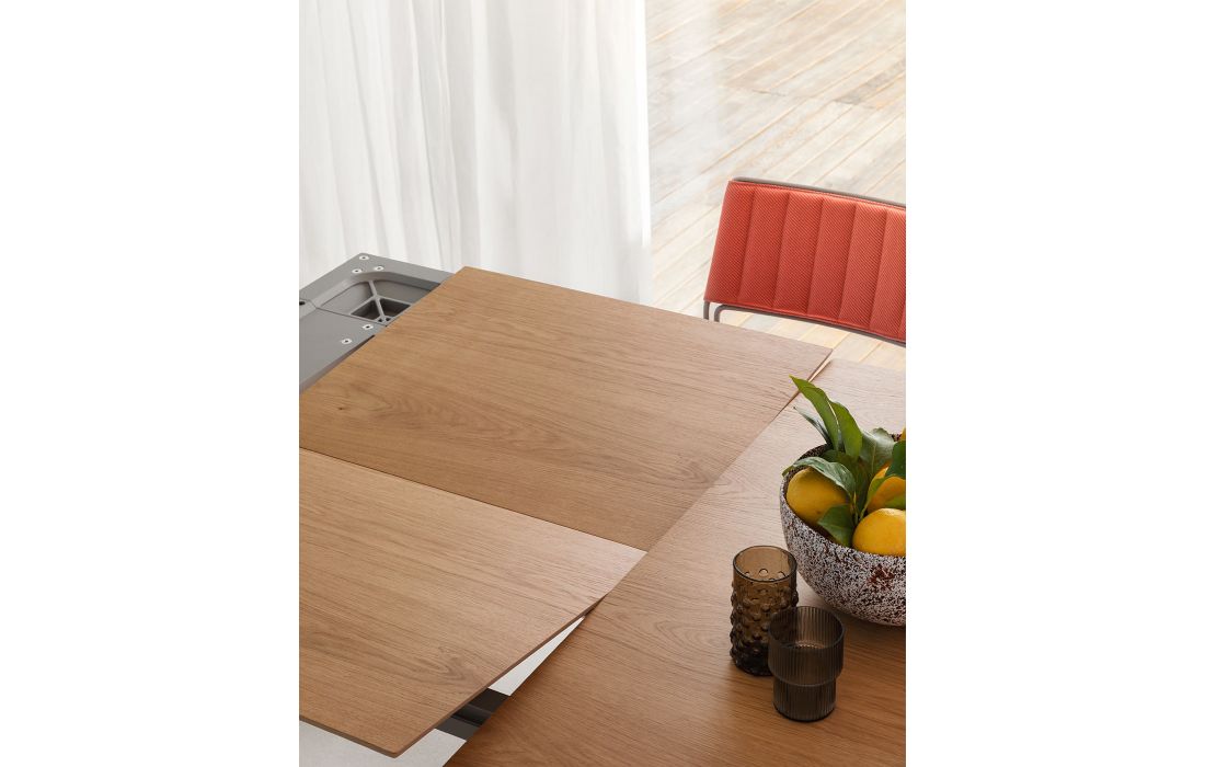 Mesa de jantar extensível com base de quatro pés, pernas e estrutura em metal lacado, tampo em madeira folheado.