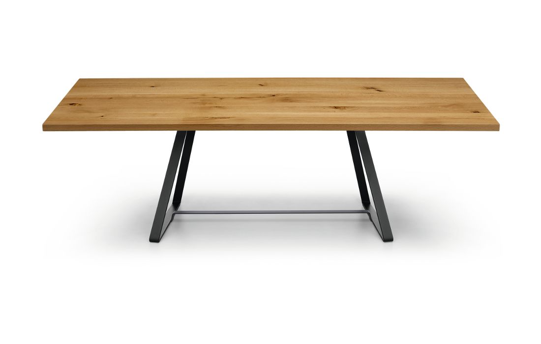 Mesa de jantar com base trenó em metal lacado. Tampo em madeira maciça ou cerâmica.