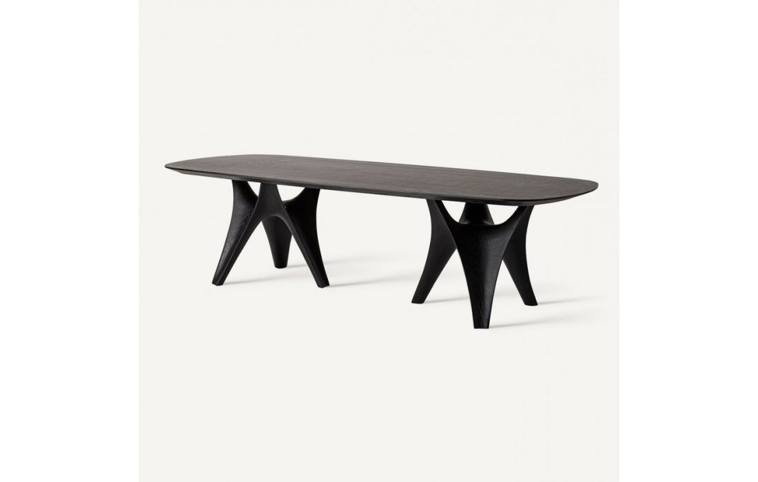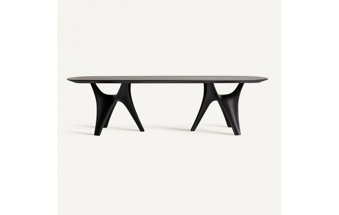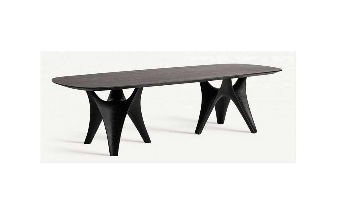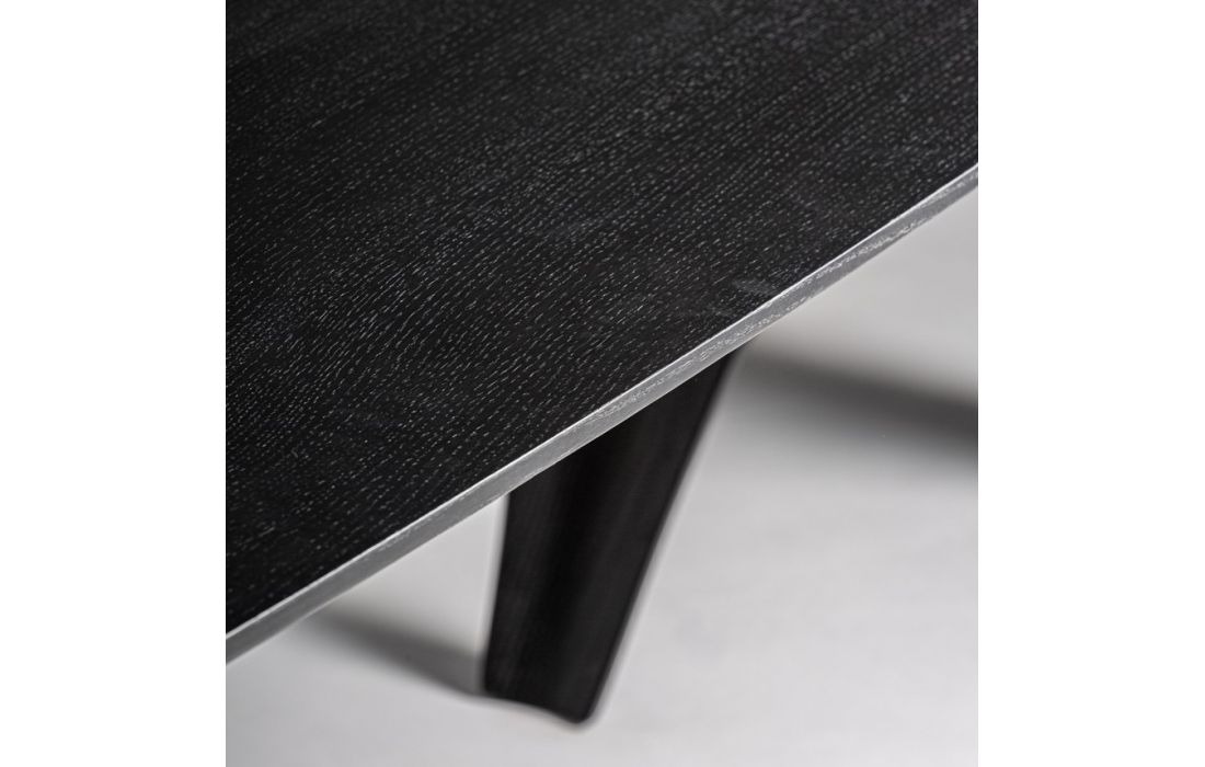 Mesa de jantar em madeira de carvalho na cor preta combinada com madeira de MDF e fibra de vidro