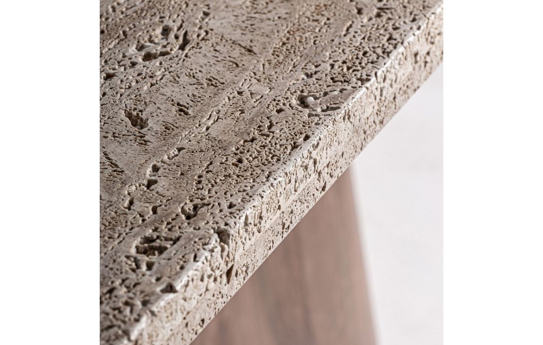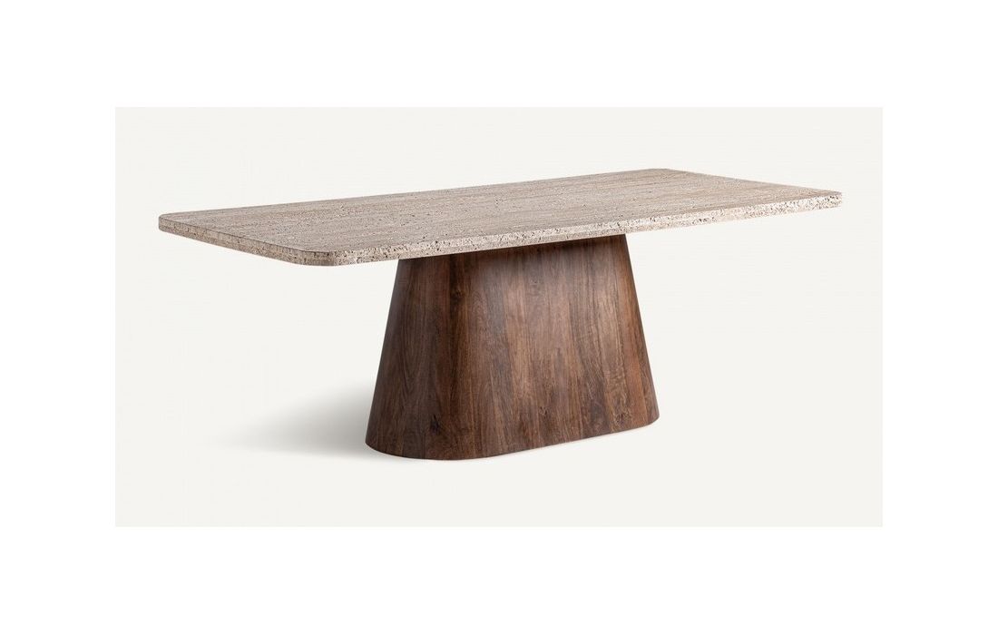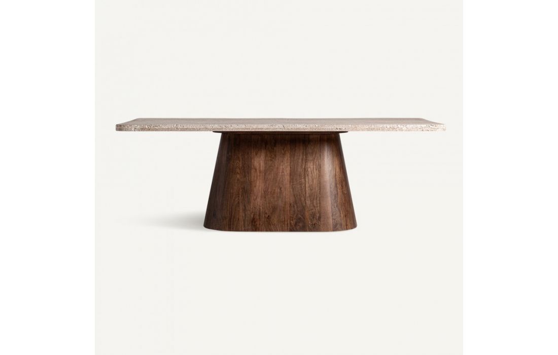 Mesa de jantar em travertino na cor castanha combinada com madeira de mangoDimensões em cm