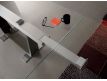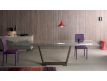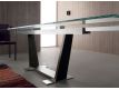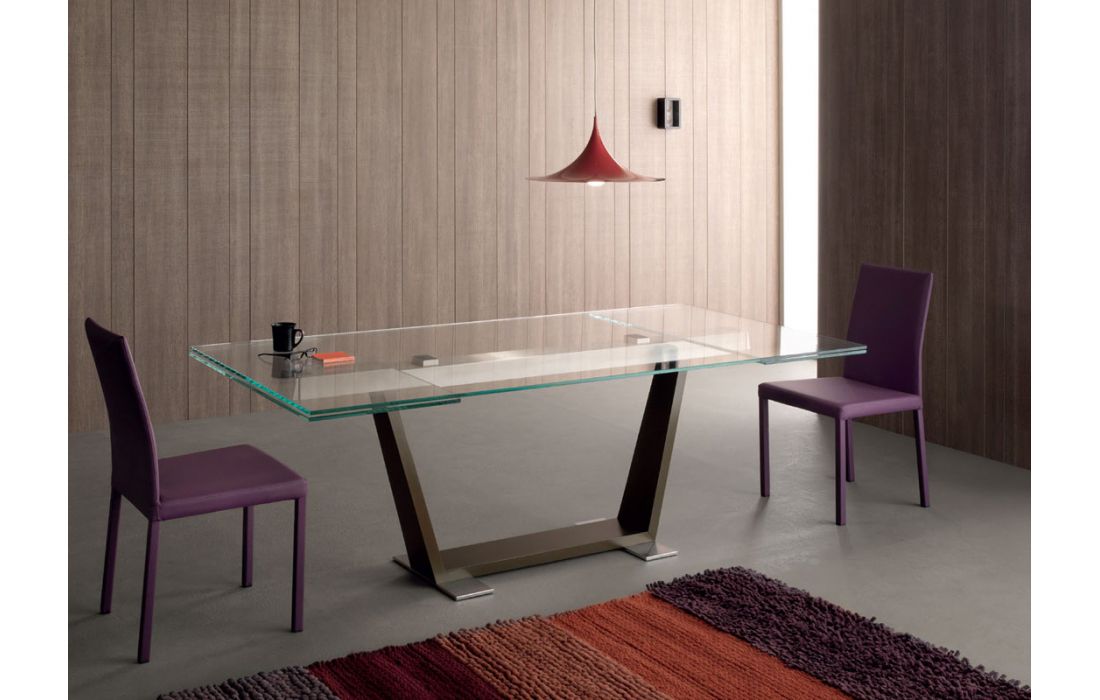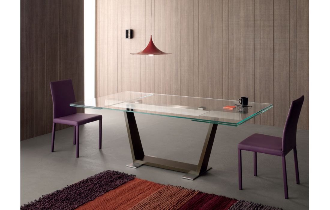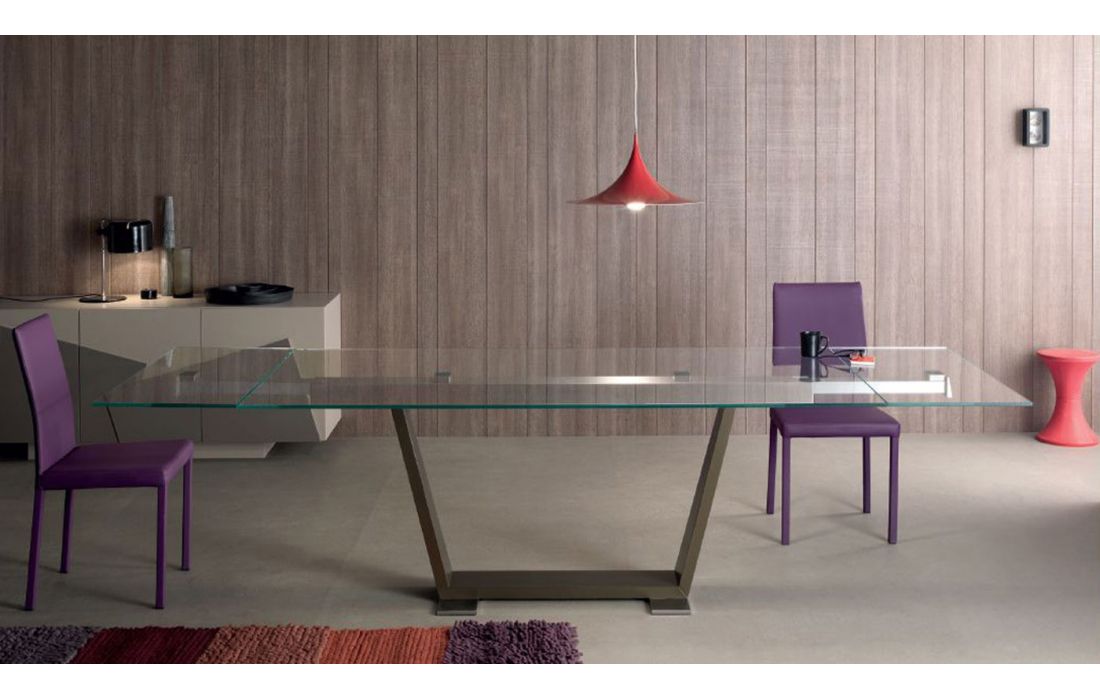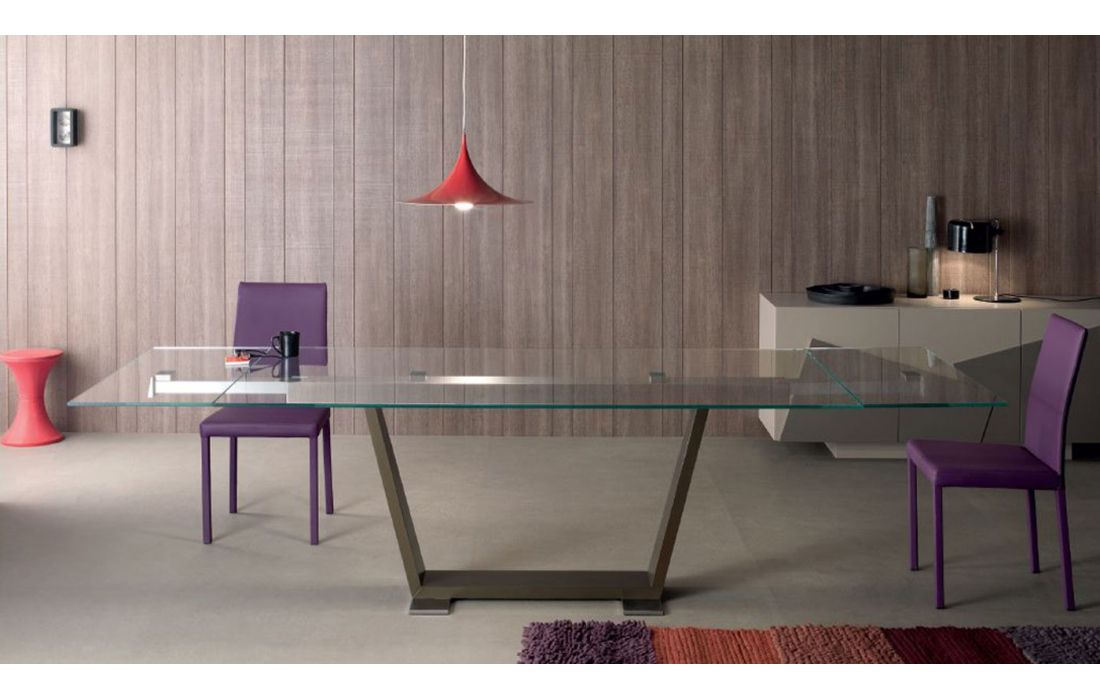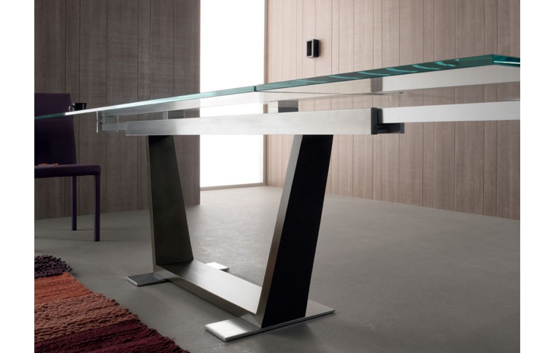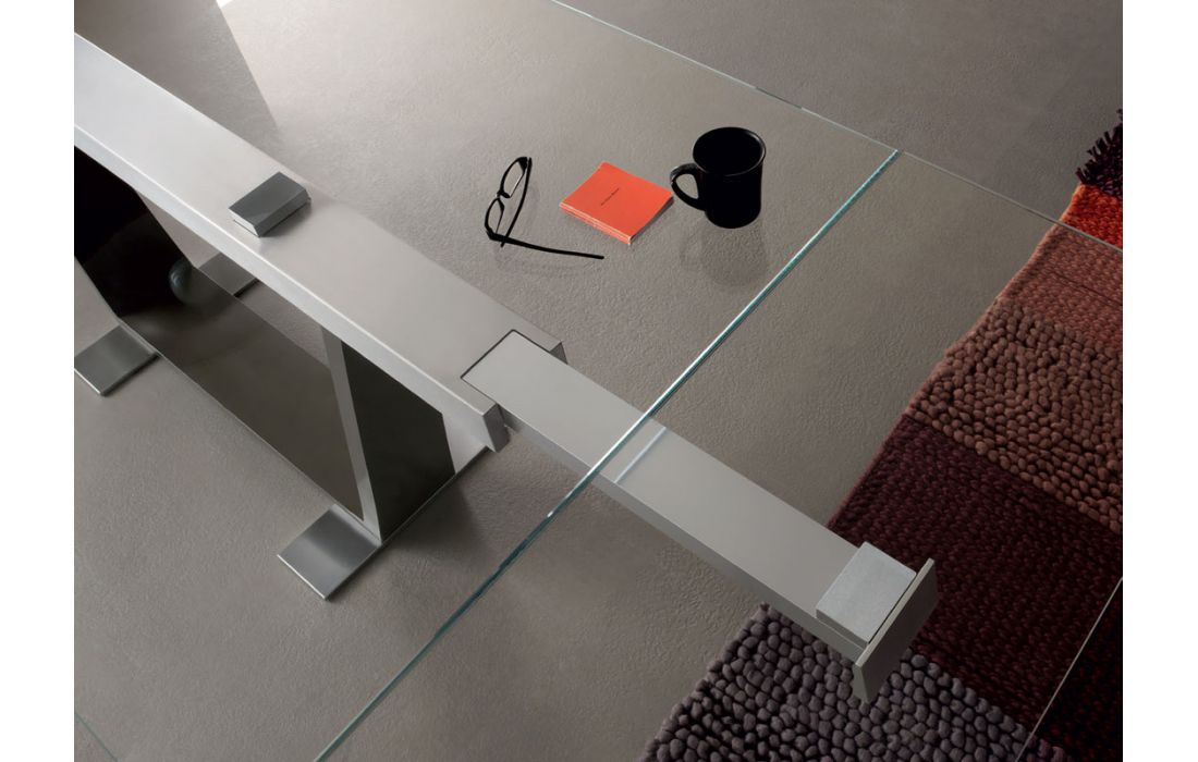 estrutura extensível de alumínio e tampo em vidro temperado trasparente de 12mm de espessura, com 2 extensões, cm 45 cada. Tampo e extensões com bordas de corte 45 °