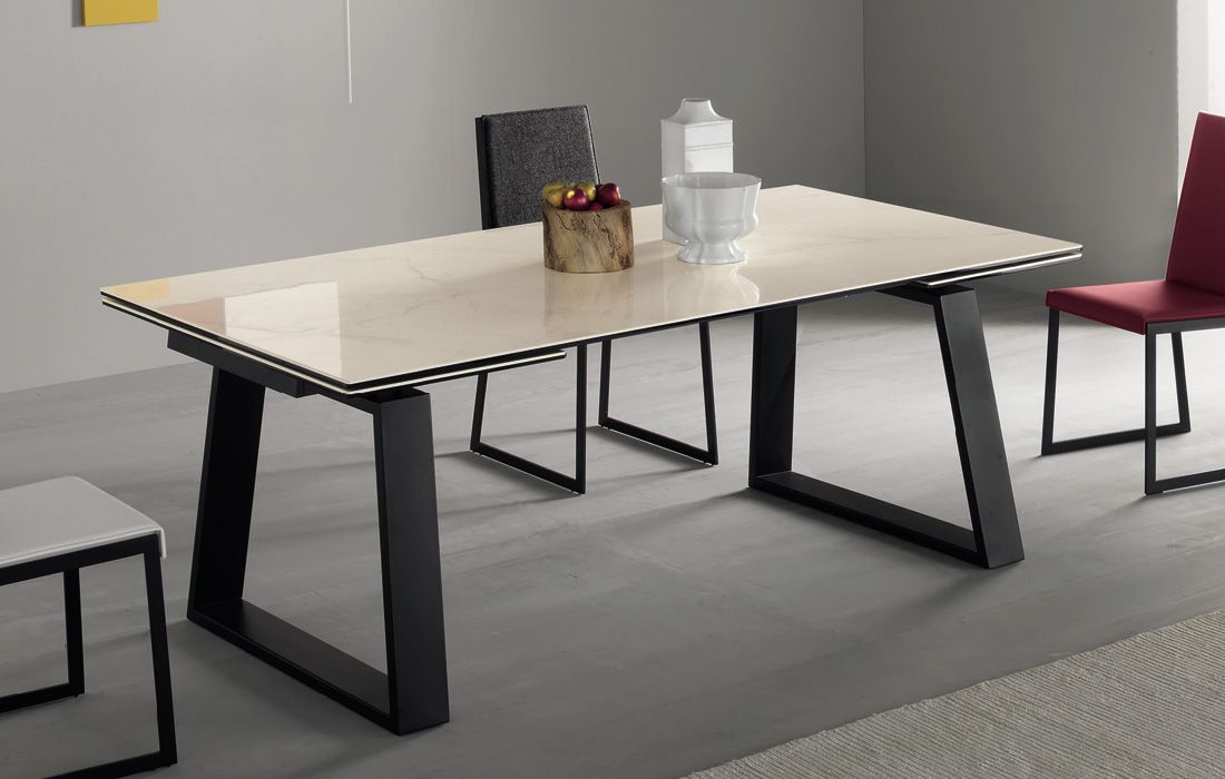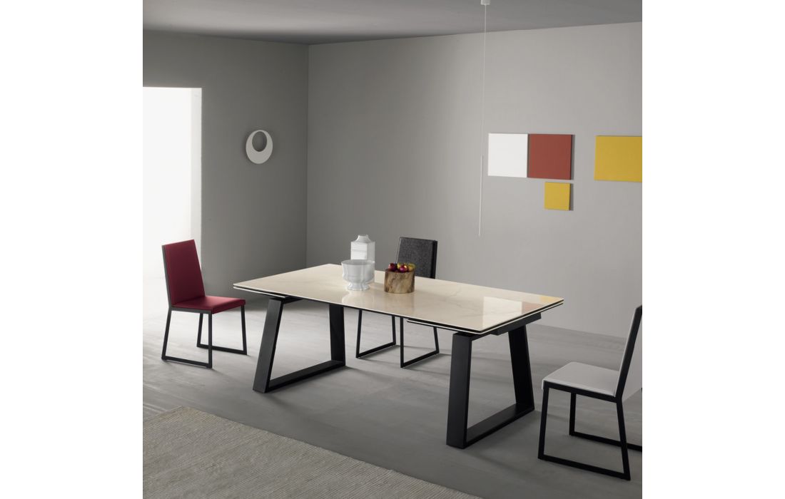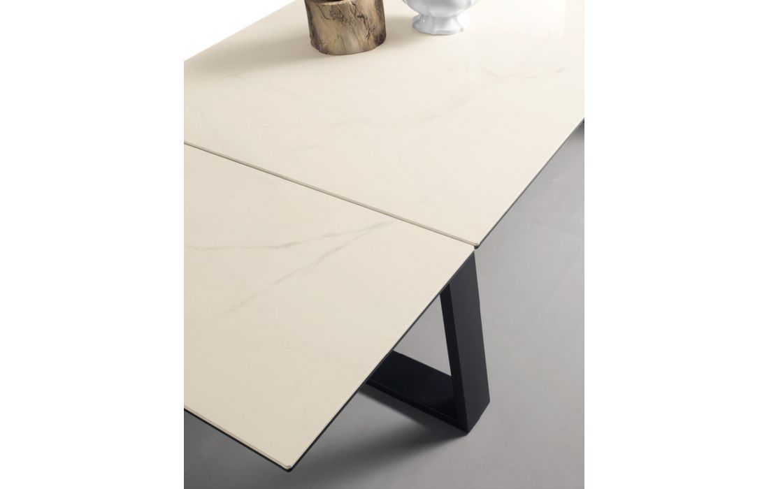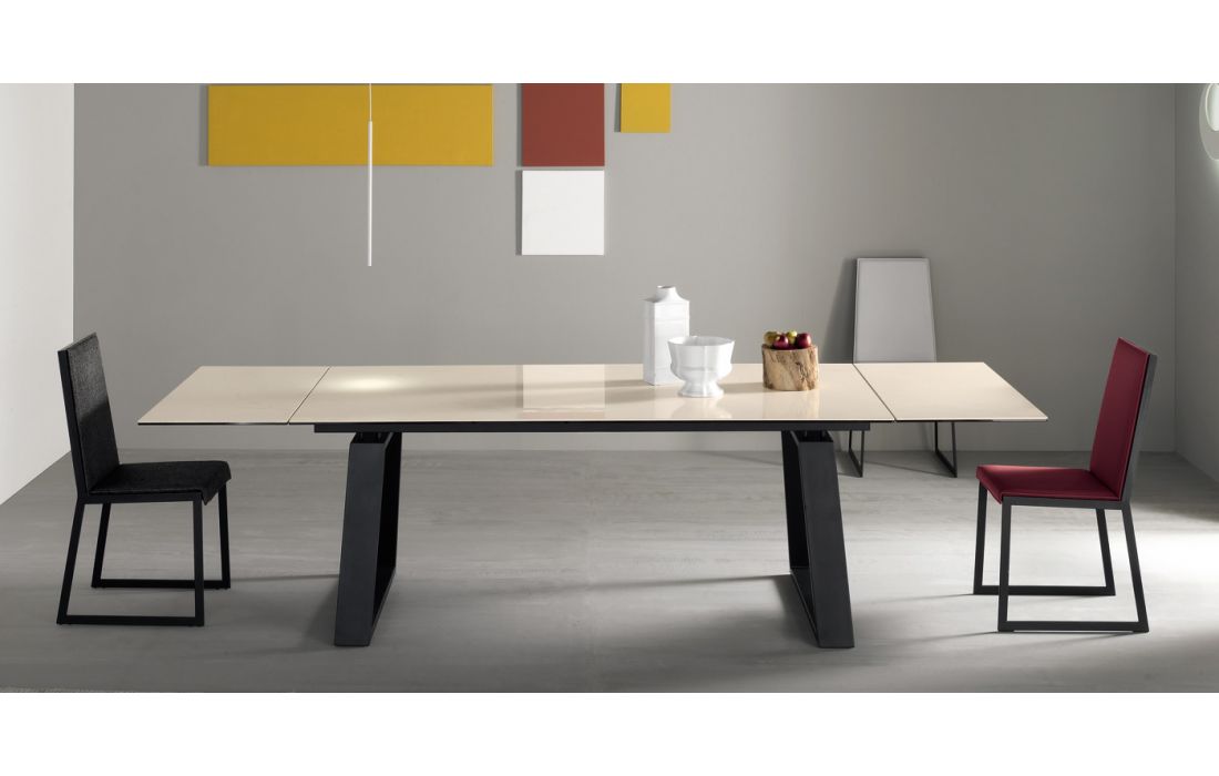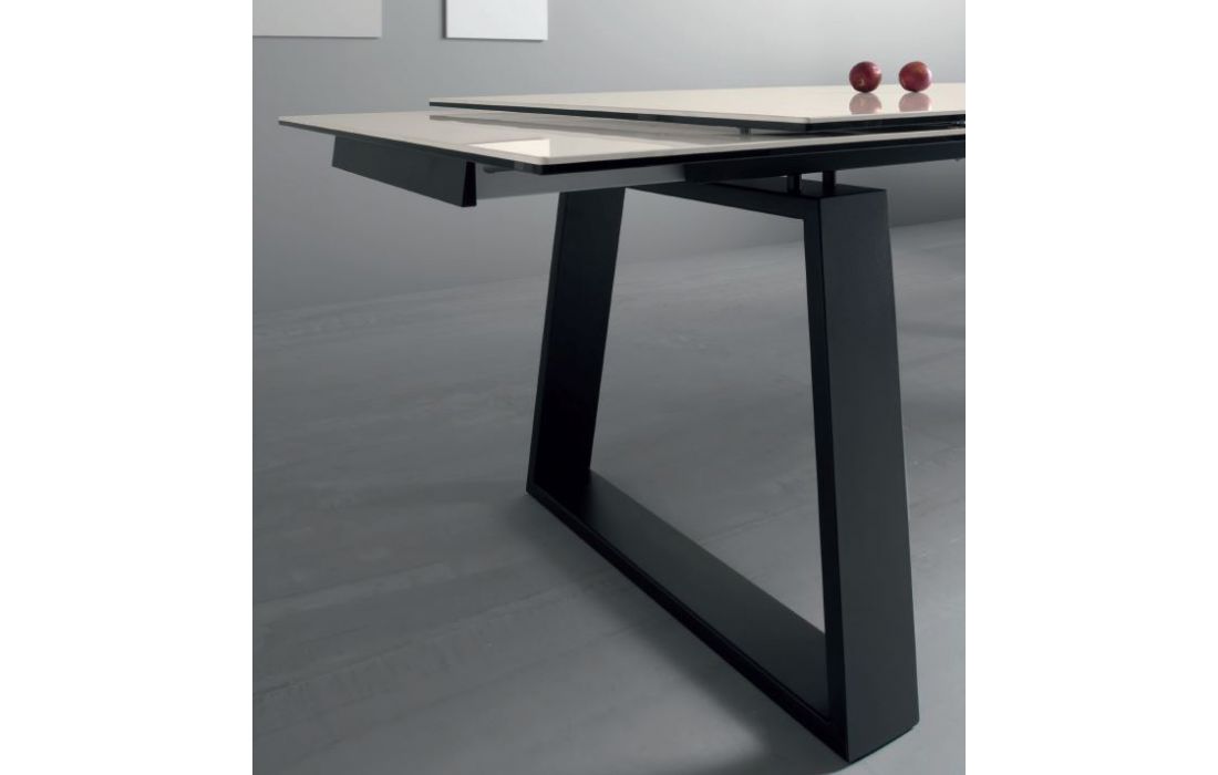 Estrutura extensível com 2 extensões com 50cm cada. Tampo em cerâmica (5mm ou 3mm) sobre um vidro cinza esfumaçado (8mm).