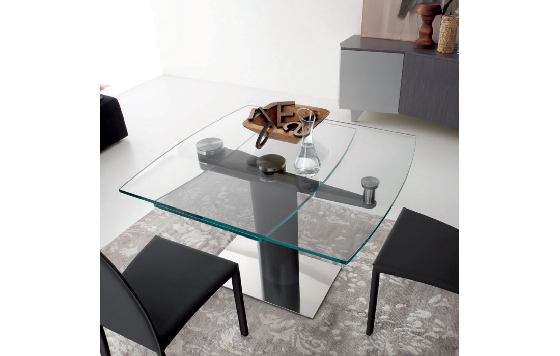 Mesa extensível com 1 extensão com base retangular em aço e moldura central elíptica em metal cinza, com mecanismo em alumínio de lado para rotação da extensão com tampo em vidro transparente.