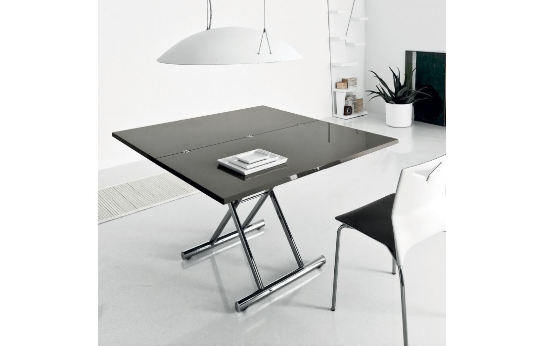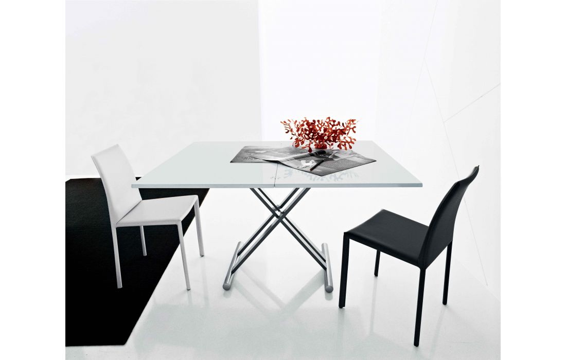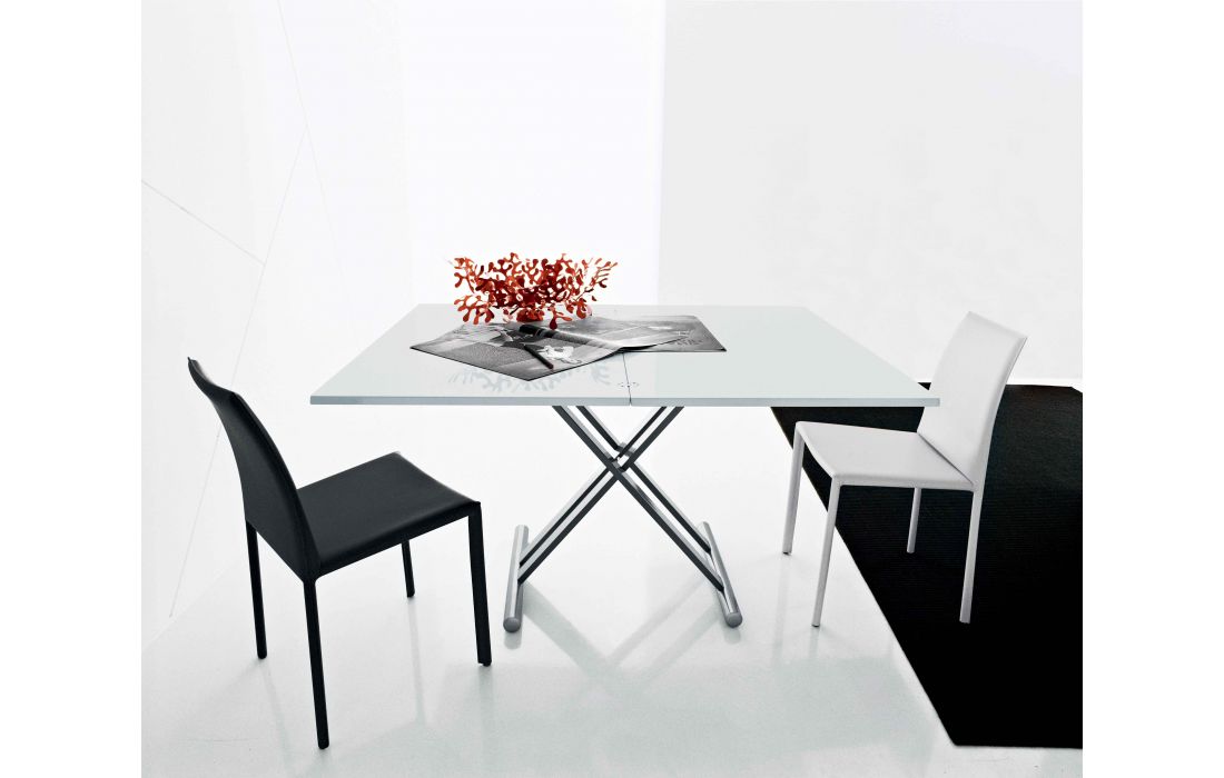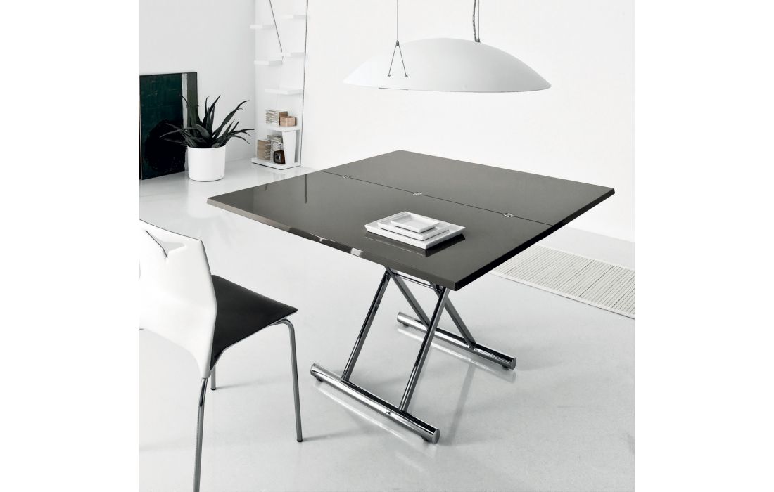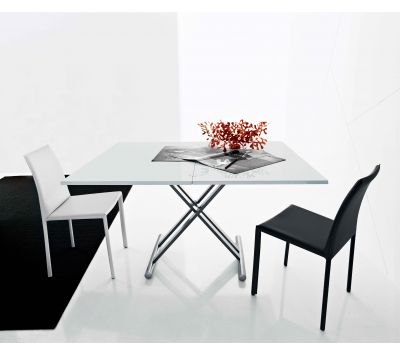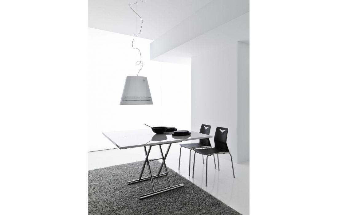Mesa retangular com base cromada e tampo em MDF branco ou cinza lacado brilho. Mesa pode- se transformar em mesa de centro ou jantar.