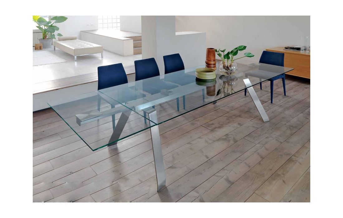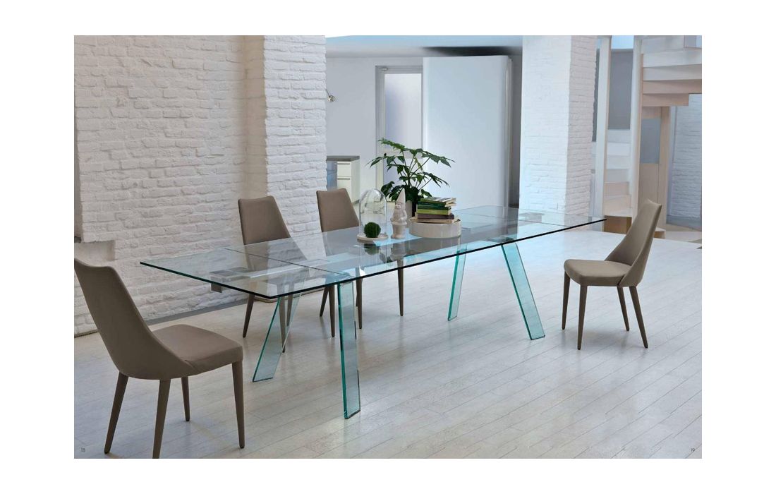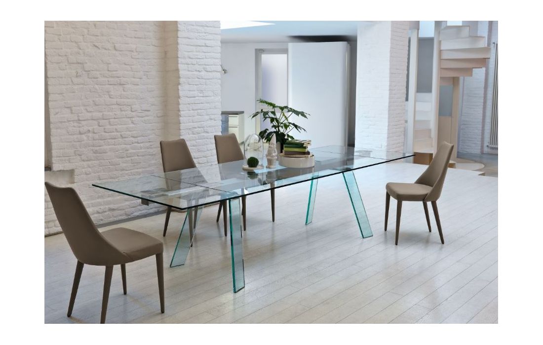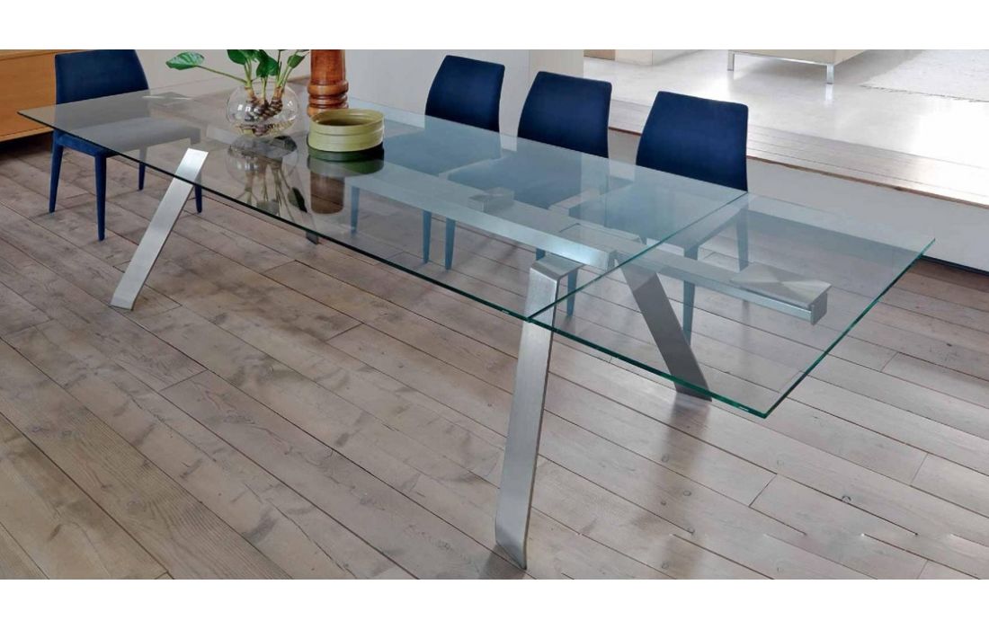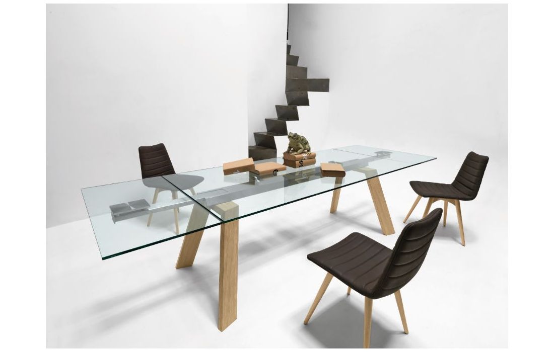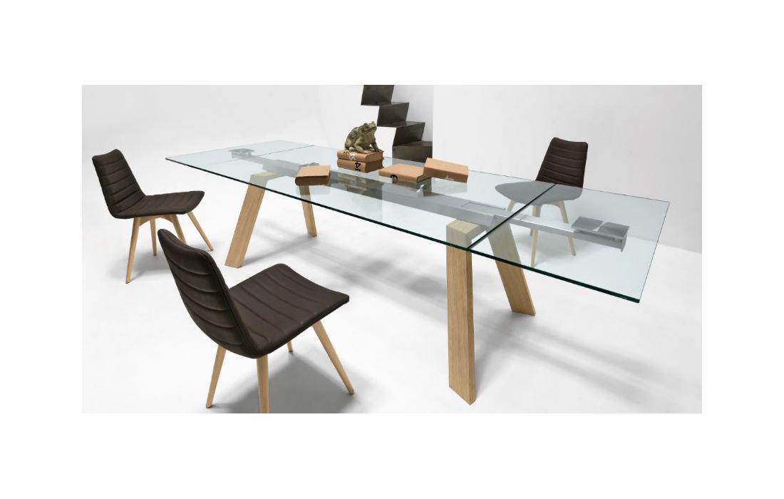 Mesa fixa com tampo de vidro transparente e pés em aço branco, aço satinado, carvalho natural, carvalho escuro ou vidro transparente