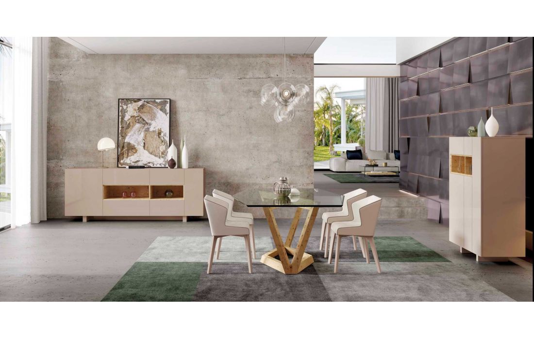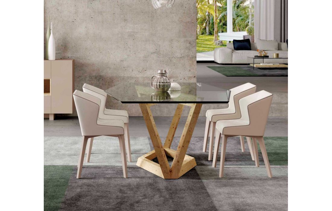 Mesa de jantar fixa feita em mdf e folha de madeira com tampo de vidro.