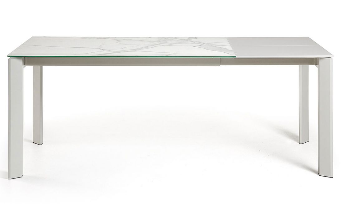 Mesa extensível com estrutura de aço pintado em epóxi com tampo de porcelana pousado sobre vidro.