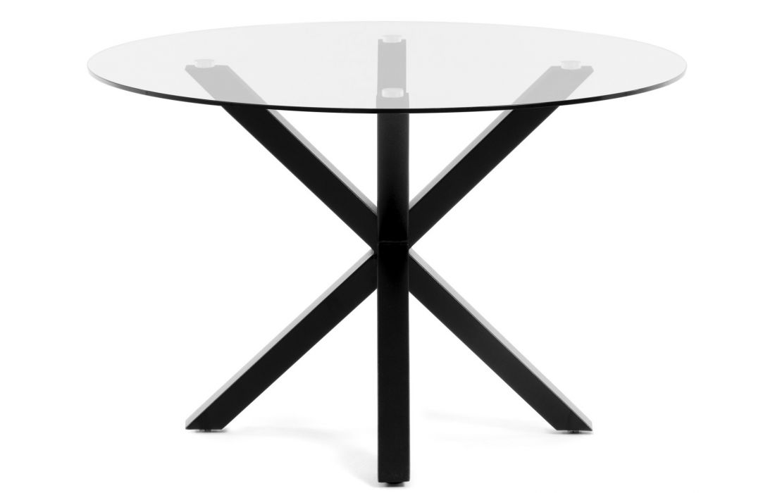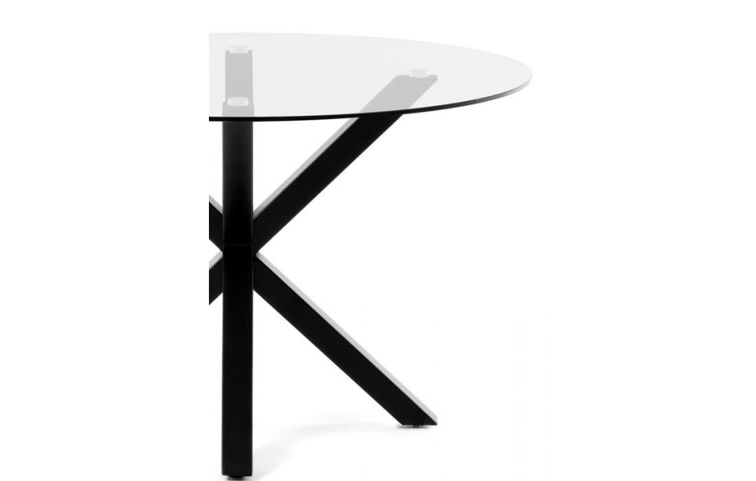Mesa redonda com tampo de vidro temperado e pernas de aço com acabamento a preto.