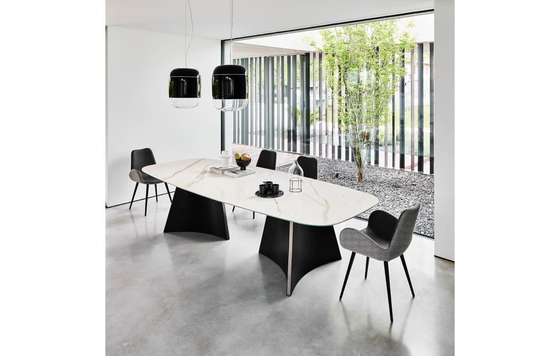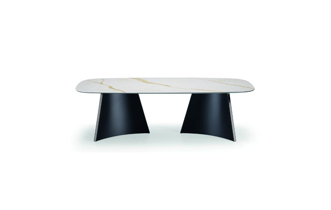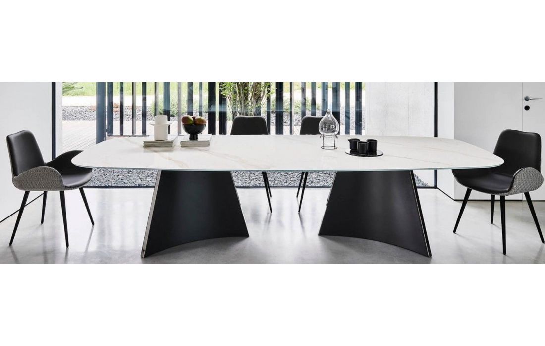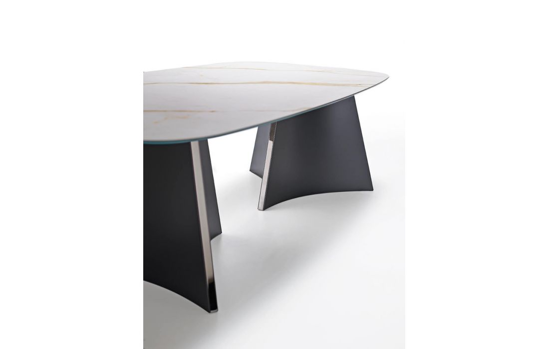 Mesa de jantar com tampo em cerâmica e base em metal, disponível nas várias cores de estrutura e acabamentos.