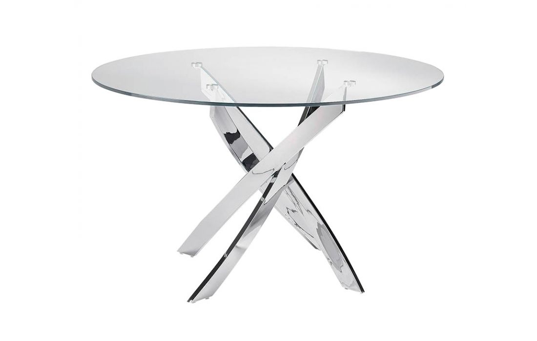 Mesa de jantar redonda com pés em aço e tampo fixo de vidro temperado com bordas polidasDestinatário :