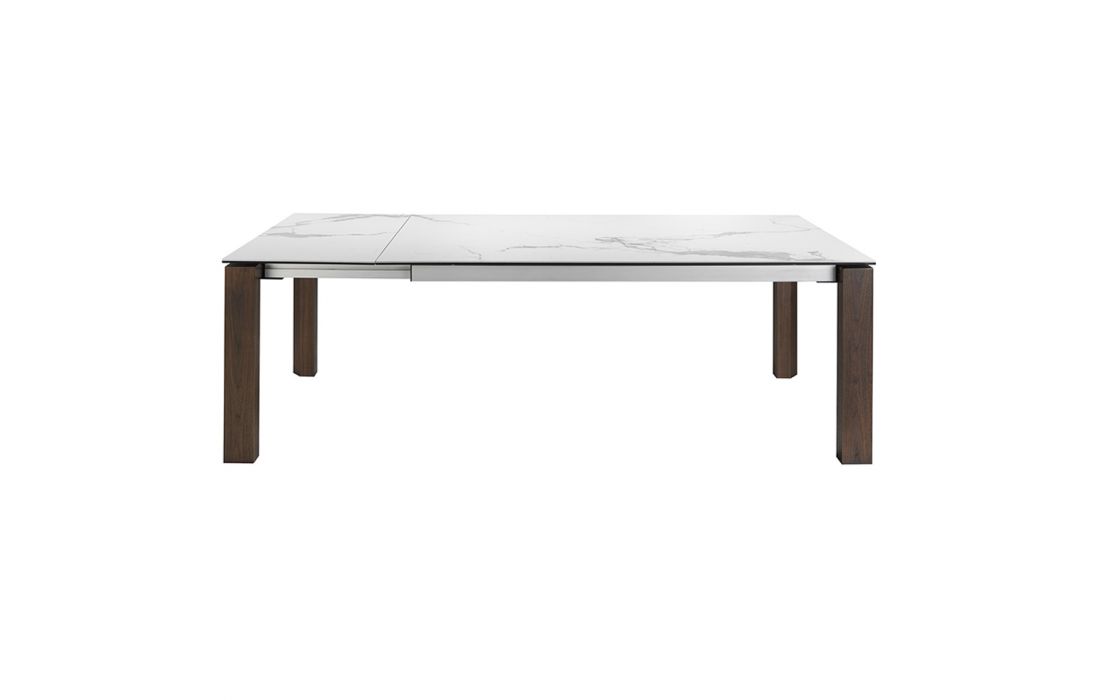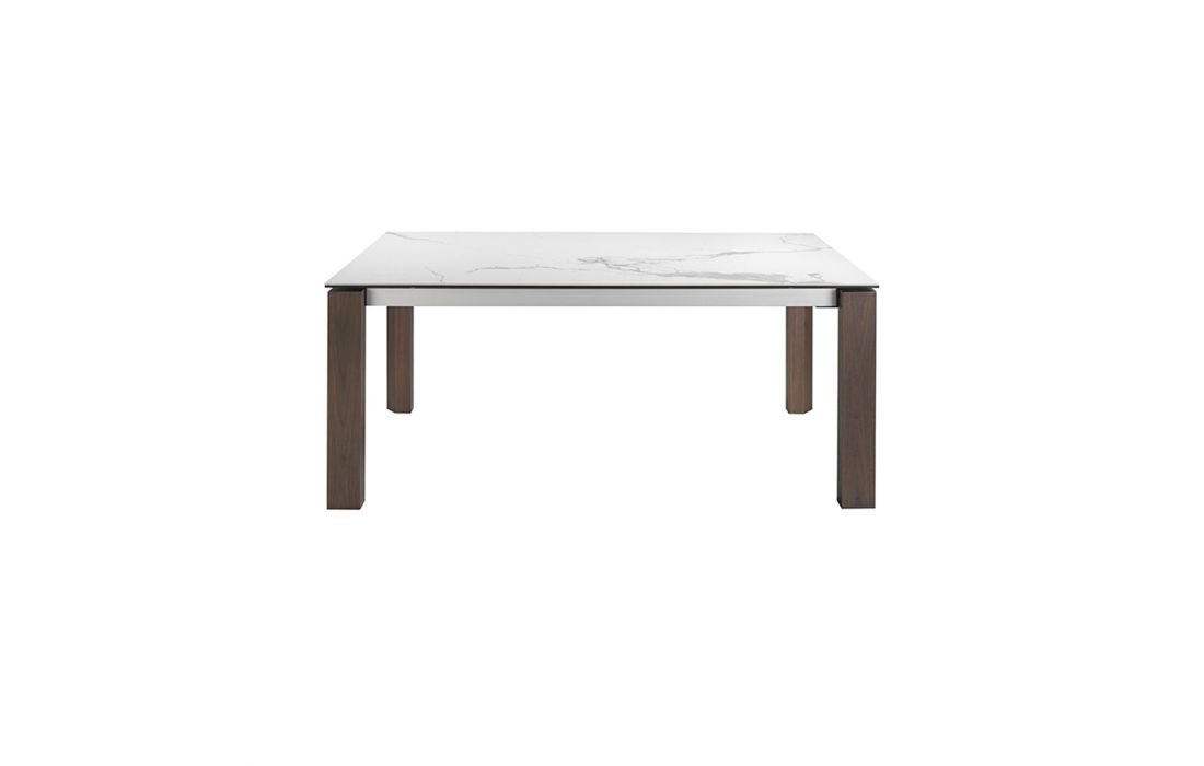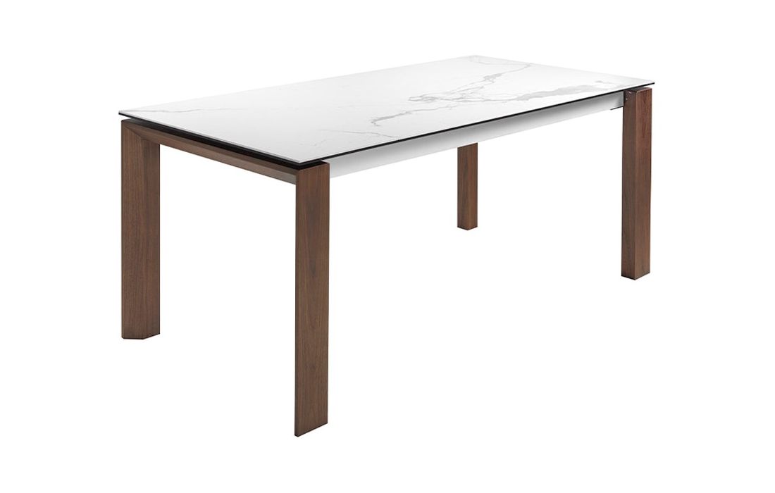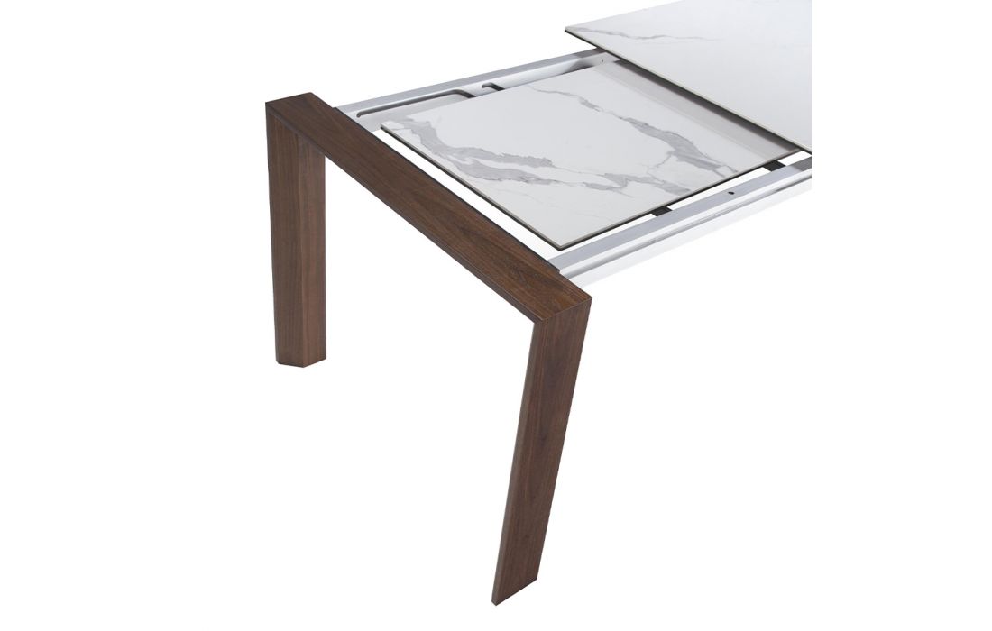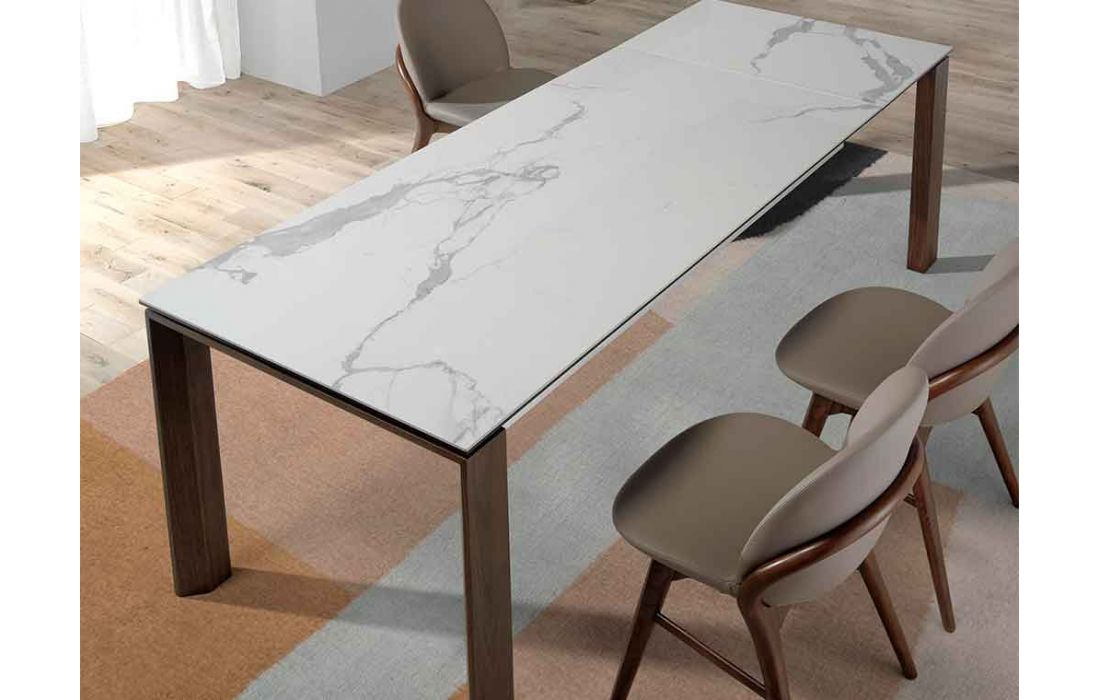 Mesa de jantar extensível retangular moderna com tampo em mármore e suas pernas de madeira folheada a nogueira naturalDestinatário :