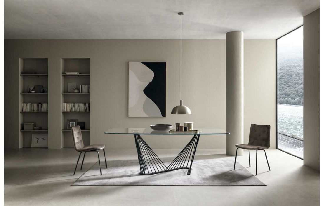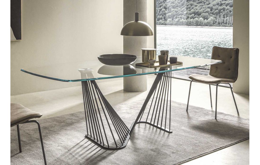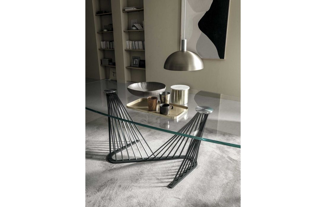 Mesa fixa com base de haste quadrada metal pintada a epóxi. Tampo em forma de barril com borda chanfrada em vidro transparente , ou em ceramica