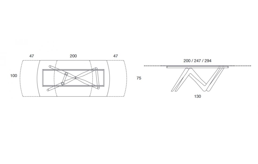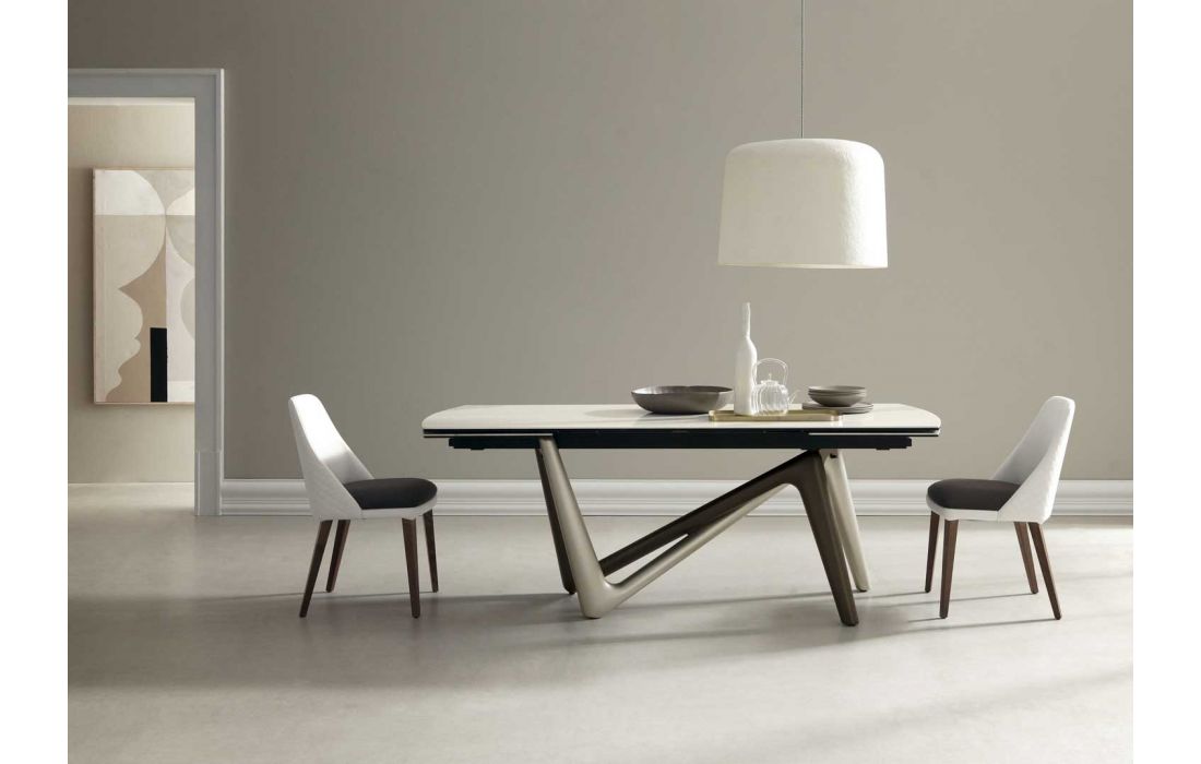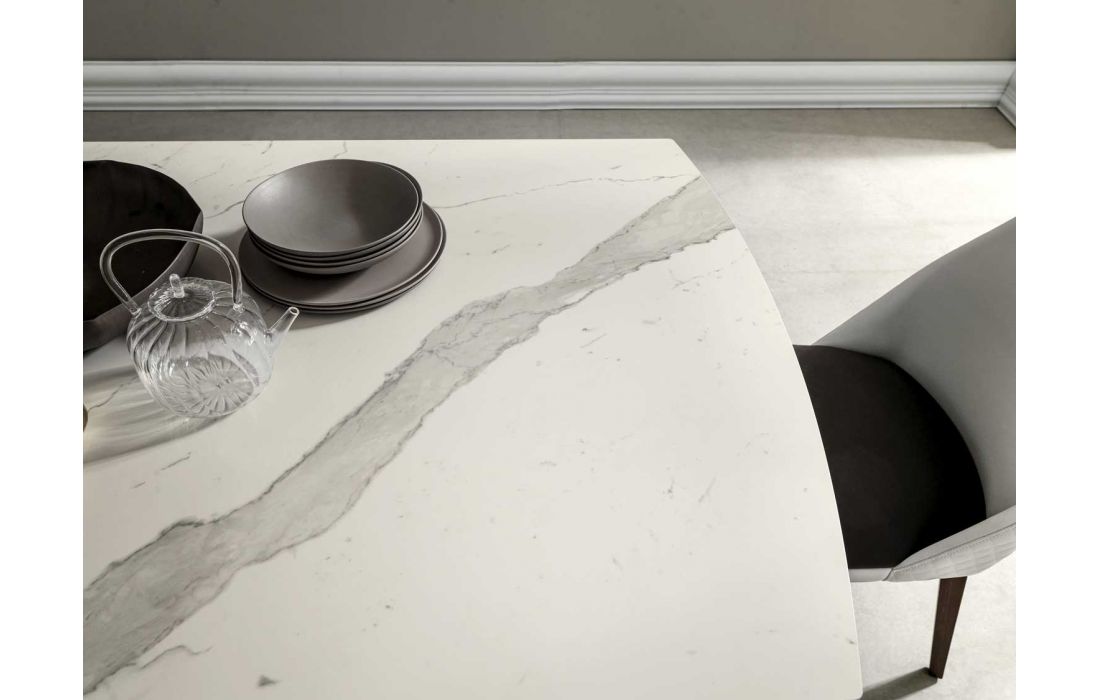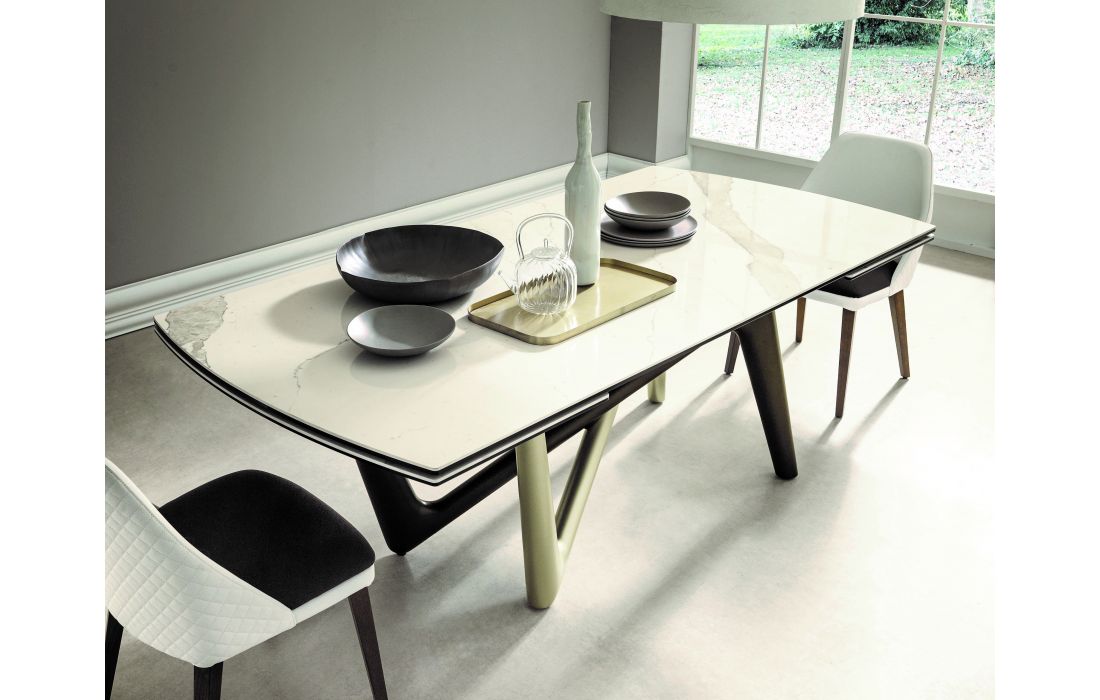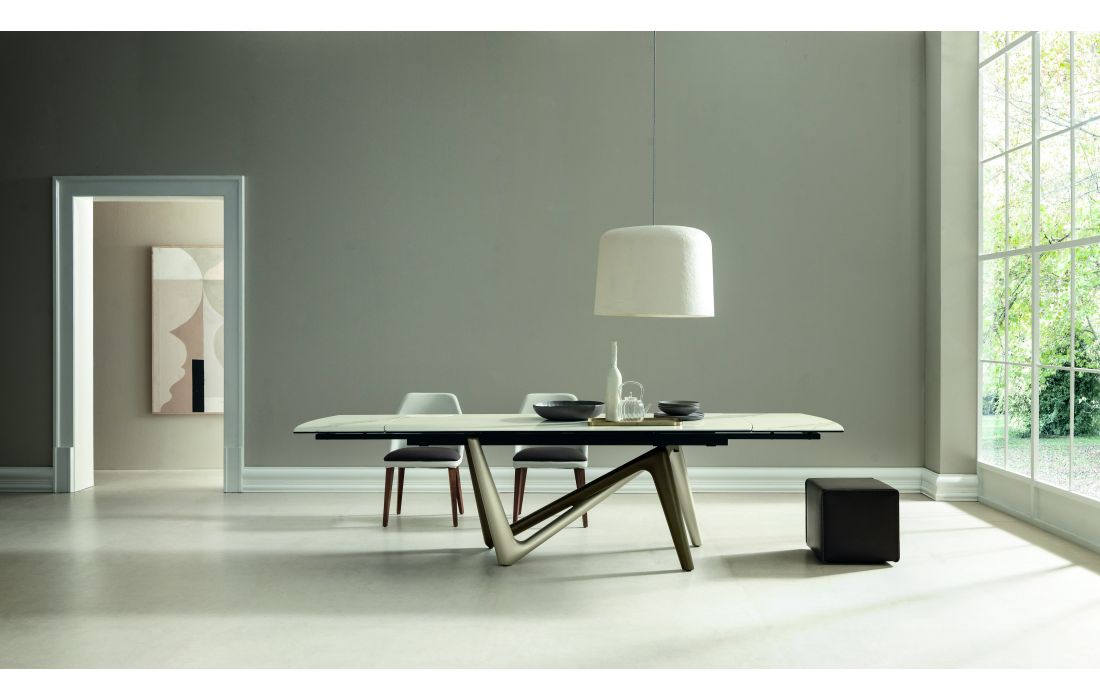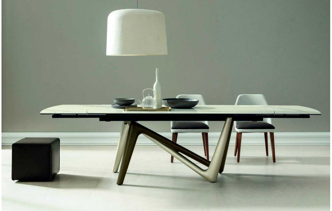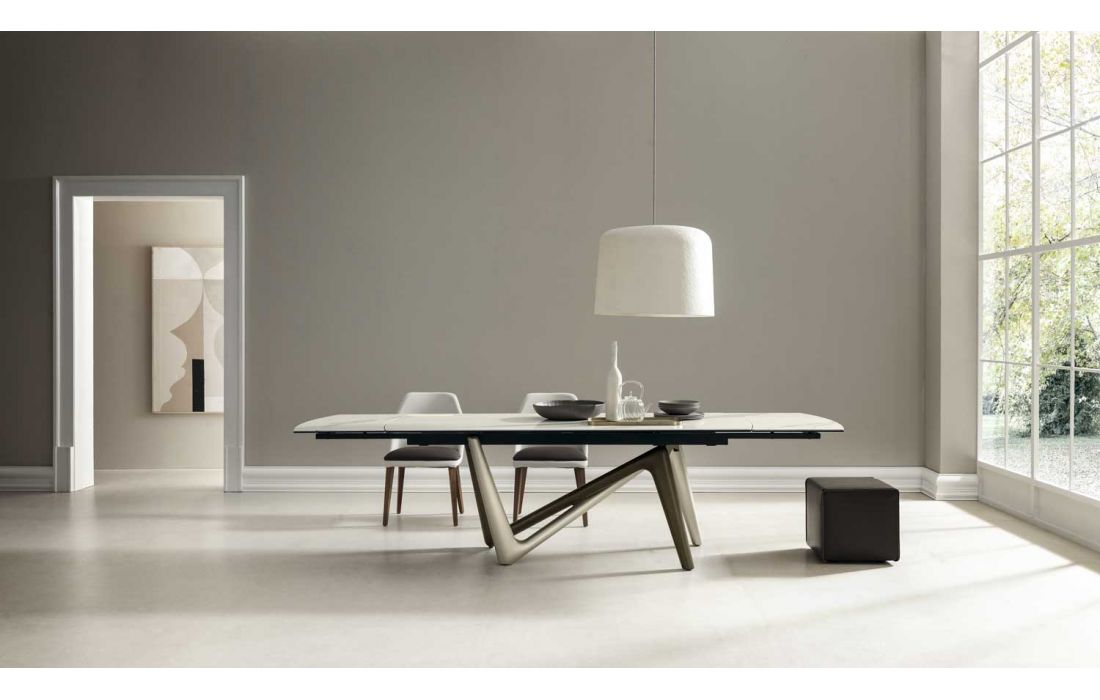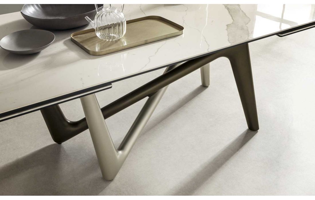 Mesa extensível com pés em poliuretano pintado. Estrutura extensível em alumínio. Tampo em forma de barril com 2 extensões em cerâmica.