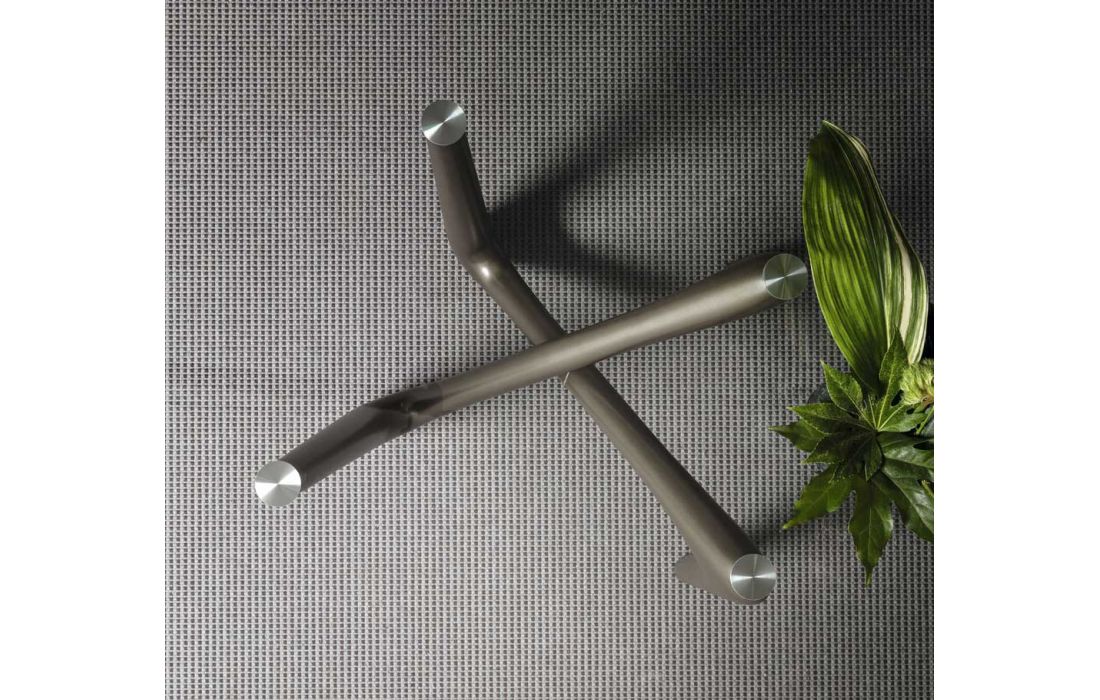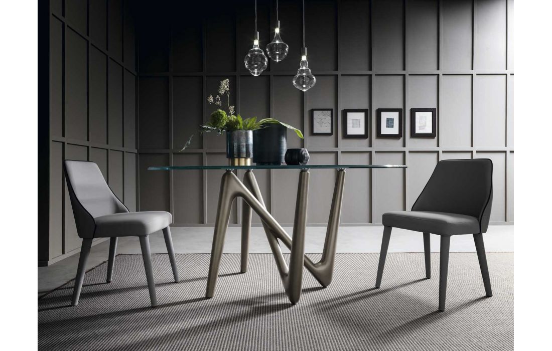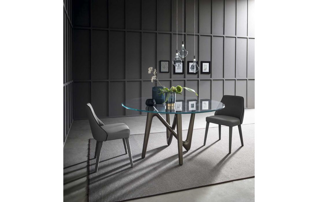 Mesa fixa com pés em poliuretano rígido pintado. Tampo de vidro redondo transparente temperado com borda chanfrado ou cerâmico.